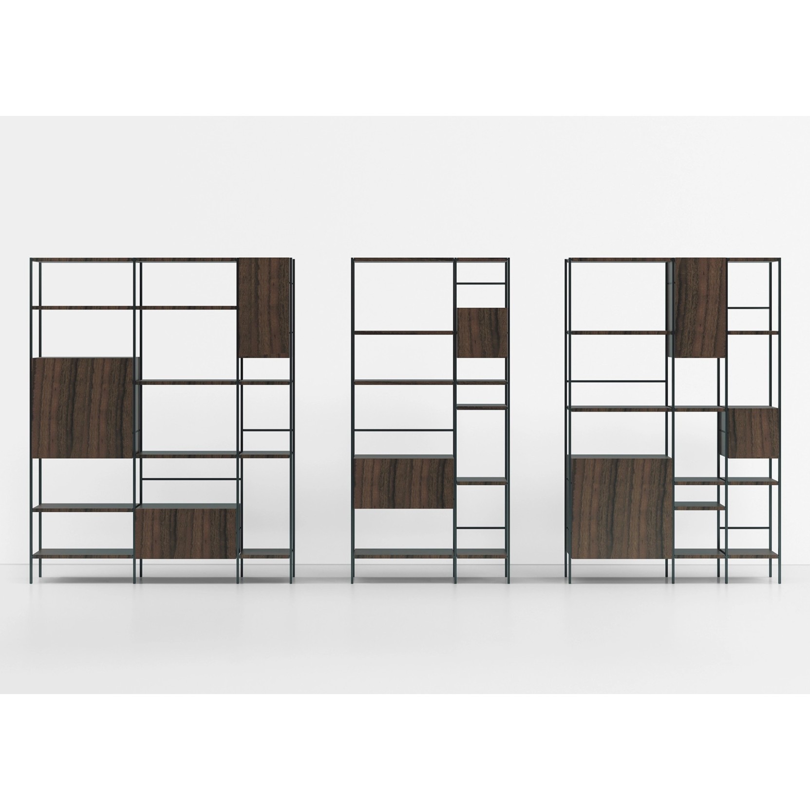The satin-finished steel frame in black nickel lacquer contrasts with the dark-stained walnut shelves and storage units, striking a balance between the lightness of the metal and the solidity of the wooden volumes. The distinctive round fastening joints interrupt the linearity of the design while allowing the components to be inserted, removed, or rearranged with ease, turning the bookcase into a dynamic and ever-adaptable system. Thanks to this flexibility, Outline can be positioned against a wall or placed at the center of a room, serving both as a functional container and a visual statement piece. The refined combination of materials—dark-stained walnut (ES59) for shelves and storage units and satin steel finished in black nickel lacquer (MT05) for the frame—enhances the sophisticated character of a furnishing solution that blends artisanal care with a contemporary language.