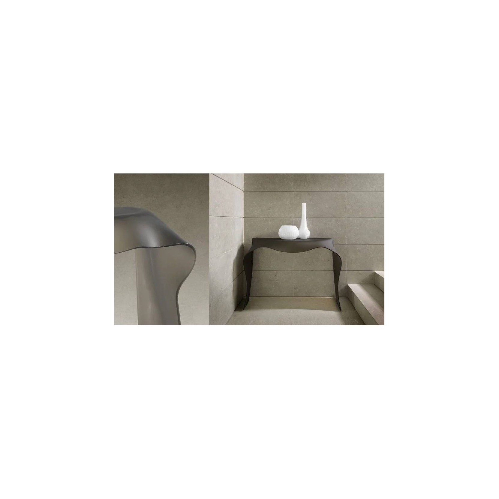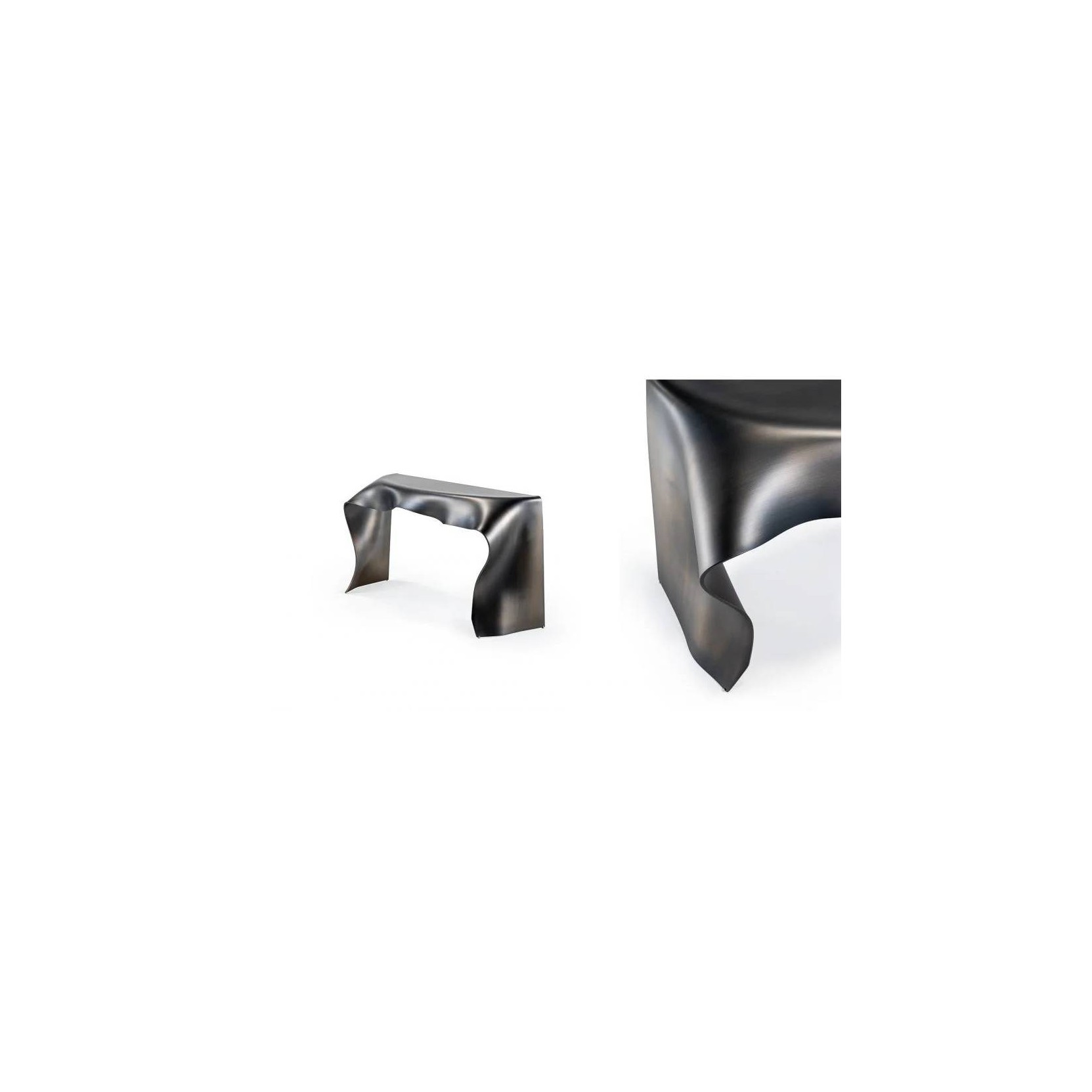 Console in curved extraclear, bronze or smoke-grey glass with external etched finish