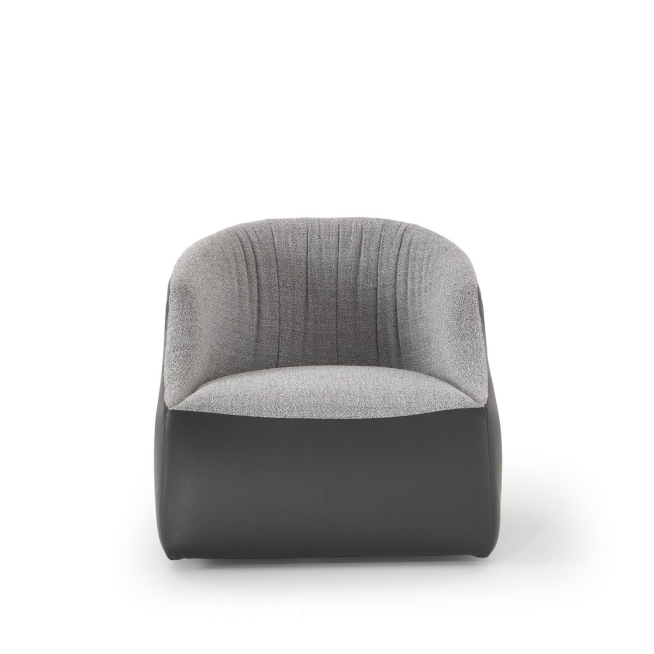 This compact armchair was conceived with the idea of reinterpreting traditional taste through softer lines and refined design, fully embodying the style of i 4 Mariani. Designed to create a cozy domestic retreat, it combines small dimensions with plush padding that invites relaxation and conversation. The structure is made of a tubular steel frame fixed to a moulded poplar plywood panel, while the seat features a suspension system with elastic belts in polypropylene and natural latex. Both frames are embedded in cold-formed polyurethane foam, moulded in specific shapes and covered with polyester wadding. The polyurethane foam complies with the Italian Classe 1IM fire resistance regulations and can be adapted to other international standards upon request. The base is fitted with four black PVC feet, with an optional steel swivel base available. Upholstery is offered in fabric or leather, with non-removable covers to preserve the armchair’s integrity and essential aesthetic.