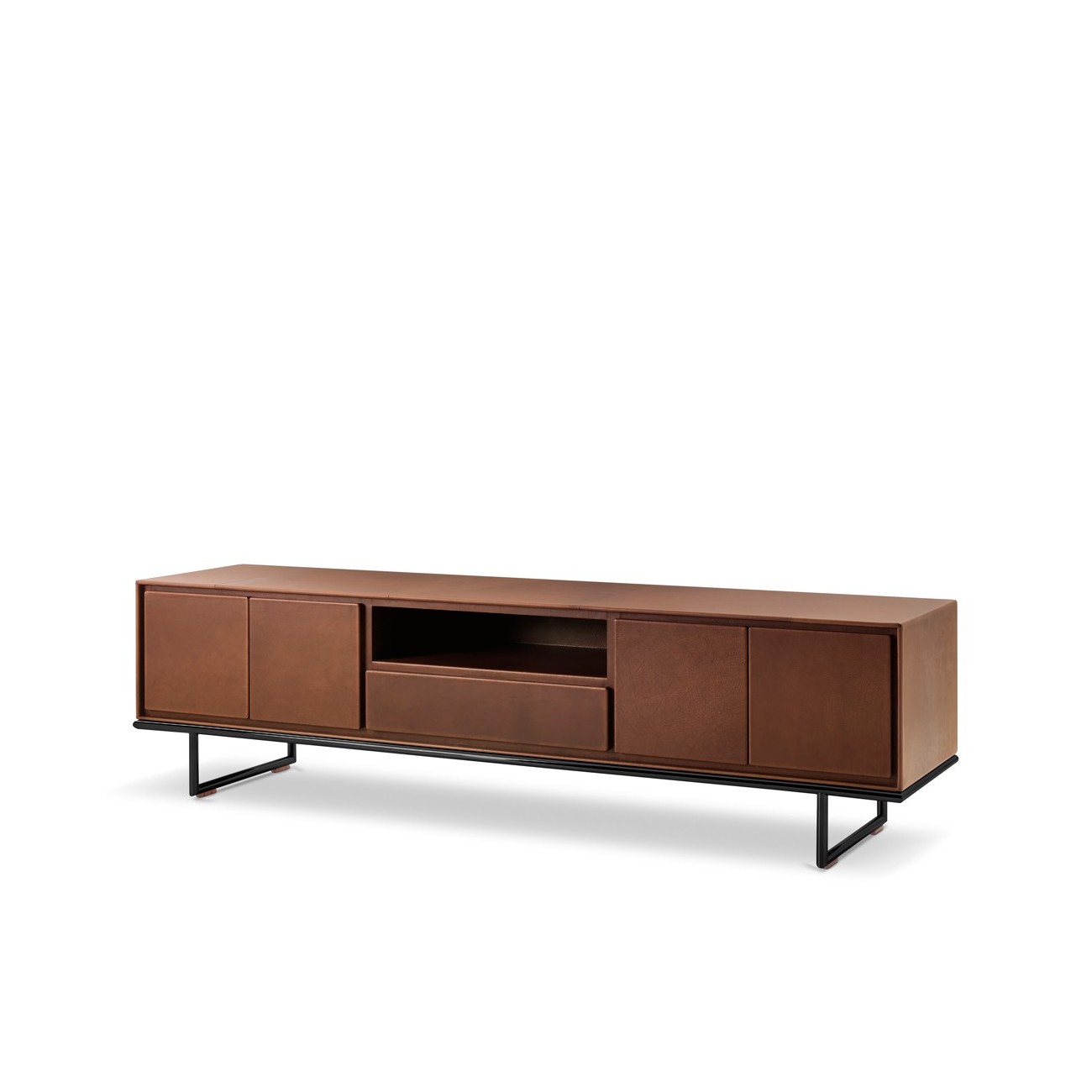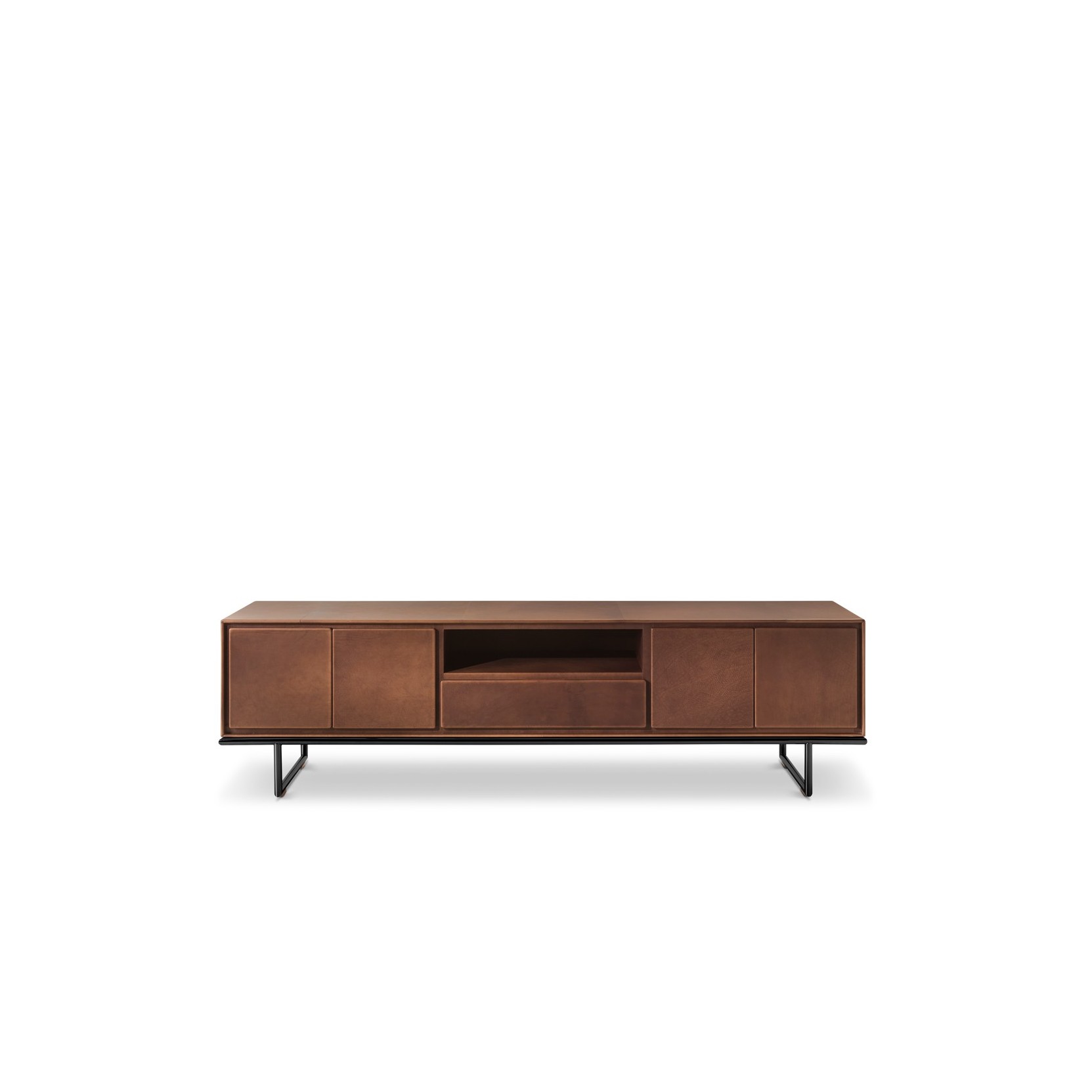 La struttura dei contenitori Slick è realizzata in multistrato di betulla curvato spesso 18 millimetri, interamente rivestito in cuoio pieno fiore di 1,6 millimetri di spessore, applicato con una tecnica che prevede piegature a 90 gradi sui bordi e fissaggio con adesivo ad alta tenuta. La fessura perimetrale, profonda 1,5 centimetri e alta 2 centimetri, funge da maniglia ergonomica ed è rinforzata internamente con una guida in alluminio satinato per garantire durabilità. Le basi sono disponibili in due versioni: un telaio basso in profili metallici cromati con sezione a L di 4 centimetri per lato e altezza di 5 centimetri, oppure piedini alti in tubolari d’acciaio verniciato dal diametro di 3 centimetri e altezza di 25 centimetri, completati da terminali in gomma antiscivolo. Le dimensioni dei moduli variano dal cubo 40x40x40 centimetri agli elementi orizzontali di 120x40x60 centimetri, con possibilità di combinare fino a sei pezzi in configurazioni simmetriche o asimmetriche. Il sistema di apertura a cassetto utilizza guide laterali a scorrimento silenzioso con una capacità di carico massima di 15 chilogrammi.