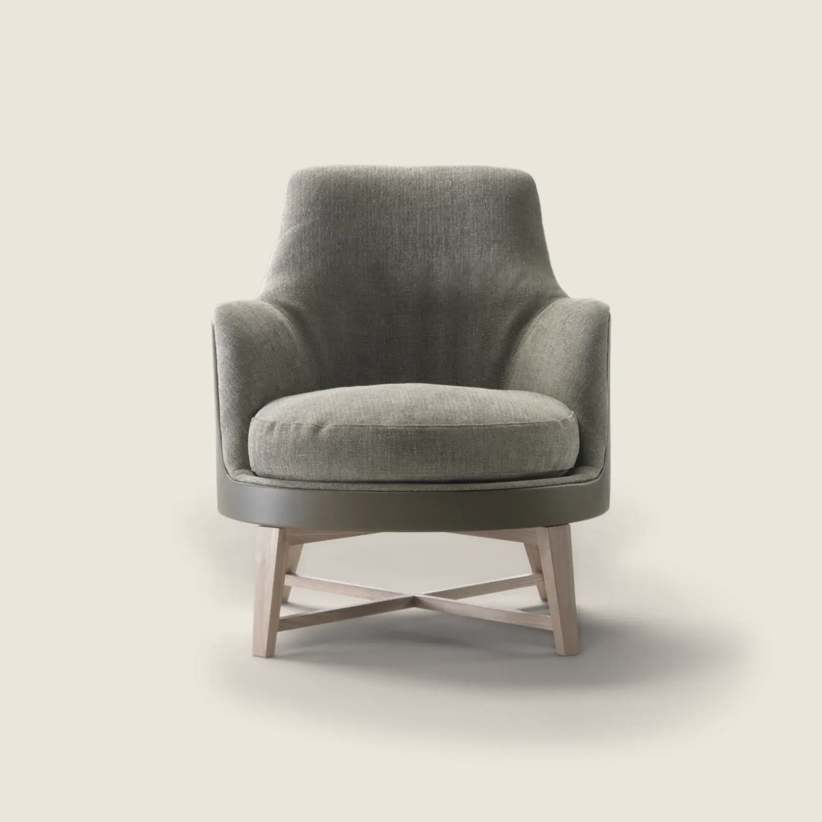 Its structure, made of structural expanded polyurethane, paired with a seat cushion filled with sterilized goose down and an indeformable insert, ensures lasting comfort and durability. The Soft version, enhanced with an additional layer of dacron and memory foam in the backrest, provides an elevated level of coziness. The refined design is completed by a base available either in solid wood, stained in various shades, or in metal with multiple finishes. The upholstery, which is non-removable, can be made of fabric or leather after checking the compatibility of the chosen material. From a technical perspective, the armchair features a sturdy frame made of rigid and molded polyurethane, with the Soft version incorporating fiber and memory foam for added softness. The seat and back cushions are filled with sterilized goose down with an indeformable core to provide optimal support, while back cushions are available upon request at an additional cost. The base options include solid wood in walnut, ash, or oak, or metal finishes such as satin, chrome, burnished, black chrome, glossy anthracite, or matte titanium 710, all resting on thermoplastic material glides.