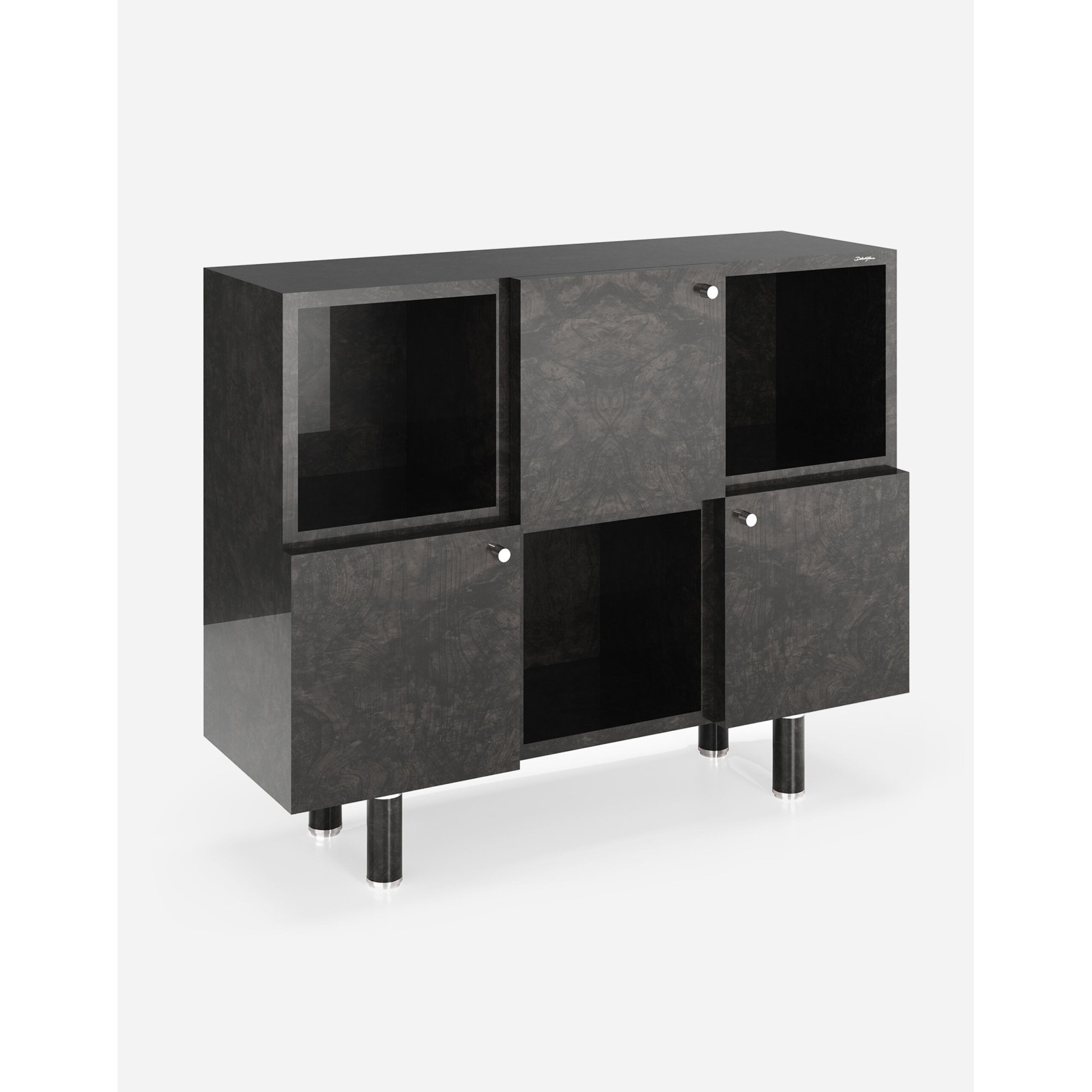 The Enea storage cabinet by Dolce&Gabbana combines visual boldness with multifunctional use. Designed to stand freely in the room, its finely decorated back makes it perfect as a divider, while alternating open shelves and closed compartments create an elegant volumetric composition. Developed through a unique design-first approach that breaks away from traditional production logic, each detail is meticulously crafted—from the visual balance of forms to the manual shaping of corners and edges, and a meticulous polishing process that ensures the graphics retain their brilliance over time. Removable shelves echo the cabinet’s overall aesthetic with coordinated graphic patterns, while metallic details and steel feet complement the design. Solid oak wood accents with a glossy finish add warmth and a nod to Italian craftsmanship. Made in Italy.