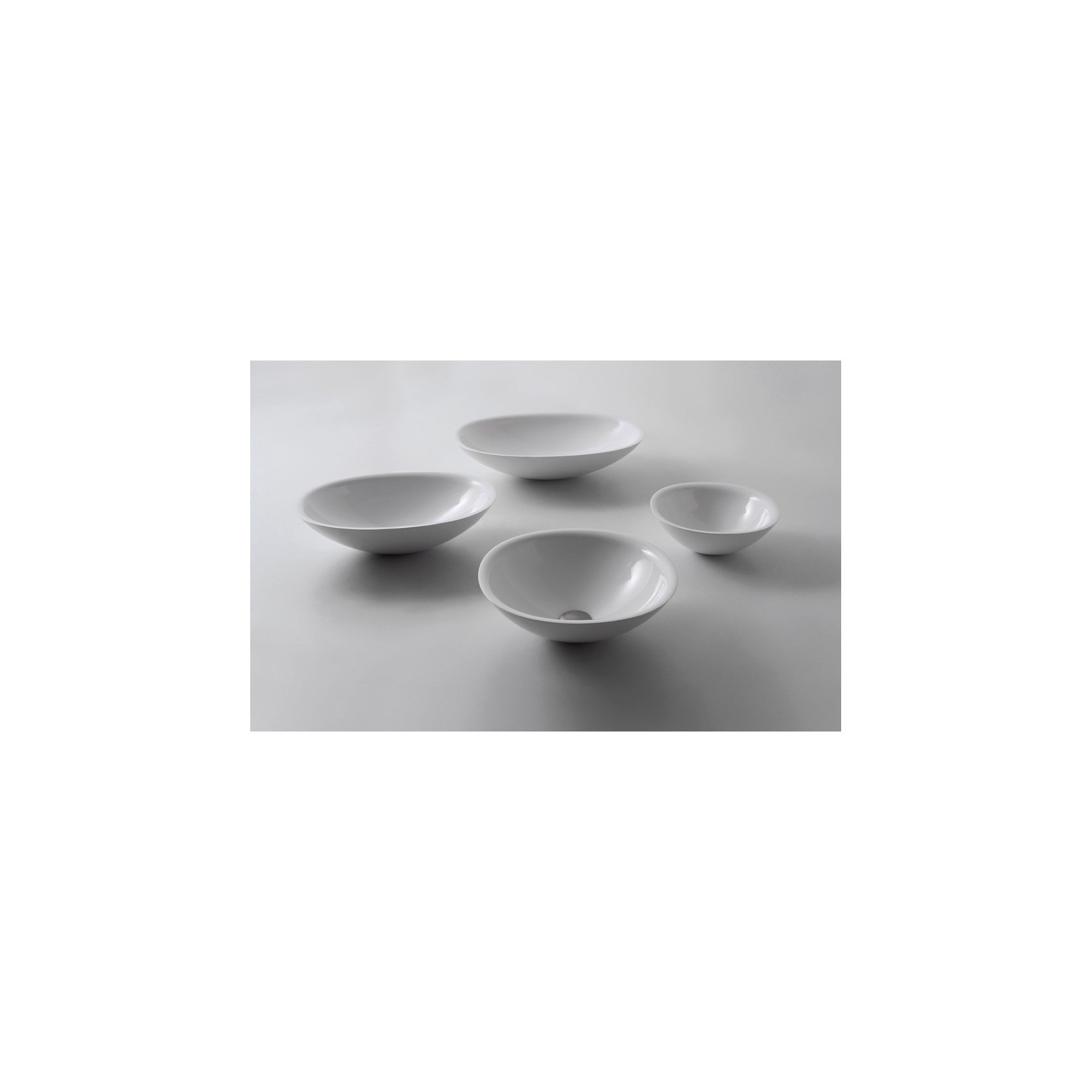 Strong sloping edges and rounded sides for a wash basins that play on the round and oval shapes and volumes that taper at the base. A versatile series that can be placed in any type of setting.