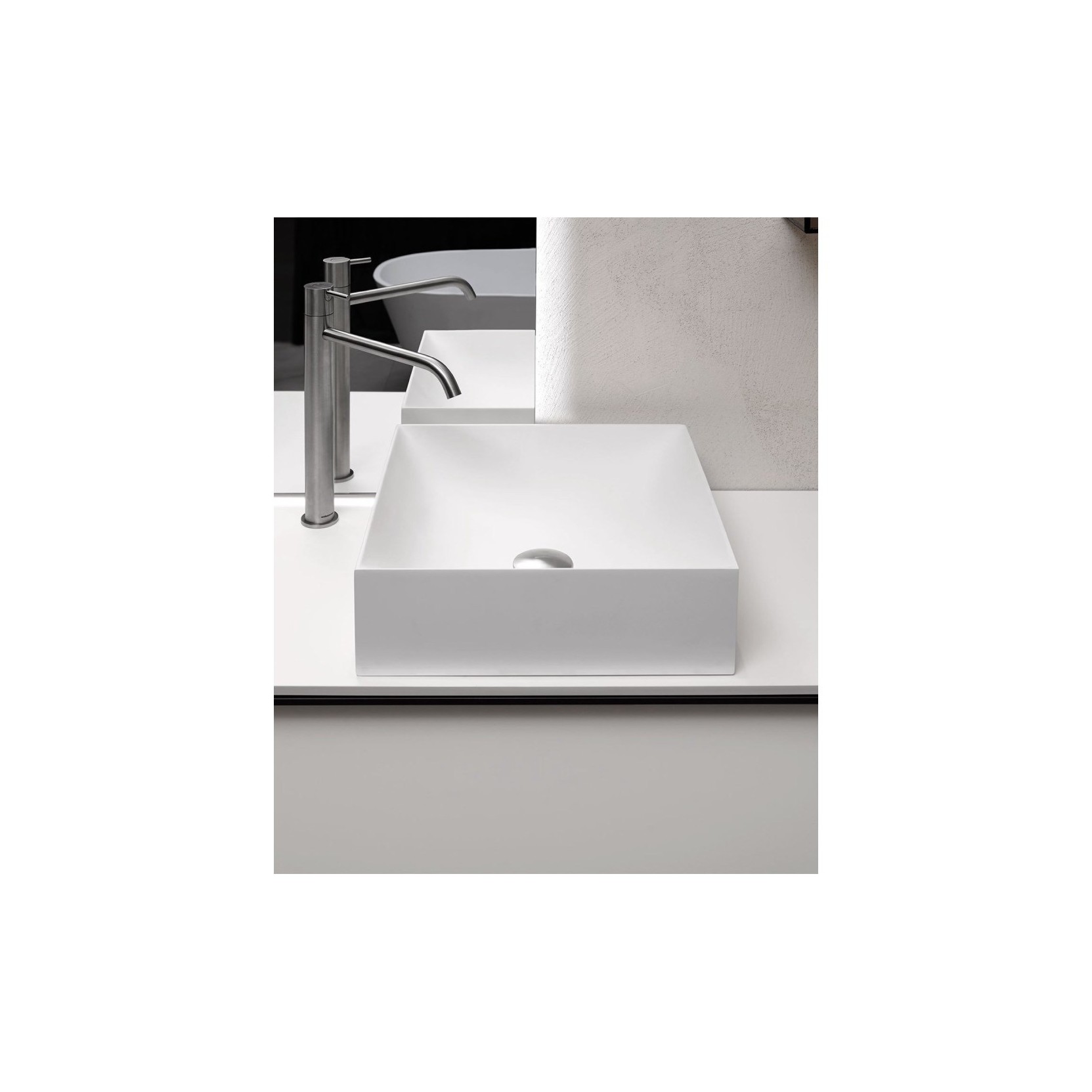 The sharp lines and the rigorous external geometrical shapes are softened with the fluidness of the internal shape of the basin. Stratos is a mixture of two souls integrated in an elegant and harmonious manner. It’s rigid perimeter expresses safety and solidity protecting an organic interior that extends without interruption.