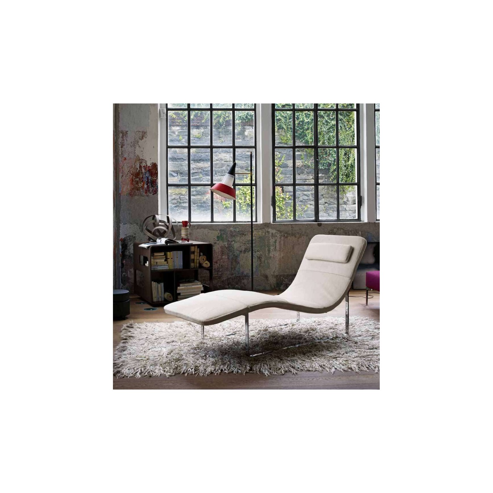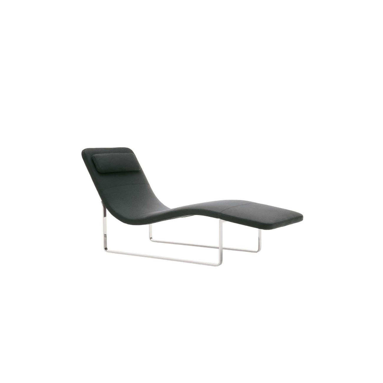 Landscape is an eccentric chaise longue, with a minimal design that consists of few simple lines that invite to relax and calm. Landscape has a steel structure and a cold foamed polyurethane padding and a leather or fabric cover. The supporting structure is available in bronzed nickel painted steel or in glossy chrome plated steel. The chaise longue is proposed in fixed base version or in rocker base version, or in the new '05 version with an elegant armrest. Landscape is equipped with a comfy headrest pillow covered with leather or fabric, in which are inserted little high potential magnets which could be dangerous for pace-make bearers and could damage magnetic cards, credit cards or other electronic device.
