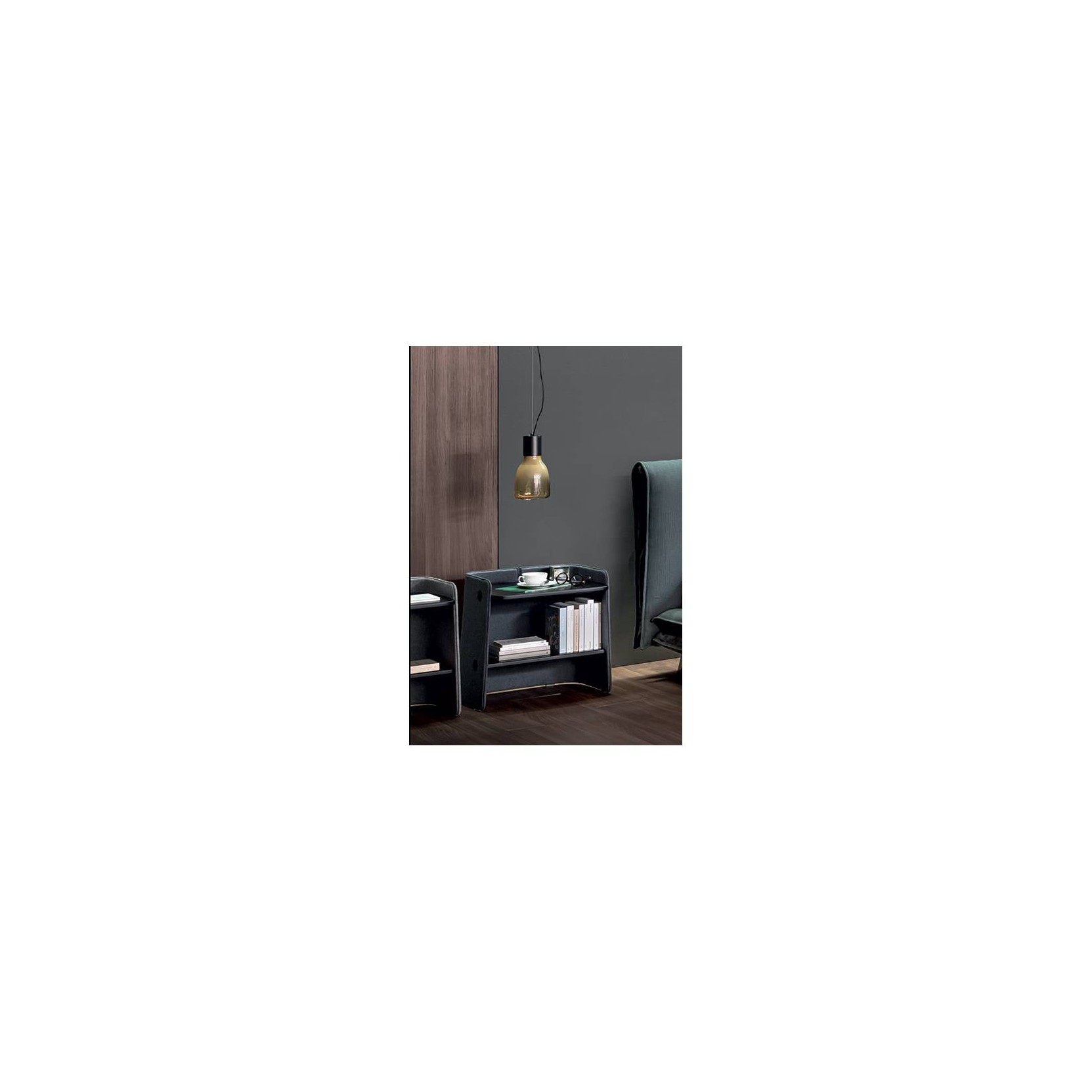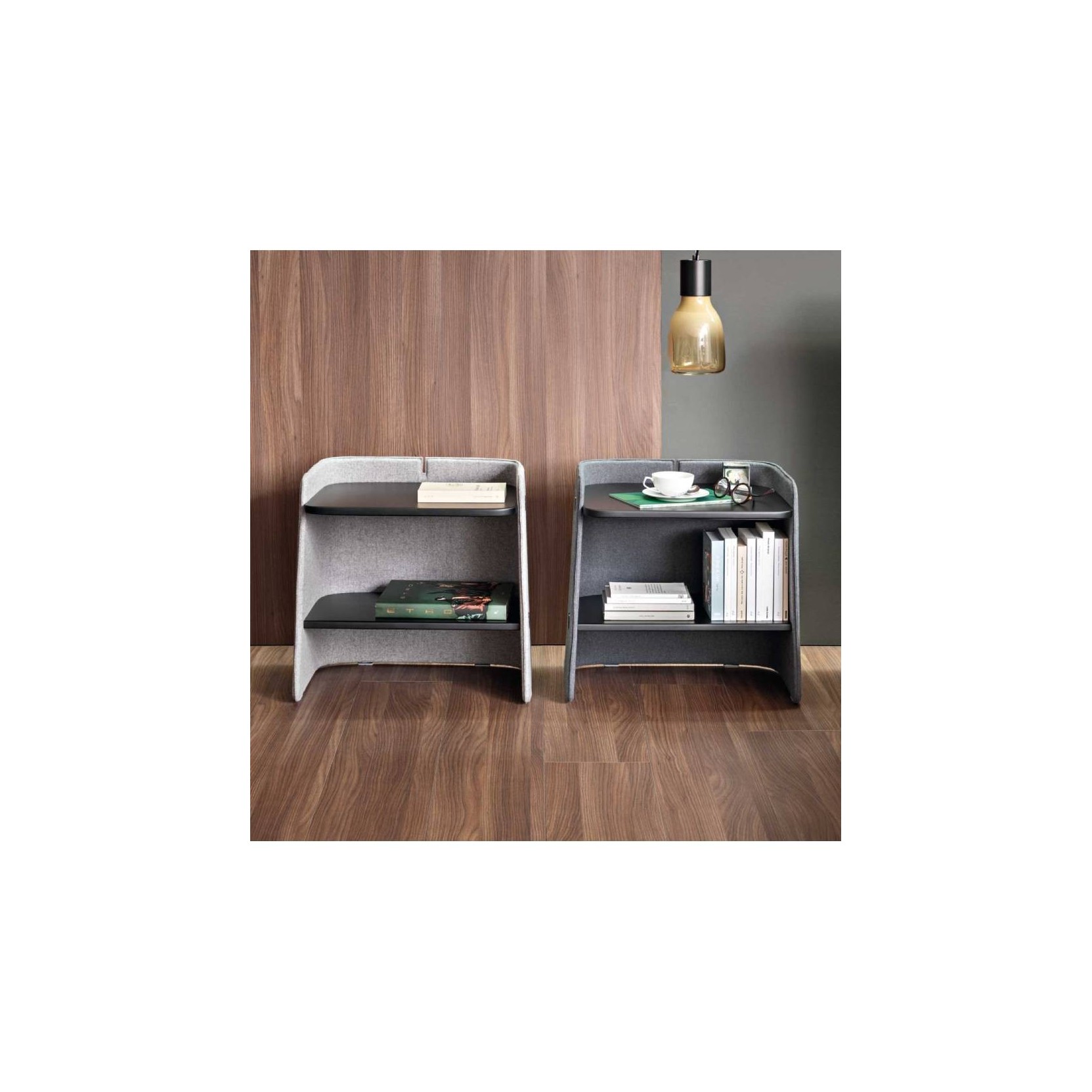 The shape of Parentesi bedside table brings to mind a niche, a parenthesis that encloses within it two wooden shelves. With an unprecedented design, Parentesi bedside table is upholstered in fabric, leather or eco-leather and it is characterised by a simple style, enhanced by four buttons that are visible at the height of the shelves and equipped with a functional fairlead, making it possible to place a lamp or another electronic device on the bedside table. Parentesi furnishes the sleeping area in an original and creative way, ensuring the utmost functionality and consistency of the design.