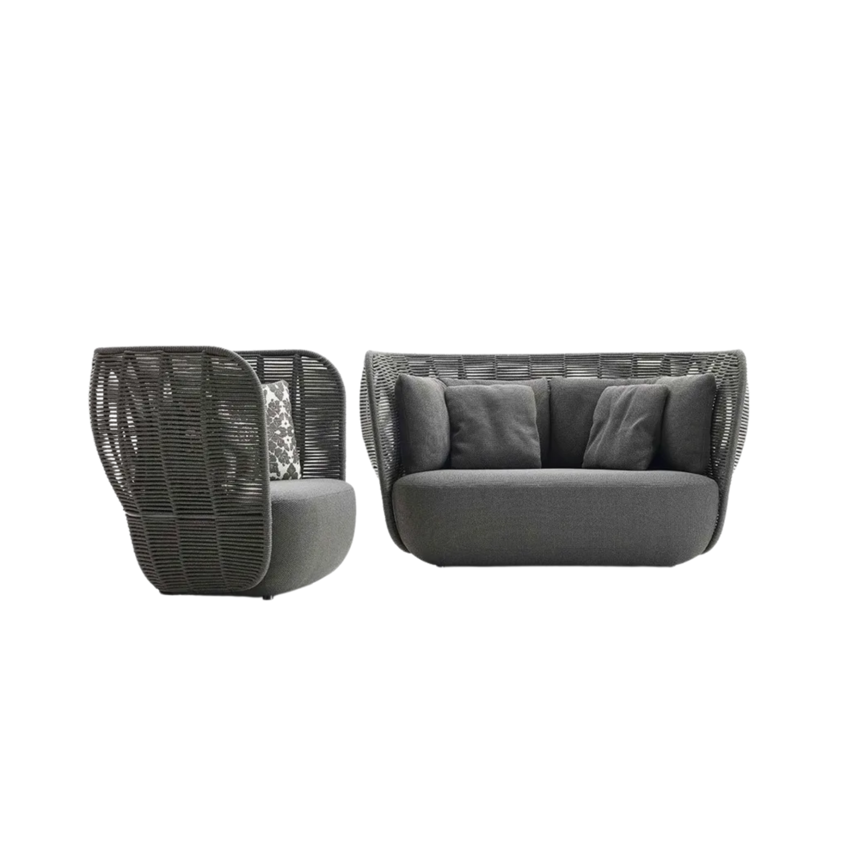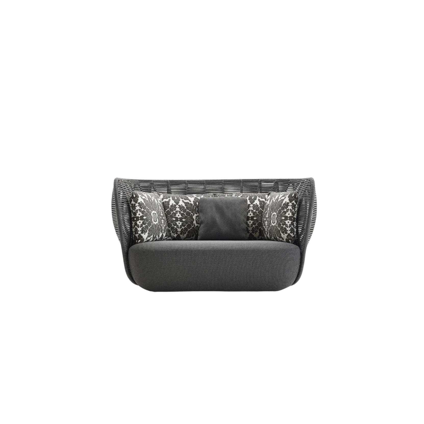 The Bay collection represents a sculptural and monolithic expression of outdoor furniture, characterized by an intricate intertwining of enveloping shapes. These volumes are combined with upholstered seating that evokes the naturalness of rocks, accompanied by soft cushions that add a touch of elegance and comfort. The sofa is constructed with a sturdy internal aluminum frame, covered with polyurethane foam padding, and a polyester fiber cover treated to be water-resistant. The weaving is made of polypropylene fiber, while the cushions are upholstered in water-repellent fabric. Since 2019, the Bay collection has expanded with the addition of three new elements: a deep-seated sofa with cylindrical cushions, an armchair, and an ottoman, which further enhance the offer of elegance and functionality.