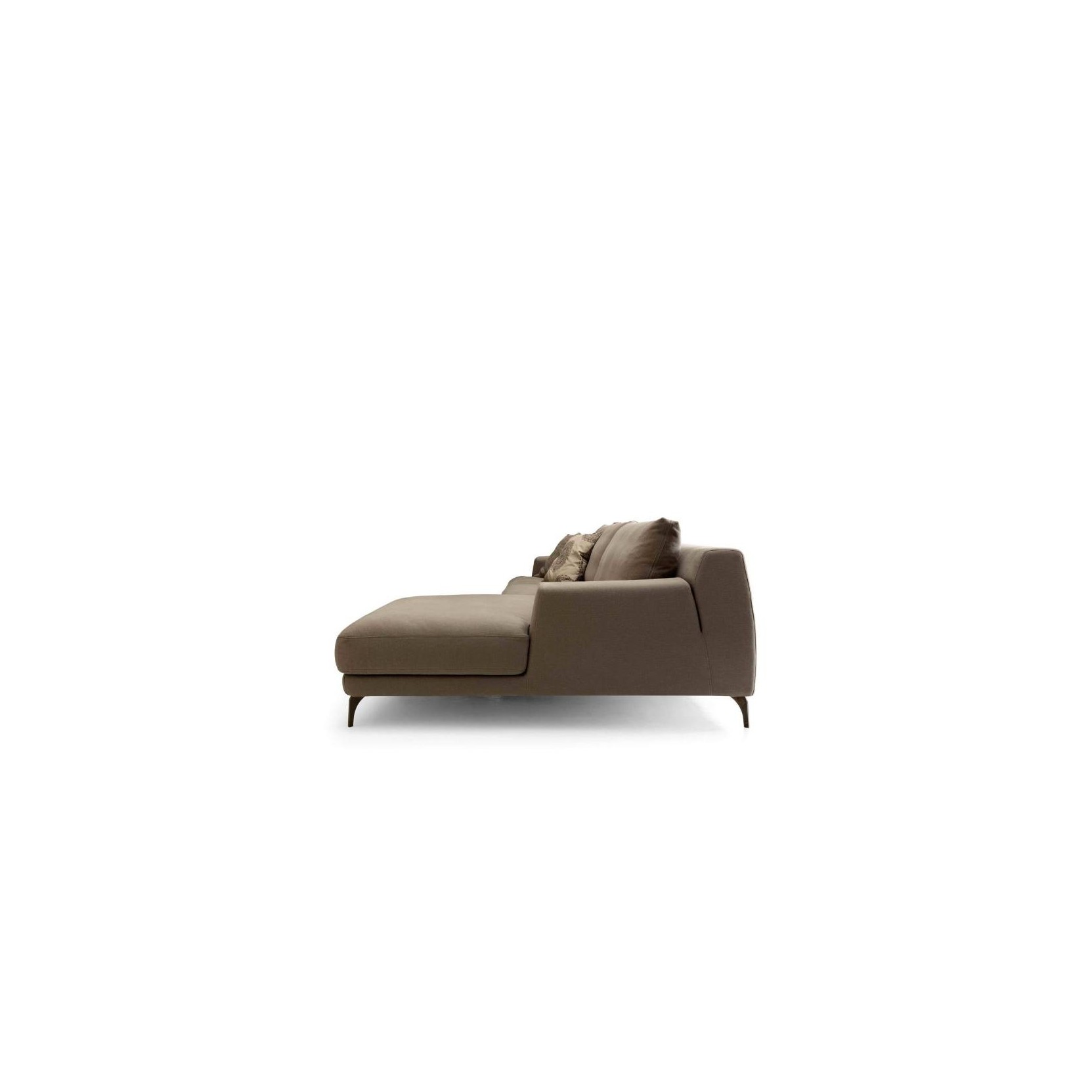 Eco-chic: a product that was initially simple is given elegant appeal, eco-chic, namely, country-rebel style. A sofa featuring meticulously crafted shapes, proportions and details in fine materials: metal feet available in three finishes (chrome, chrome nickel, namely gun metal, or oxidised iron), an eco-leather trim between the cushions in fabric (or vice versa in fabric between the cushions in leather). Everything is made complete with harmonious modern shapes and classic solutions such as the seat with a “hammer” cushion.