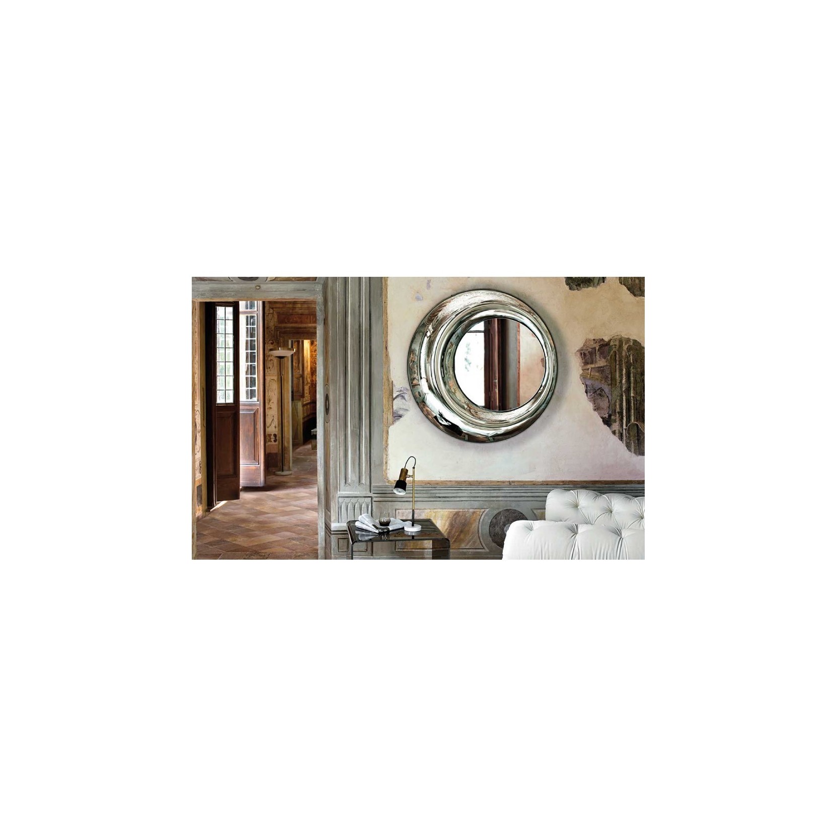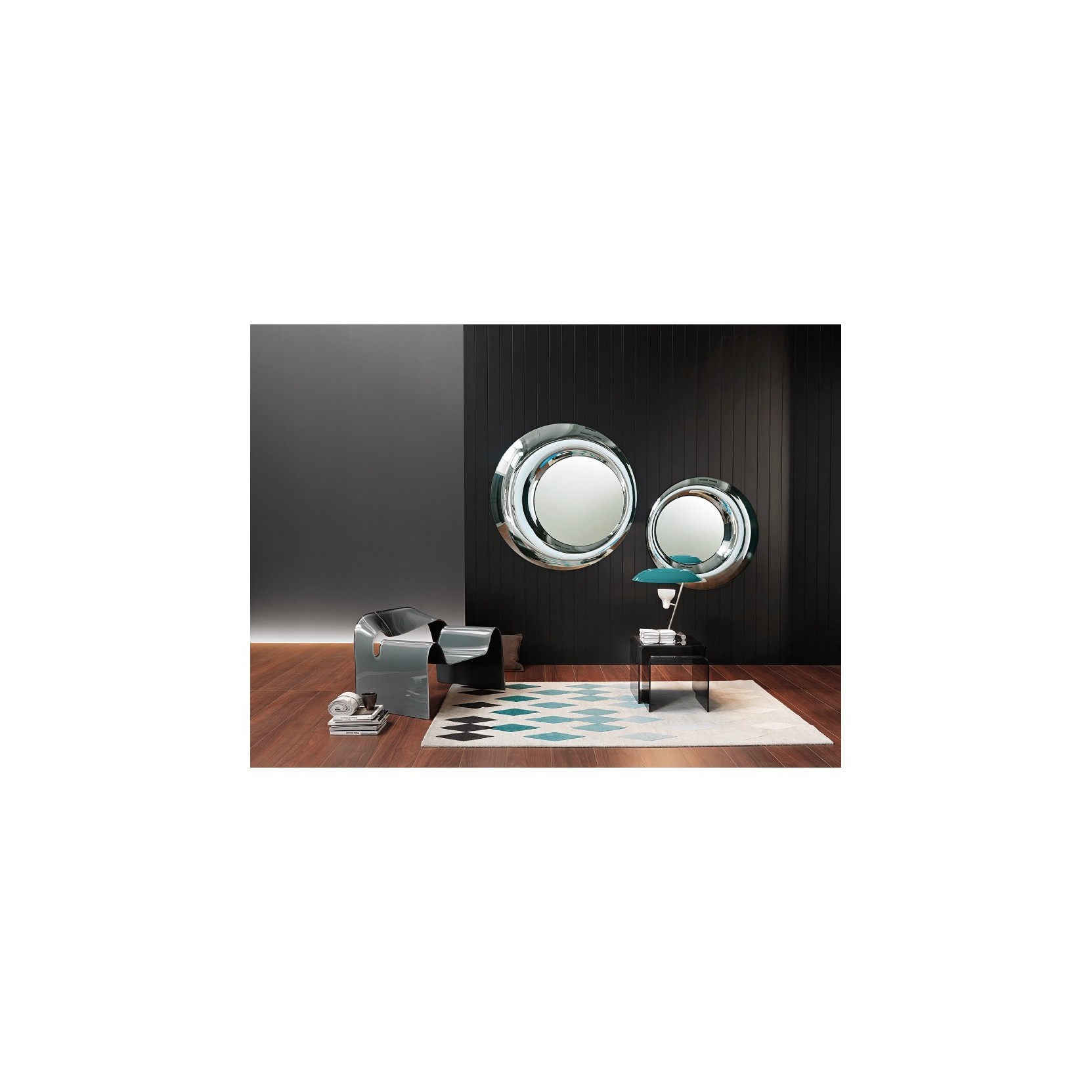 Wall mirror in 8 mm-thick fused and back-silvered glass; 5 mm-thick flat mirror. Rear mounting panel allowing hanging in various positions.