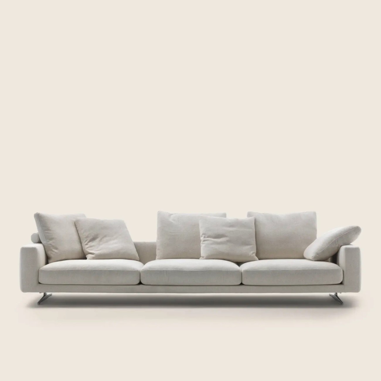 The sleek die-cast aluminum base, available in a curated palette of finishes, lends the piece a contemporary, airy appeal. With its understated design and the option to be upholstered in any fabric or leather from the collection, Campiello adapts effortlessly to both classic and modern interiors, embodying the timeless elegance of the Flexform style.