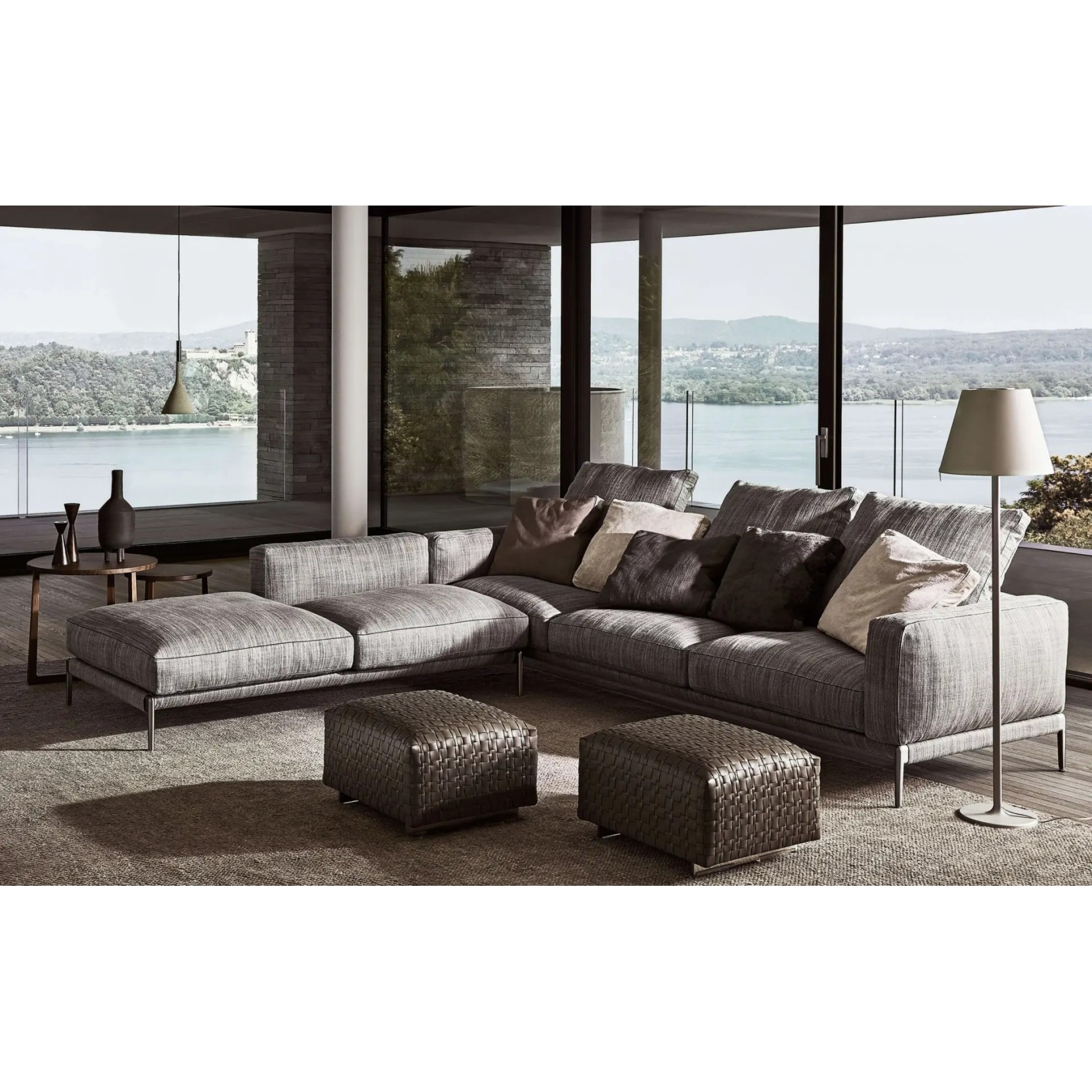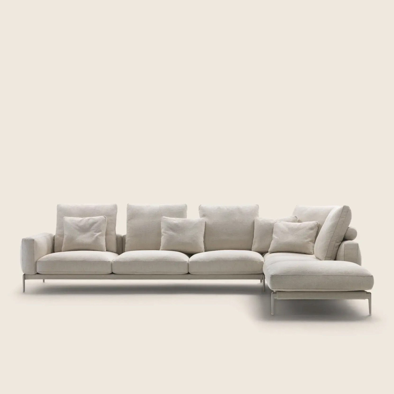 A thin grosgrain trim—available in all the colors of the sample collection—outlines the seams with subtle elegance, enhancing the sofa’s harmonious silhouette. The metal frame, padded with a layer of polyurethane foam and encased in protective material, supports generous seat cushions filled with certified Assopiuma sterilized goose down, combined with multi-density resilient inserts. The same materials are used in the backrest and armrests, ensuring both softness and ergonomic support. The fully removable cover is available in both fabric and leather, and thanks to its understated design and exceptional comfort, Romeo proves to be a highly versatile seating system, equally at home in minimal interiors or more classic environments, adapting effortlessly to different styles and settings.