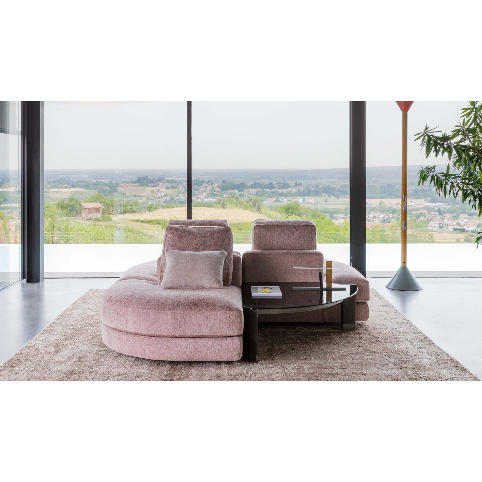 Upholstery, available in fully removable fabric or leather, can be matched with square or cylindrical feet in black nickel or matte burnished finish, while a practical tray in matte burnished or oxide metal, or upholstered in non-removable leather, can be anchored to the bases to provide a convenient support surface. The collection is enriched by MyPlace coffee tables with irregular shapes designed to fit seamlessly between the seats, following the curvature of the compositions, with tops in hand-spatulated concrete in Velasca finishes of cement or lava, or in metal in matte burnished or black, with matching burnished metal frames. With an extensive range of modules — linear seats, symmetrical and asymmetrical corner units, bases, armrests and interchangeable backrests — MyPlace allows for tailor-made solutions, from compact formats to large-scale layouts, with widths ranging from 103 cm for smaller modules up to 500 cm for the most articulated compositions, making it a system that adapts elegantly to any contemporary living environment.