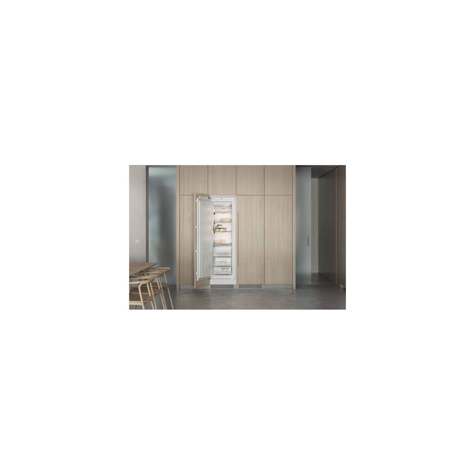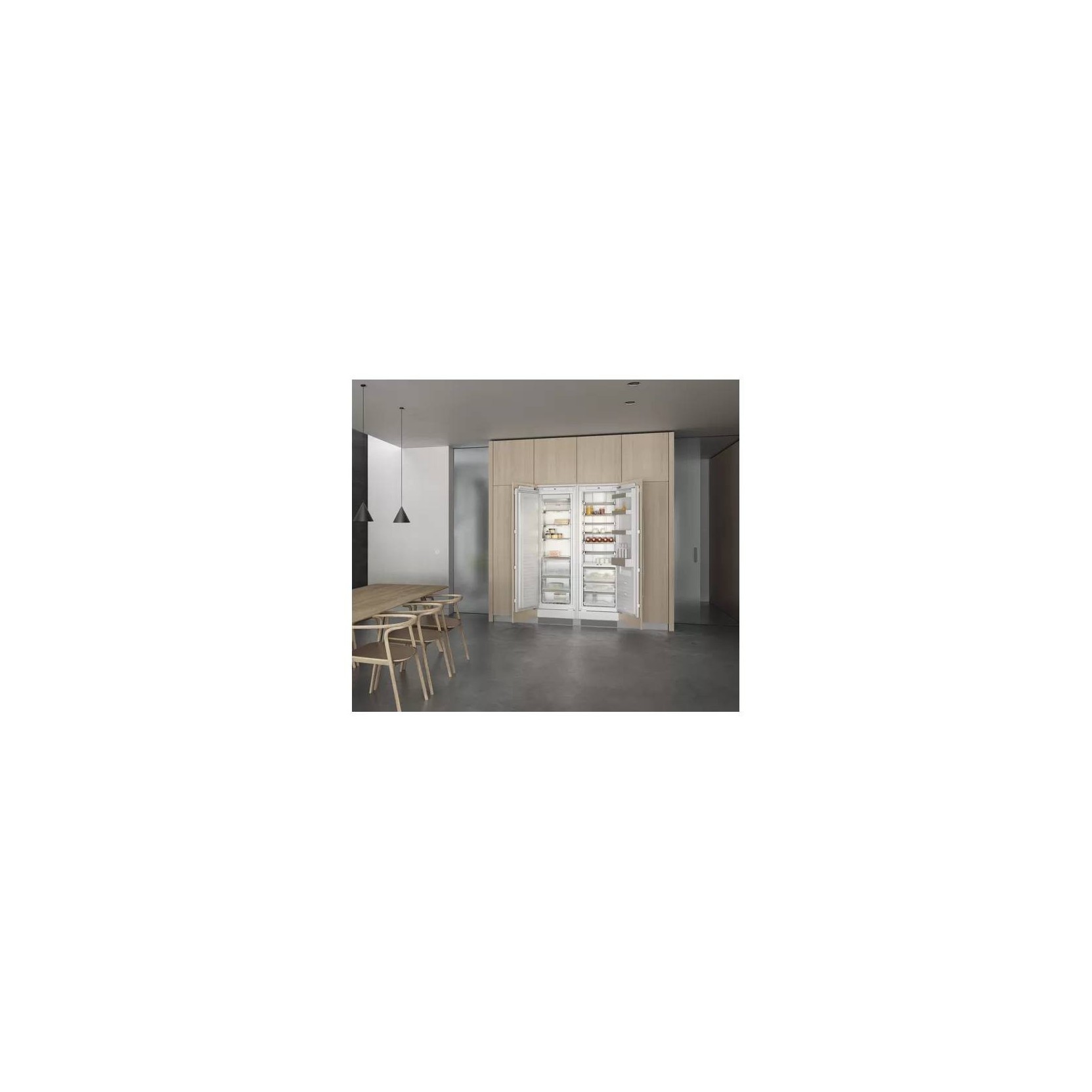 Interior with precision-fitted, solid aluminium elements in Gaggenau Light Bronze Safety glass shelves, set in solid aluminium profiles Drawers with solid aluminium handles and signature drawer front with a gradual frosted surface Warm white interior lighting (3500 K) with integrated glare-free side lights Direct access through partitioning with open storage areas