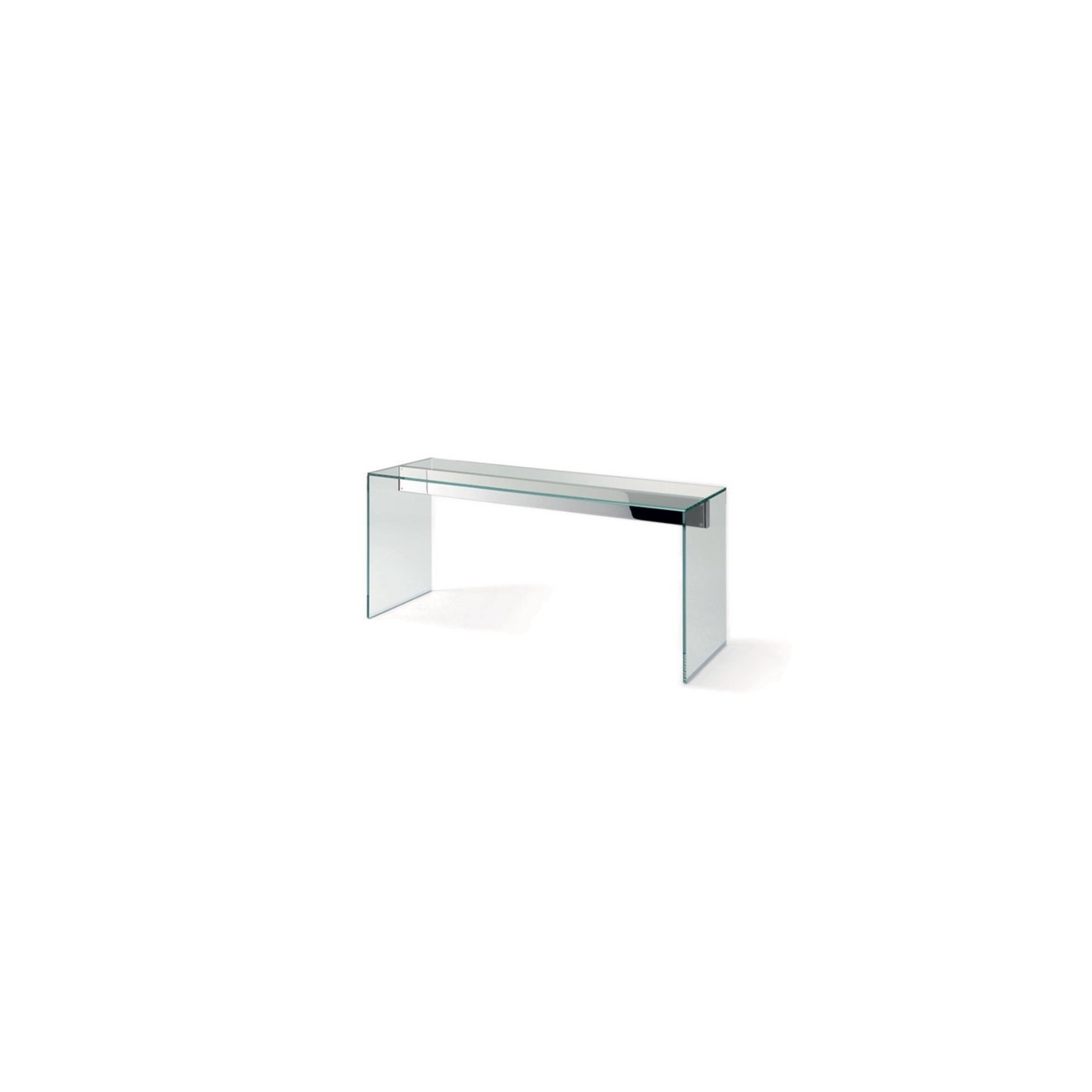 Console in 12mm transparent or smoked “grigio Italia” tempered glass. Available also with painted glass top as per samples in the bright or satin version. Leather effect laminated glass top, on request. Bright or satin stainless steel, anodised aluminium or embossed white or black lacquered metal parts. Hand brushed aluminium in the colours black or titanium grey, on request.
