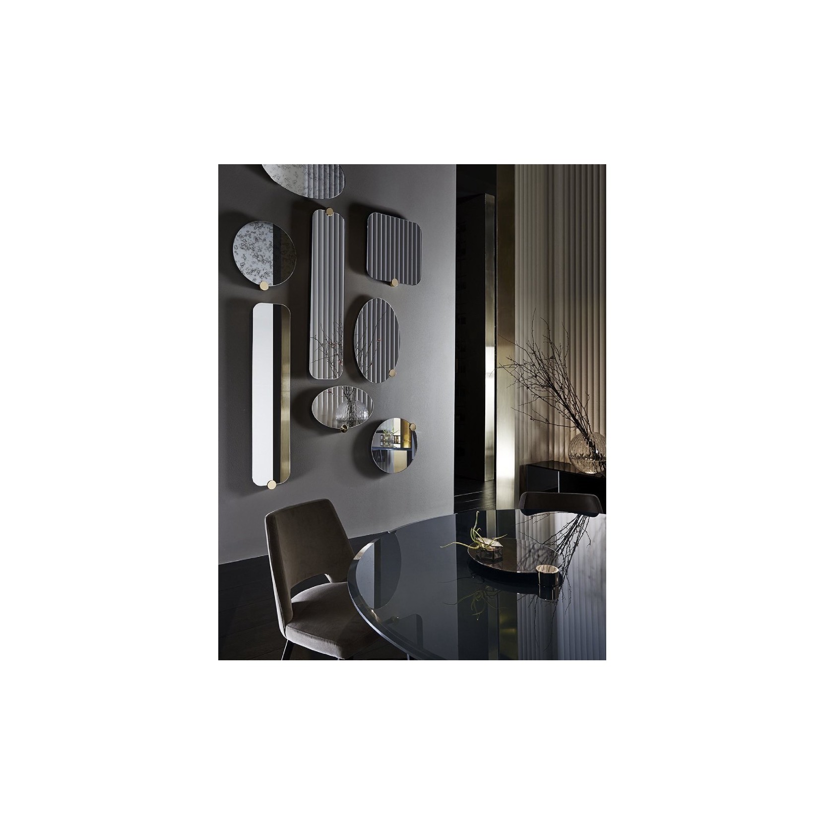 Mirror with bright brass decorative detail, which can be placed all over the perimeter,at discretion of the client. Available also in extralight mirror, “Antique 1” or “Antique2” mirror.