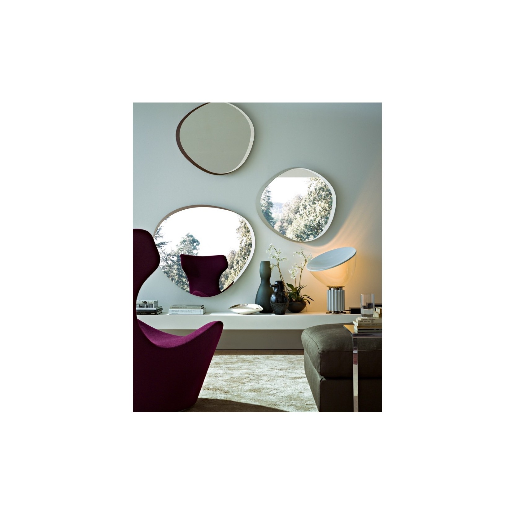 Hand polished and bevellede xtralight mirror in three different shapes and sizes. White lacquered wooden frame (thickness 5cm) or lacquered with “fabric” touch effect in the colours chestnut, sand and canapa.