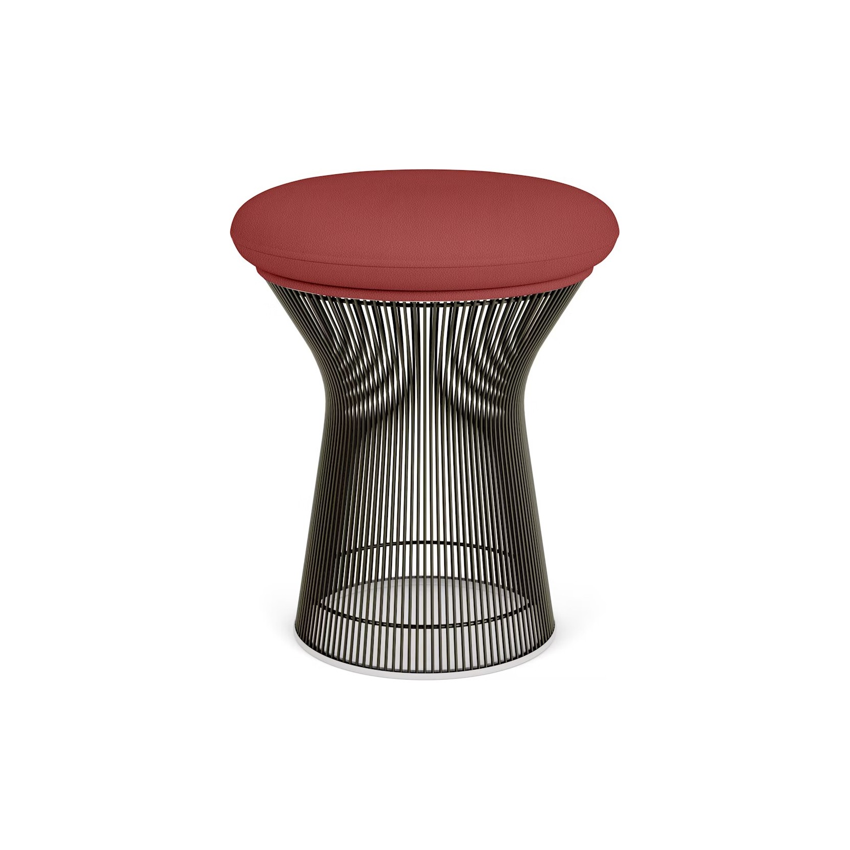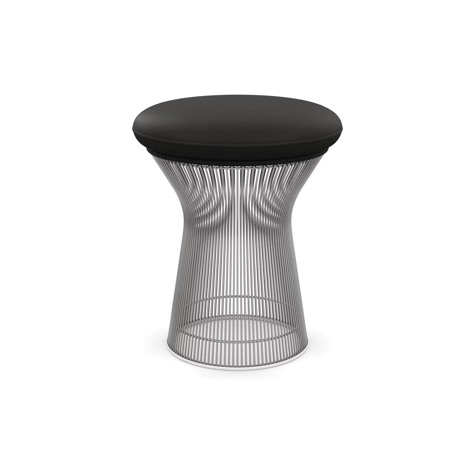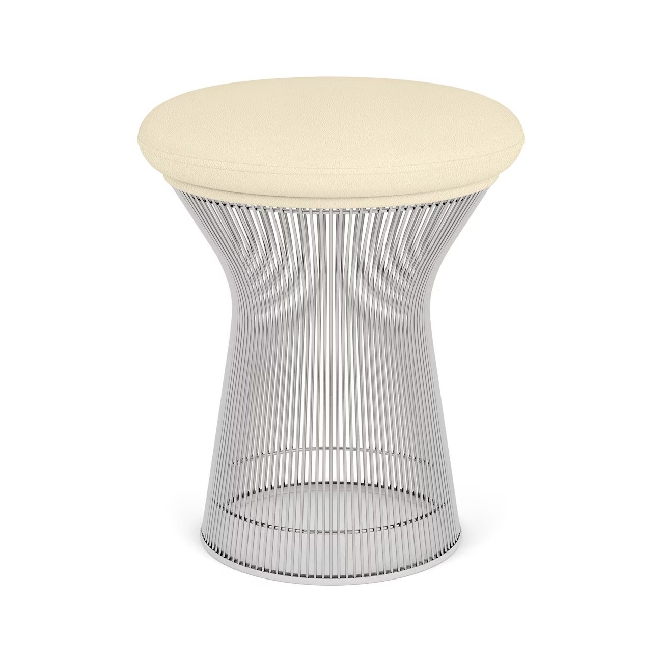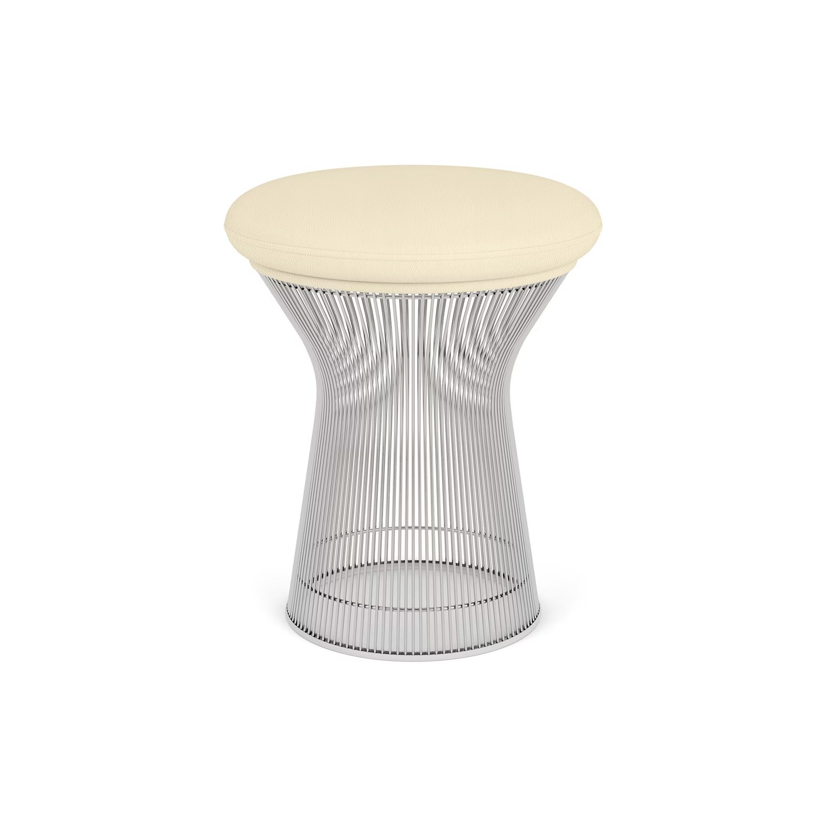 this stool is part of Platner Collection and has a nickel-plated steel wire rod base with clear lacquer protective coating; its shell is in molded fiberglass and has a molded latex foam cushion.