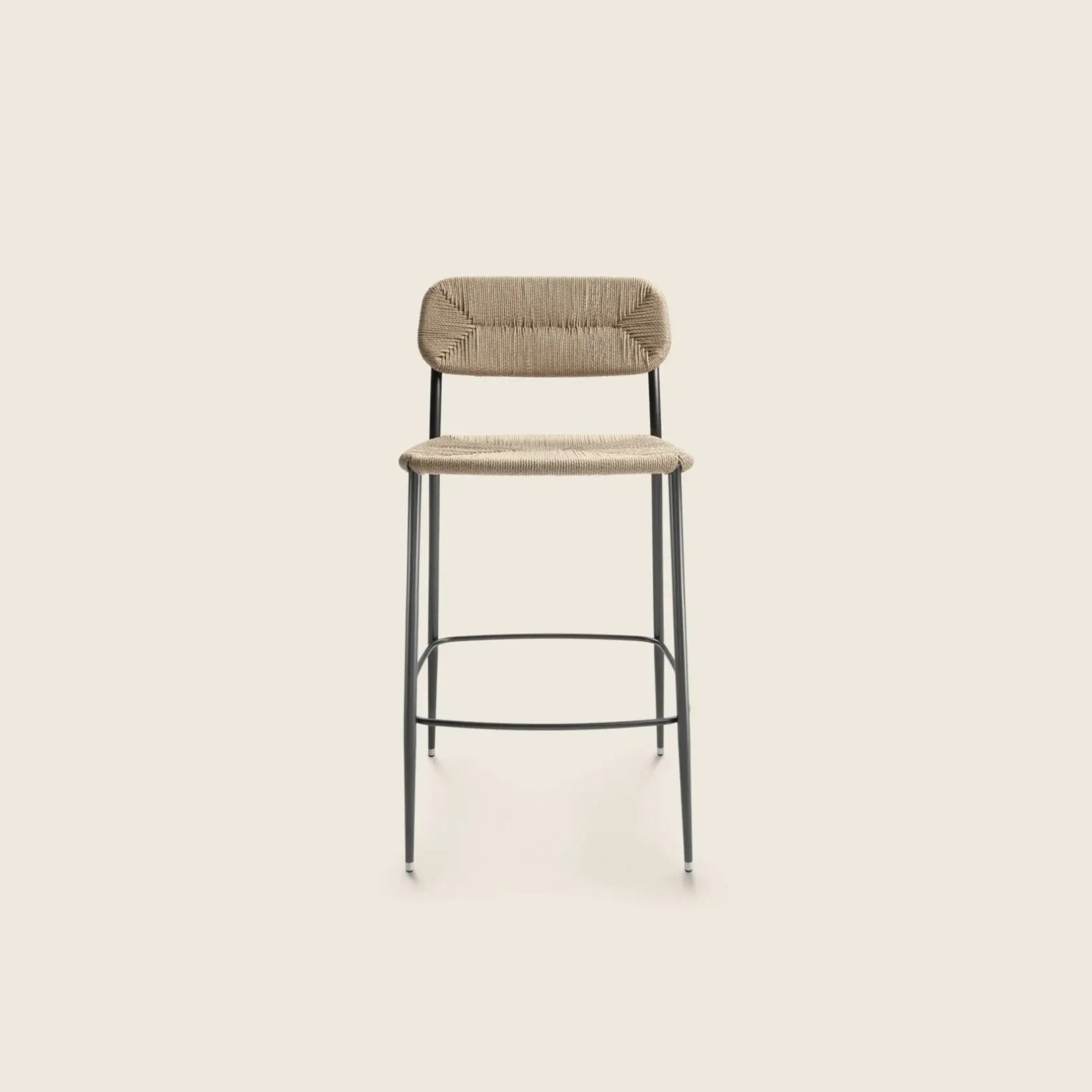 The slim metal structure—available in a range of matte and glossy finishes—rises fluidly to form the backrest, while the seat and backrest feature a tightly hand-woven pattern crafted from twisted river straw or pure cellulose paper cord. The stool rests gracefully on discreet transparent-finish metal tips supported by thermoplastic glides, making it an object of quiet presence suited to any interior setting.