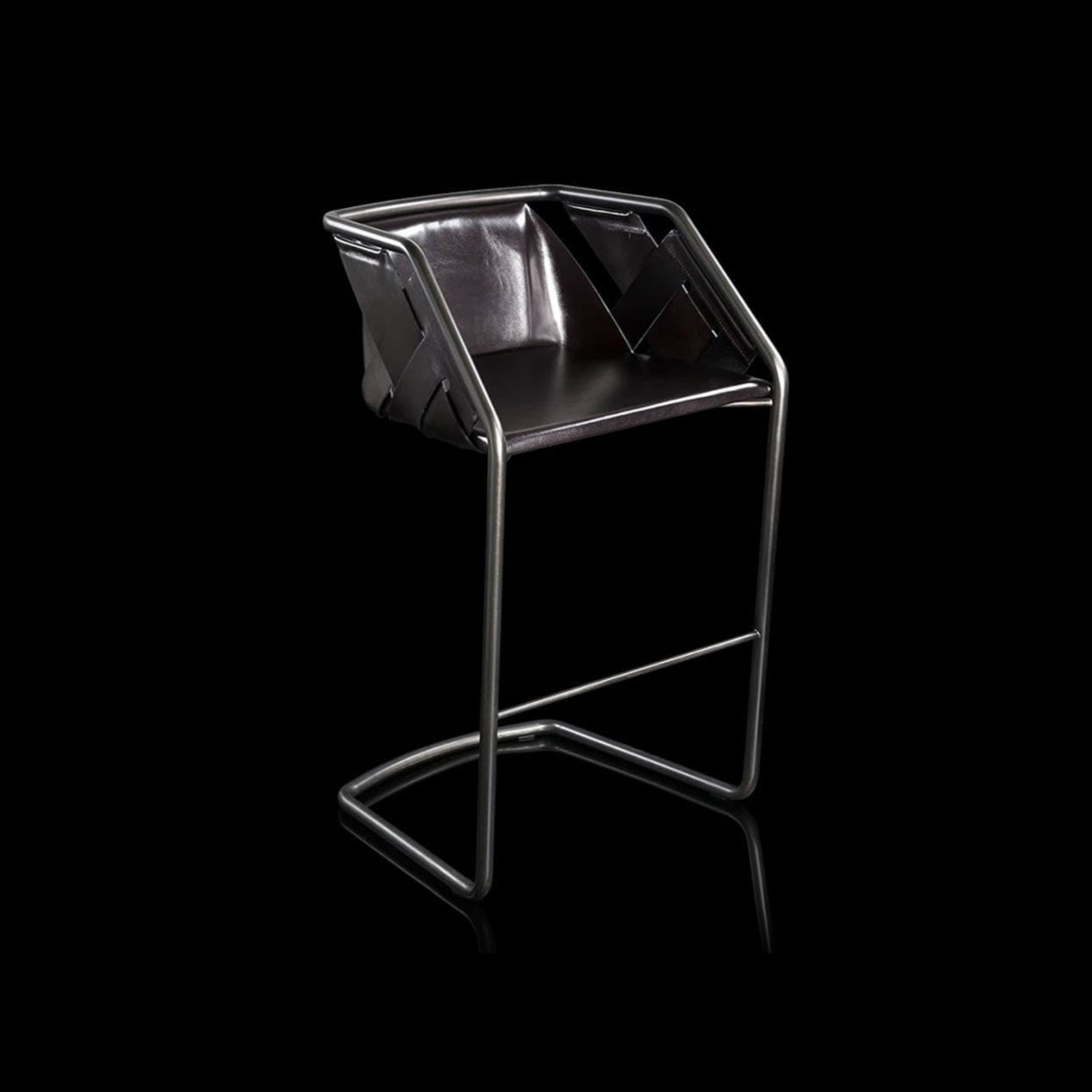 The Strip stool features a heavy-duty curved metal pipe frame, with a diameter of 2.5 cm, available in finishes of Black Burnished Steel, Burnished Platino, Burnished Titanio, and Burnished Brass, hand-burnished using traditional techniques. The seat is padded with woven, laser-cut double-thickness leather, available in Durango, Nabuk, Camoscio, or E-Type. Its dimensions of 56x56x84 cm and a seat height of 61 cm make it ideal for elegant, modern spaces, blending style and comfort.