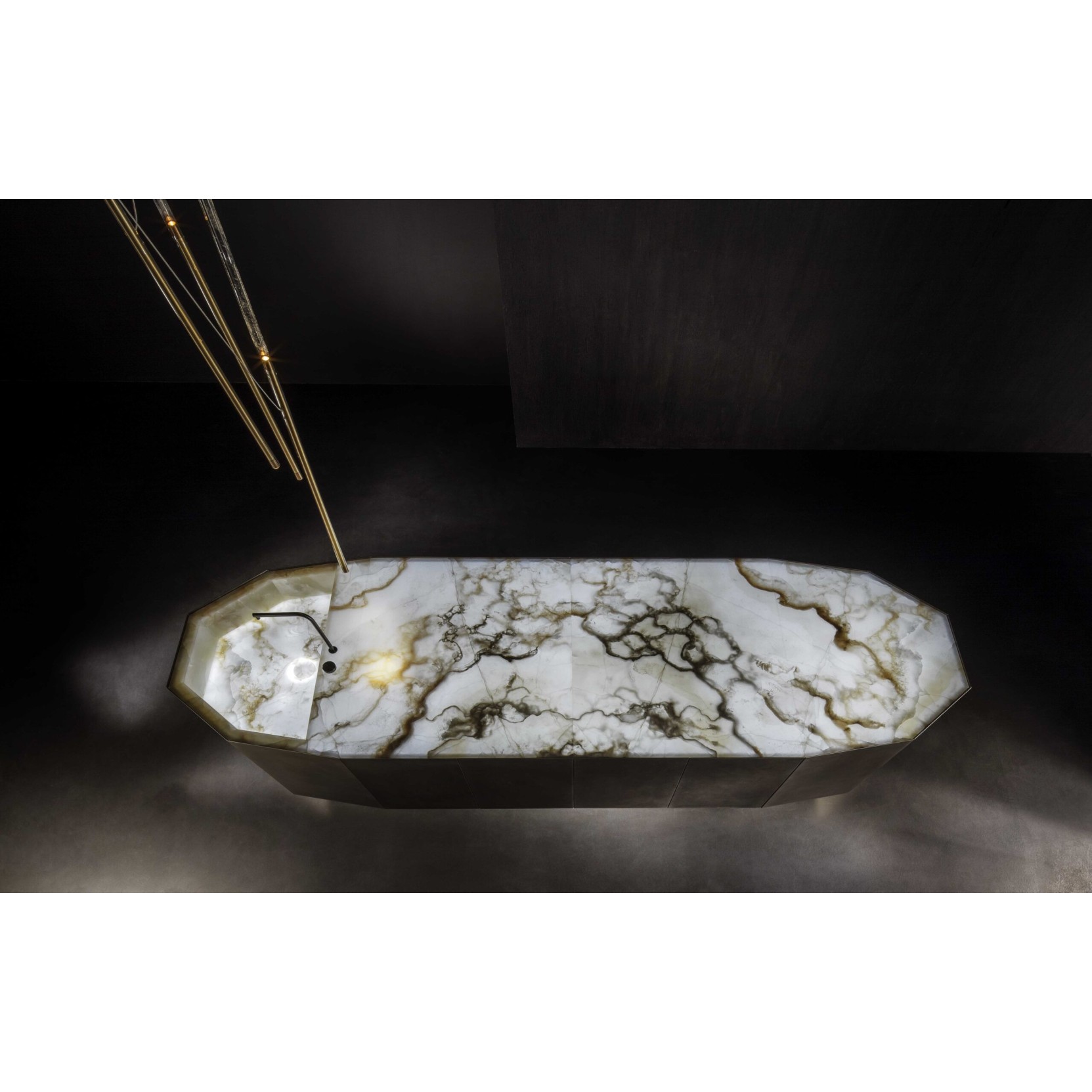 The Henge bar island, designed by Massimo Castagna, stands as a major protagonist in the spaces it inhabits. The metal fronts with a continuous sloping plinth support a backlit stone top and large backlit basins, which can serve as a sink or icebox. A professional instrument that discreetly hides all the typical bar counter appliances—from the dishwasher to fridge drawers and an ice maker—while offering an unexpected aesthetic reminiscent of an exclusive club.