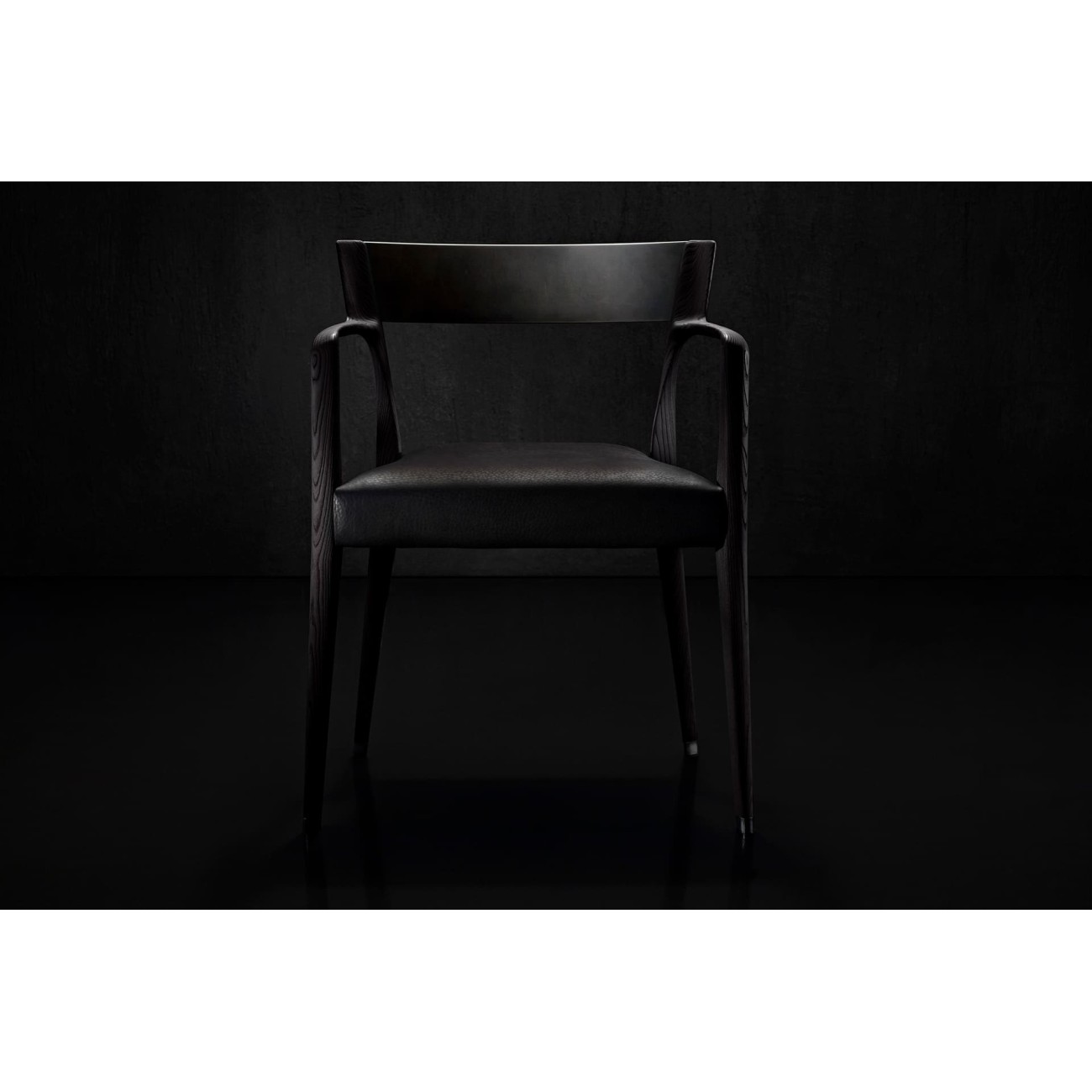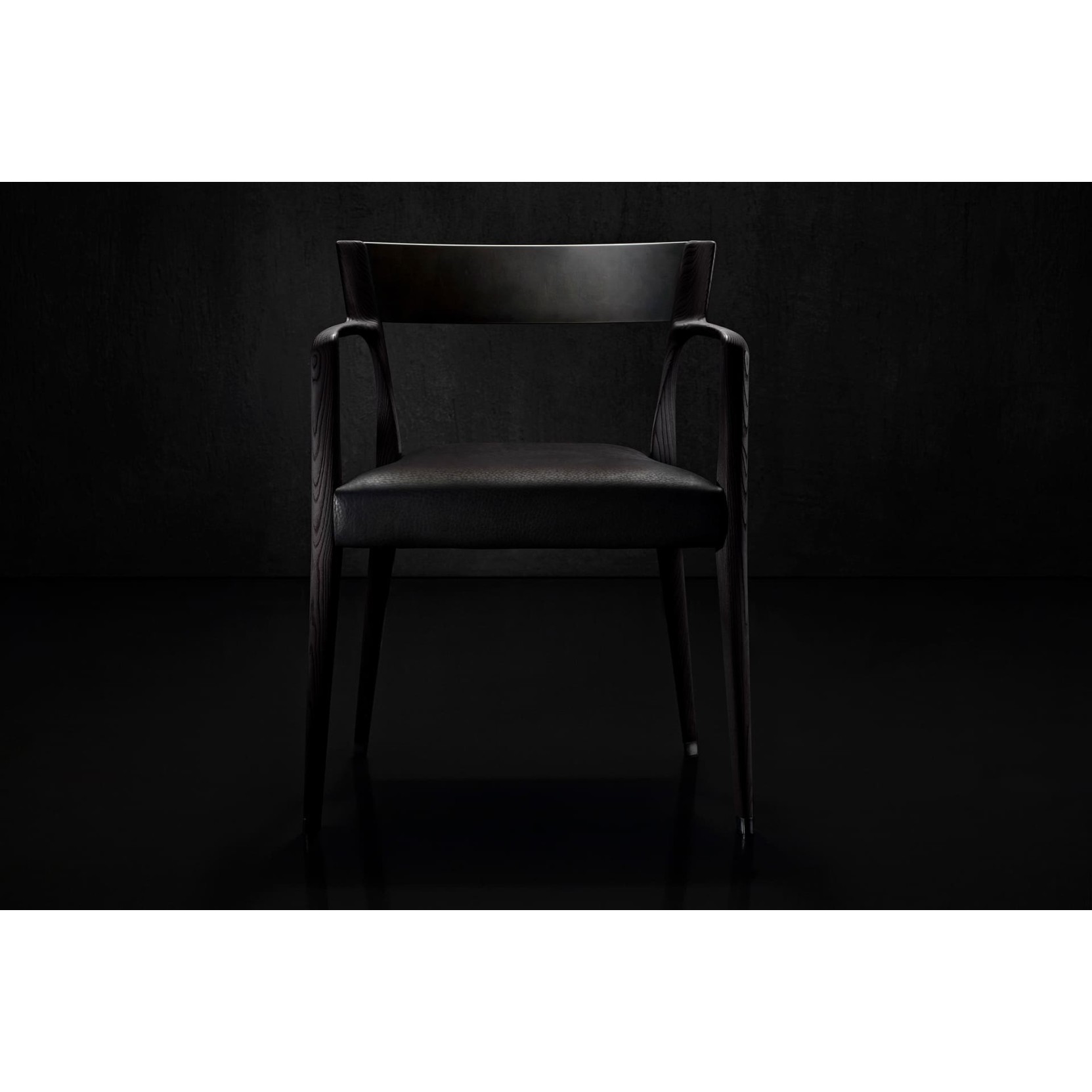 The Chair-Va, available with or without armrests, is a perfect example of a fusion between classic and futuristic design. The frame is handcrafted from premium materials such as Black Wood, Swamp Olive Ash, TH1 Wood, or a matt lacquered open pore finish, ensuring a sophisticated look. The metal leg details are made from Sand Cast Brass, adding a touch of luxury. The seat is meticulously upholstered by hand and finished with refined tailoring, featuring high-resiliency foam for optimal comfort. The backrest is crafted from metal with either a Burnished Titanio or Burnished Platino finish. An optional leather pad is available for added comfort. The cover is not removable, ensuring a seamless, integrated look.