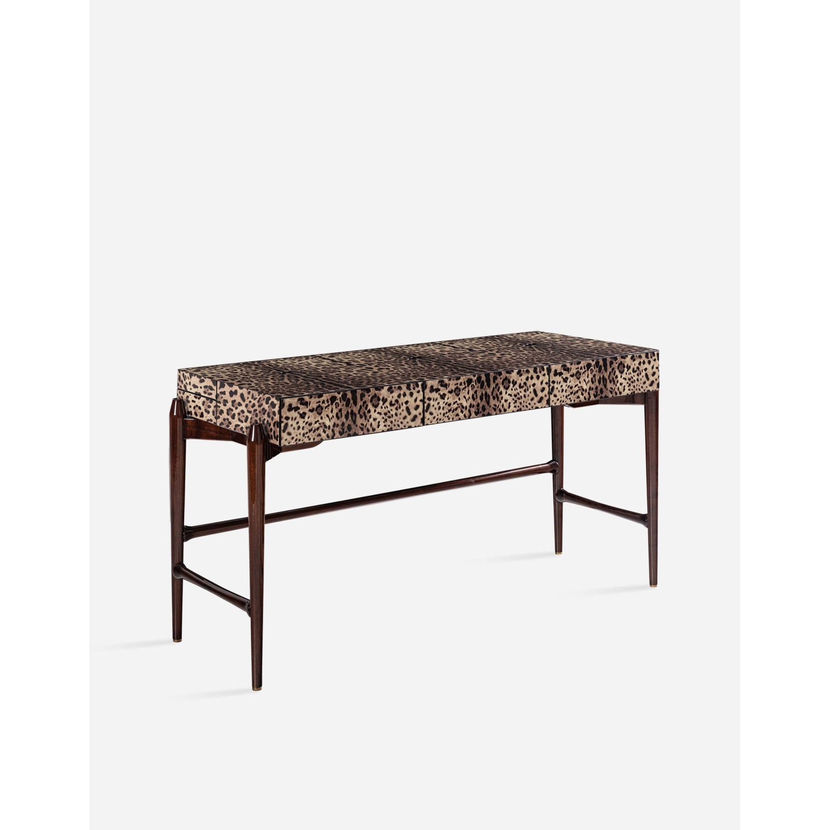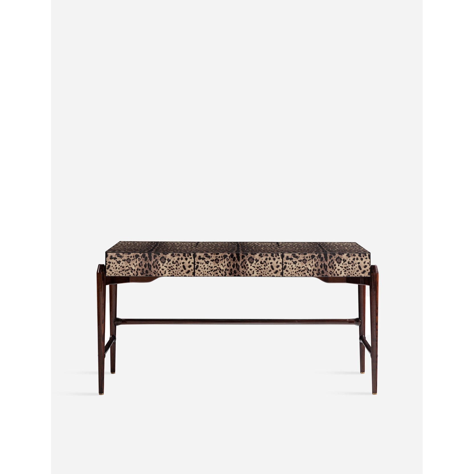 The Concordia desk merges artisan excellence with a visionary design approach. The elegant top surface, adorned with collection graphics and finished with a glossy polish, discreetly conceals drawers and generous flap compartments, ideal for storing documents and stationery. Every detail is meticulously crafted: from the manually shaped edges to the visual balance of volumes, and the precise polishing that preserves the timeless appeal of Dolce&Gabbana graphics. The structure features coordinated decorative graphics both inside and out, finished in glossy brushed lacquer. A solid oak wood base and steel accents in matching finishes complete the ensemble. Made in Italy.