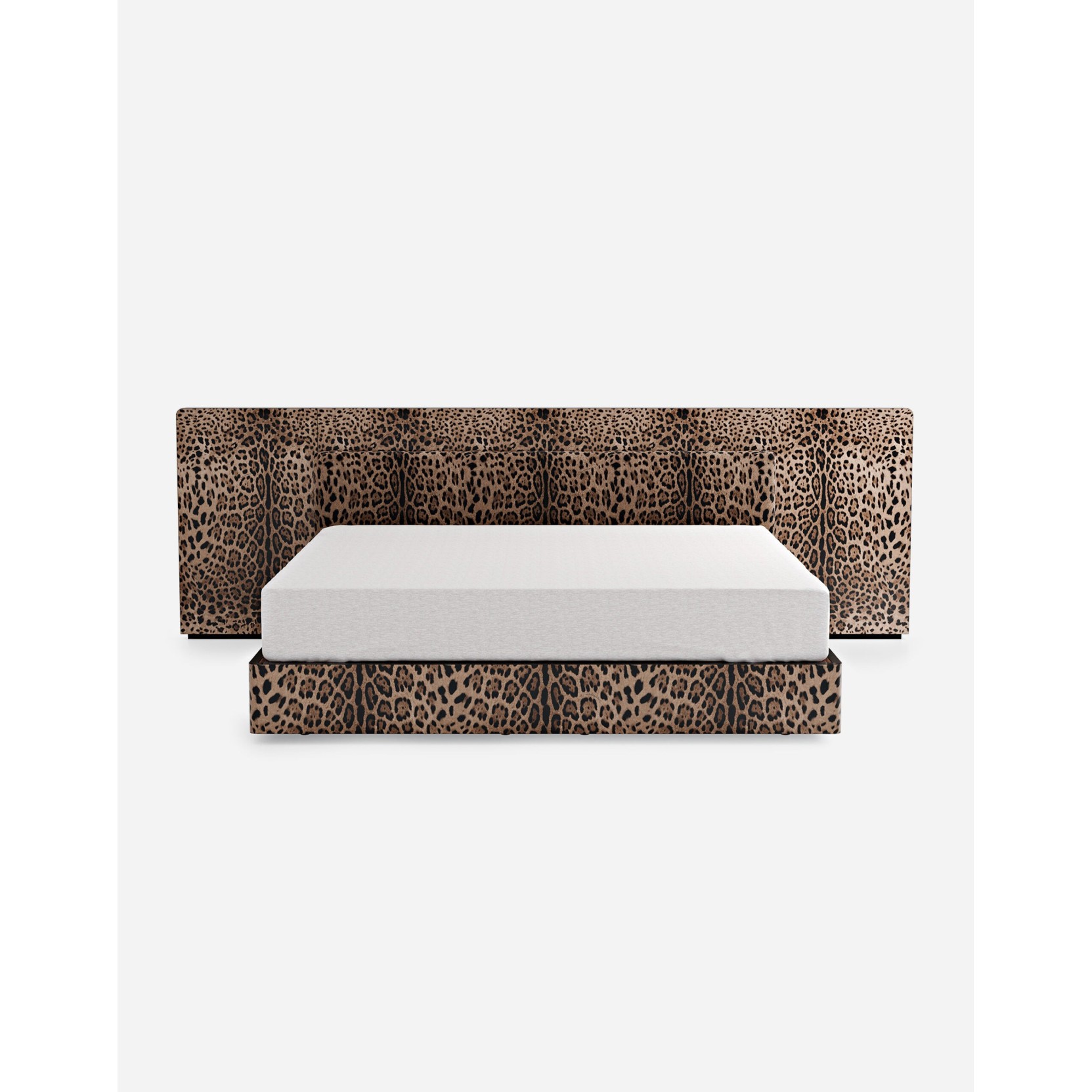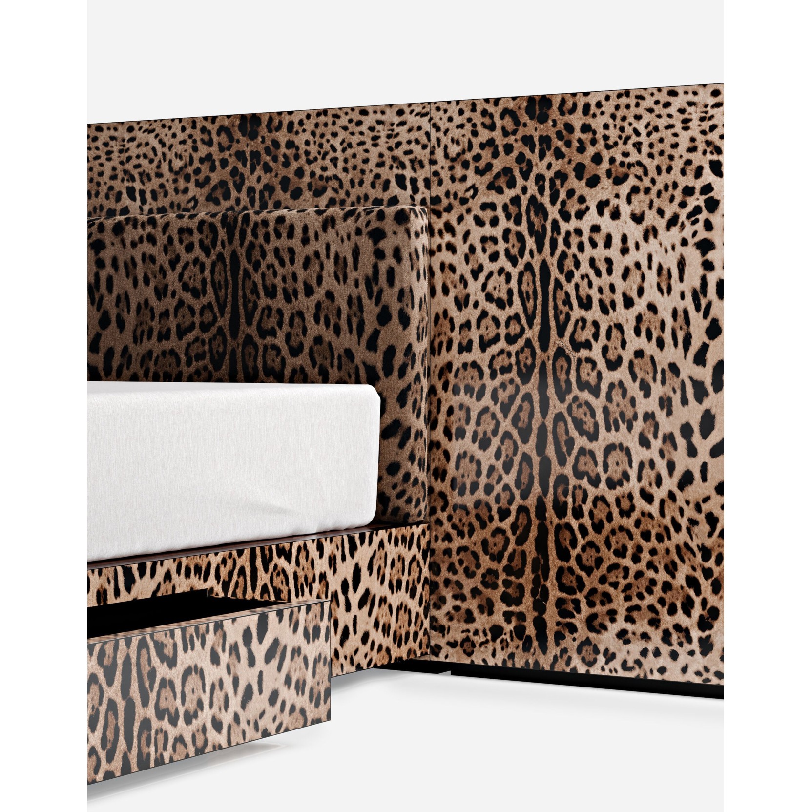 The Perseo bed is a design masterpiece that combines aesthetics with practicality. The headboard, crafted from decorated wood with Dolce&Gabbana's collection graphics, can be complemented with additional cushions for ultimate comfort. A perimeter LED lighting system can be added to further enhance the bed's dramatic appeal. The removable base, decorated with the same coordinated graphics, features a glossy brushed finish, while the orthopedic slatted base is covered in fabric. The retractable side drawers offer functionality without compromising elegance. Made in Italy.