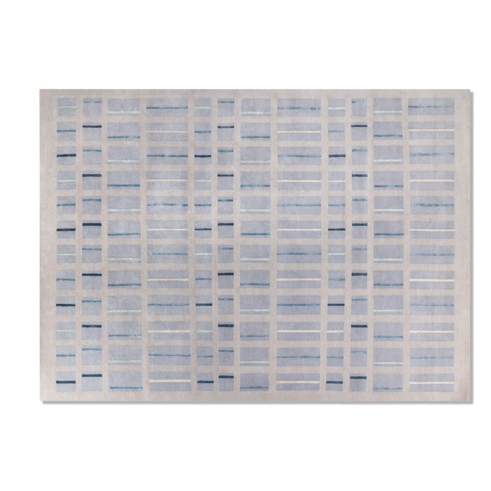 DUO is a hand-knotted rug made using the traditional Indo-Tibetan knot, with a density of 90,000 knots per square metre. Its design is a repeated matrix of squares and rectangles, broken by delicate silk threads in contrasting colours that add a rhythmic, graphic accent to the surface.