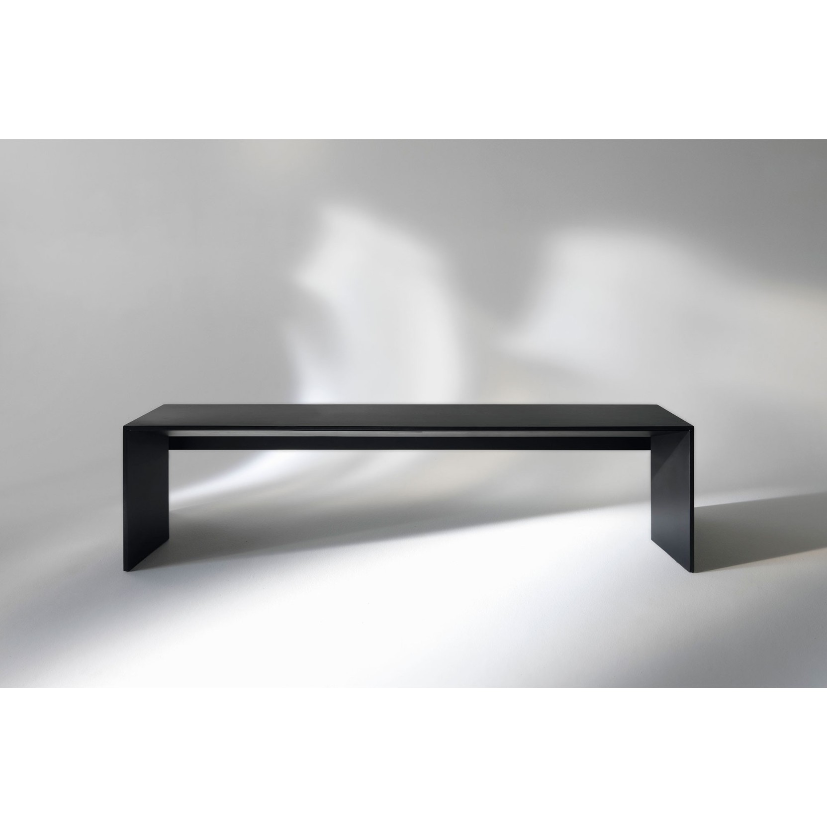 Made of MDF, the external finish is in brushed larch lacquered in matte black or white, while the interior is lacquered in a matching matte color, creating a visual continuity. Available in different sizes: 120x40x h45 cm, 150x40x h45 cm, 190x40x h45 cm, and 230x40x h45 cm. Available in Matte white lacquer, Matte black lacquer, or Canaletto walnut finishes to suit various styles and settings.