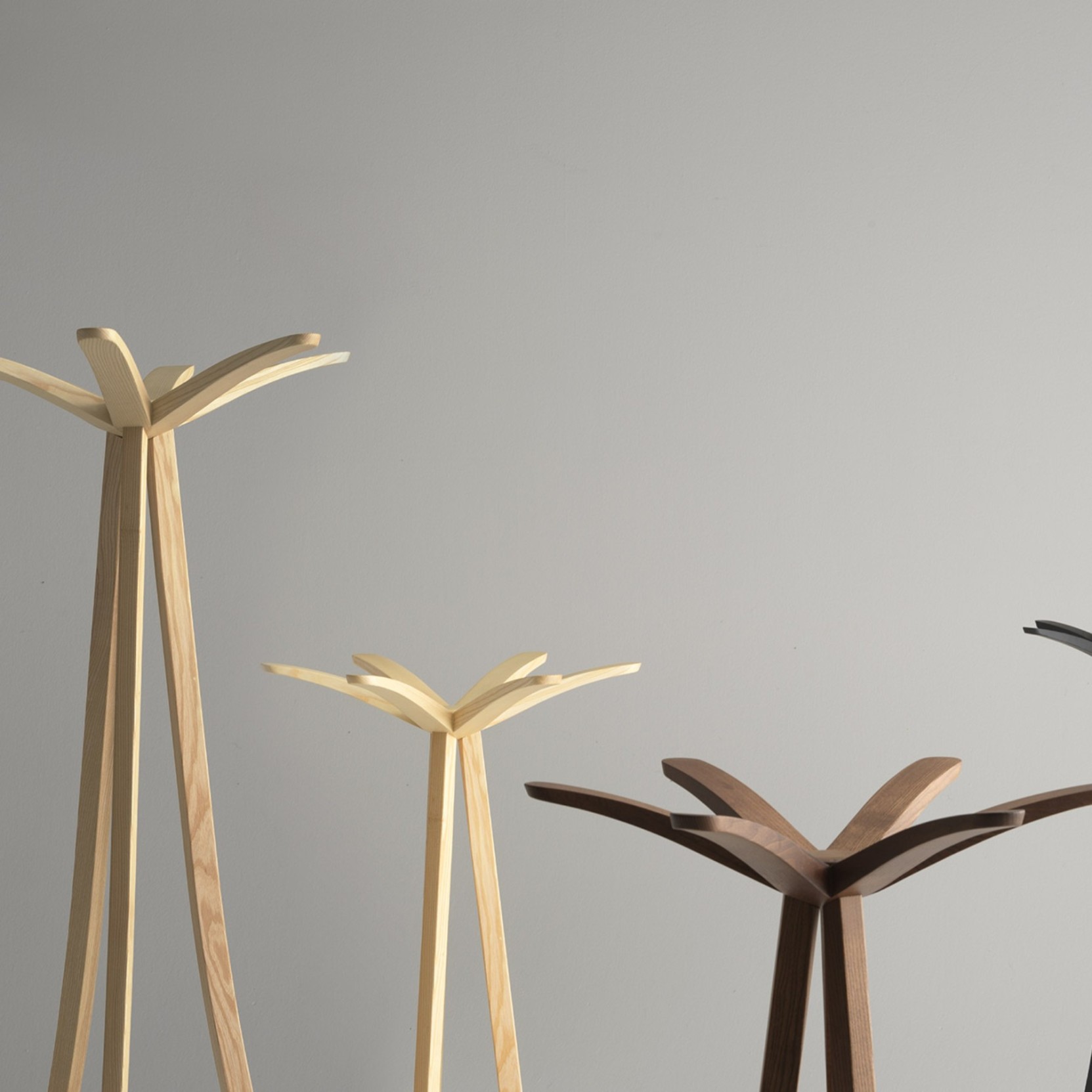A functional object that doubles as a domestic sculpture: this coat rack by Carlo Cumini is crafted entirely from ash wood and features a radial six-petal structure that offers multiple points for hanging clothes, bags, and accessories.