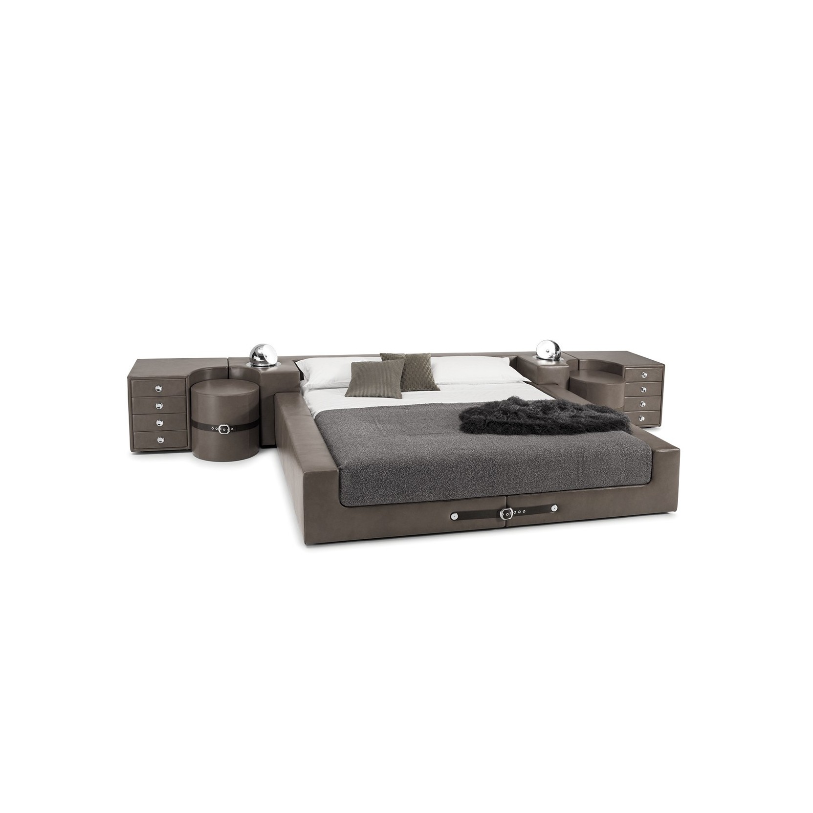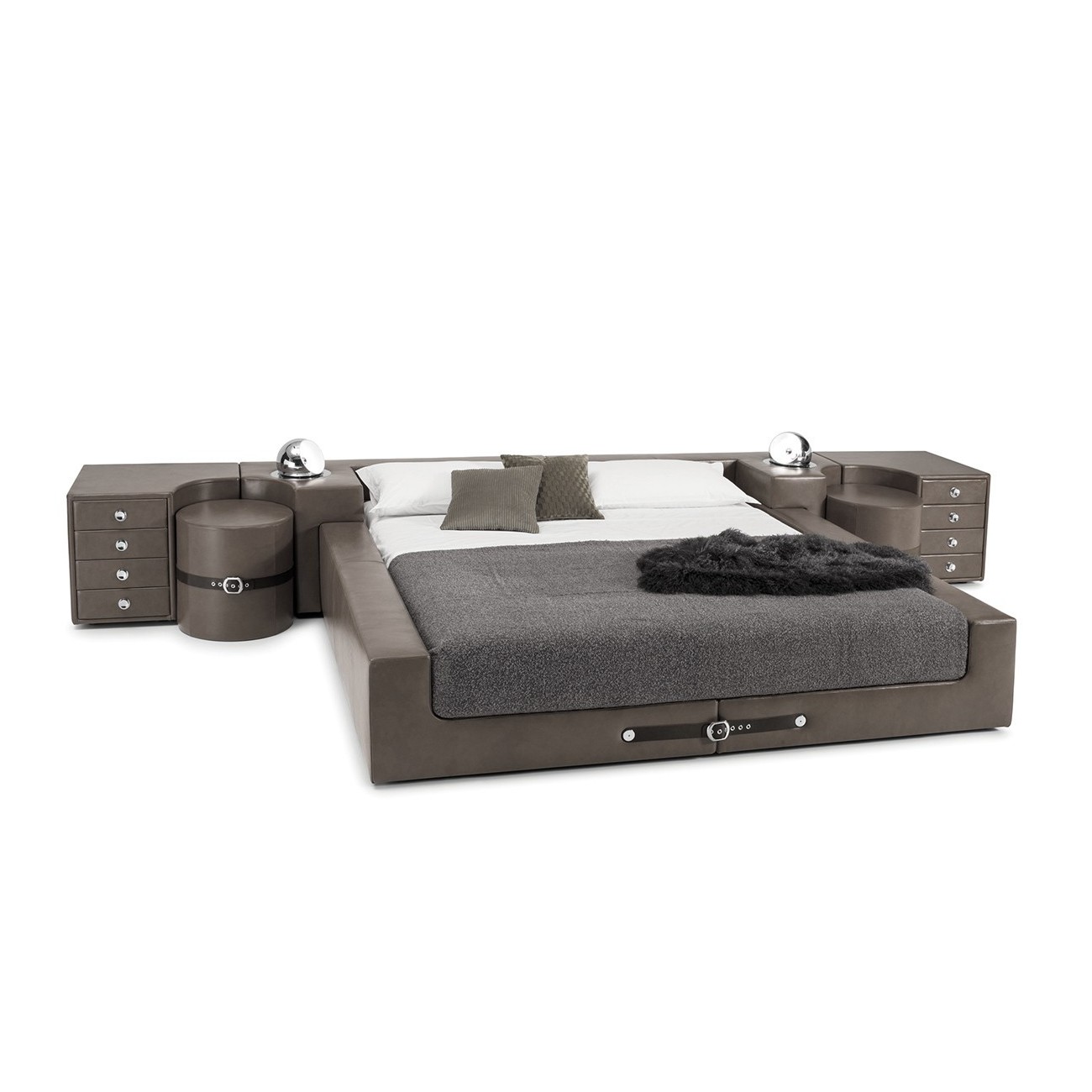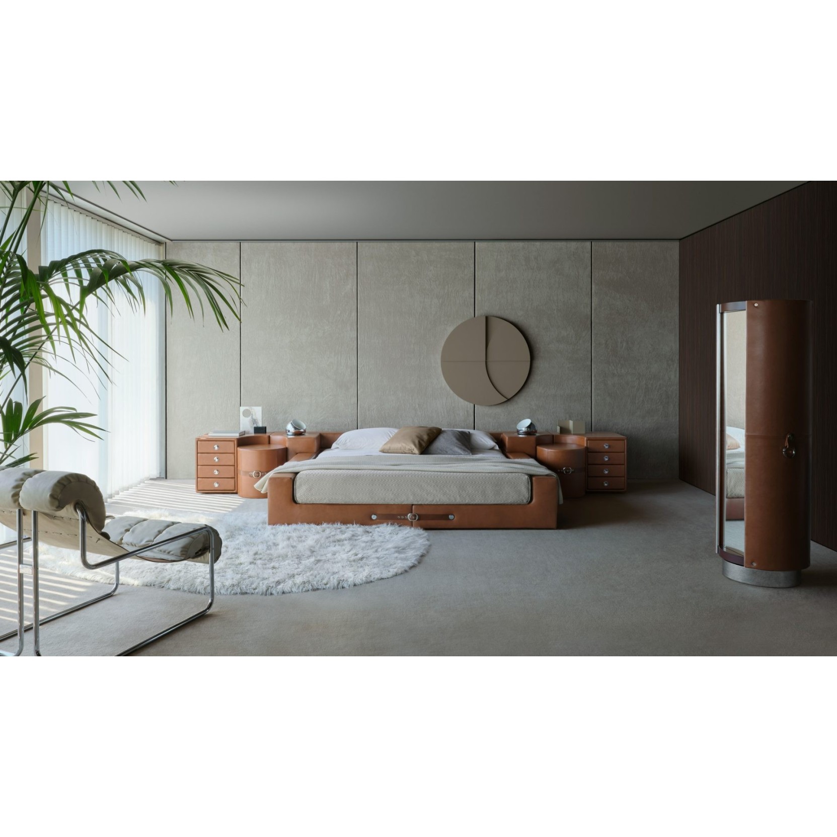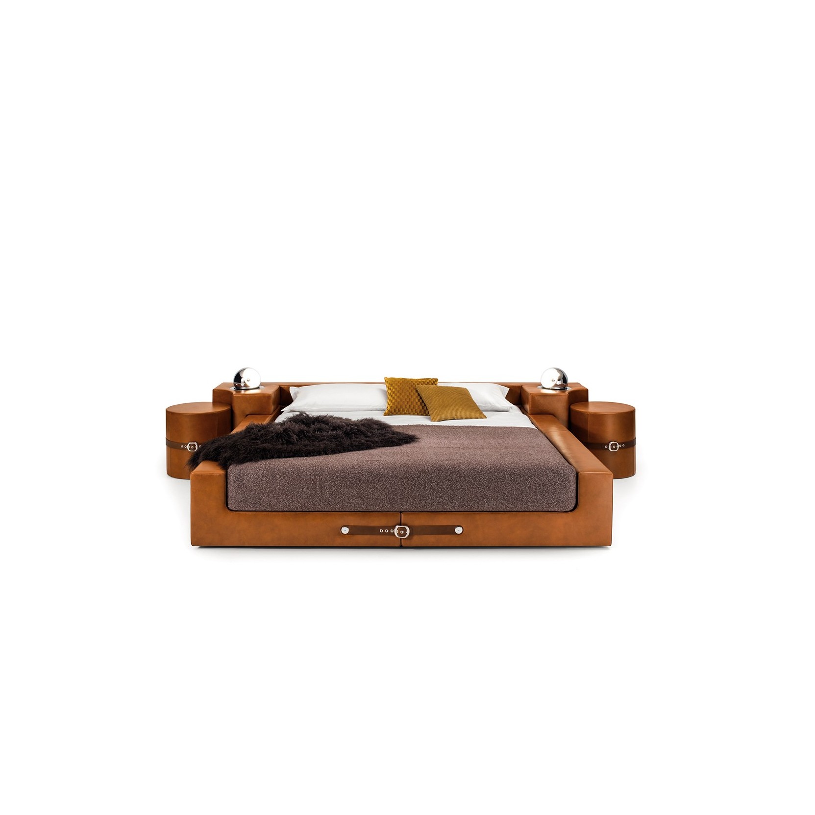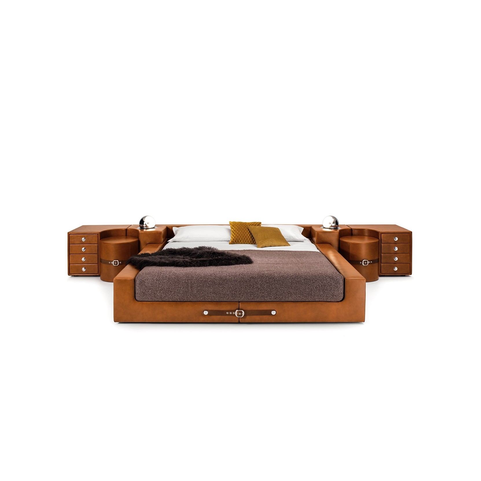 The TUCROMA bed features a poplar plywood structure with dovetail joints ensuring solidity, while high-density polyurethane foam padding (75 kg/m³) provides lasting comfort. The headboard, upholstered in non-removable leather with distinctive saddle straps, incorporates practical chromed steel lamps. The ensemble is completed by a wooden slatted base and black PVC feet. The ottoman shares the same construction philosophy, with plywood frame and high-performance padding. The end cabinet, with its four leather-lined drawers and chrome handles, offers functionality without aesthetic compromise. The iconic swivel dressing cabinet surprises with its rotating mechanism and bent beech plywood structure, where mirror and chrome accessories combine with worked leather.