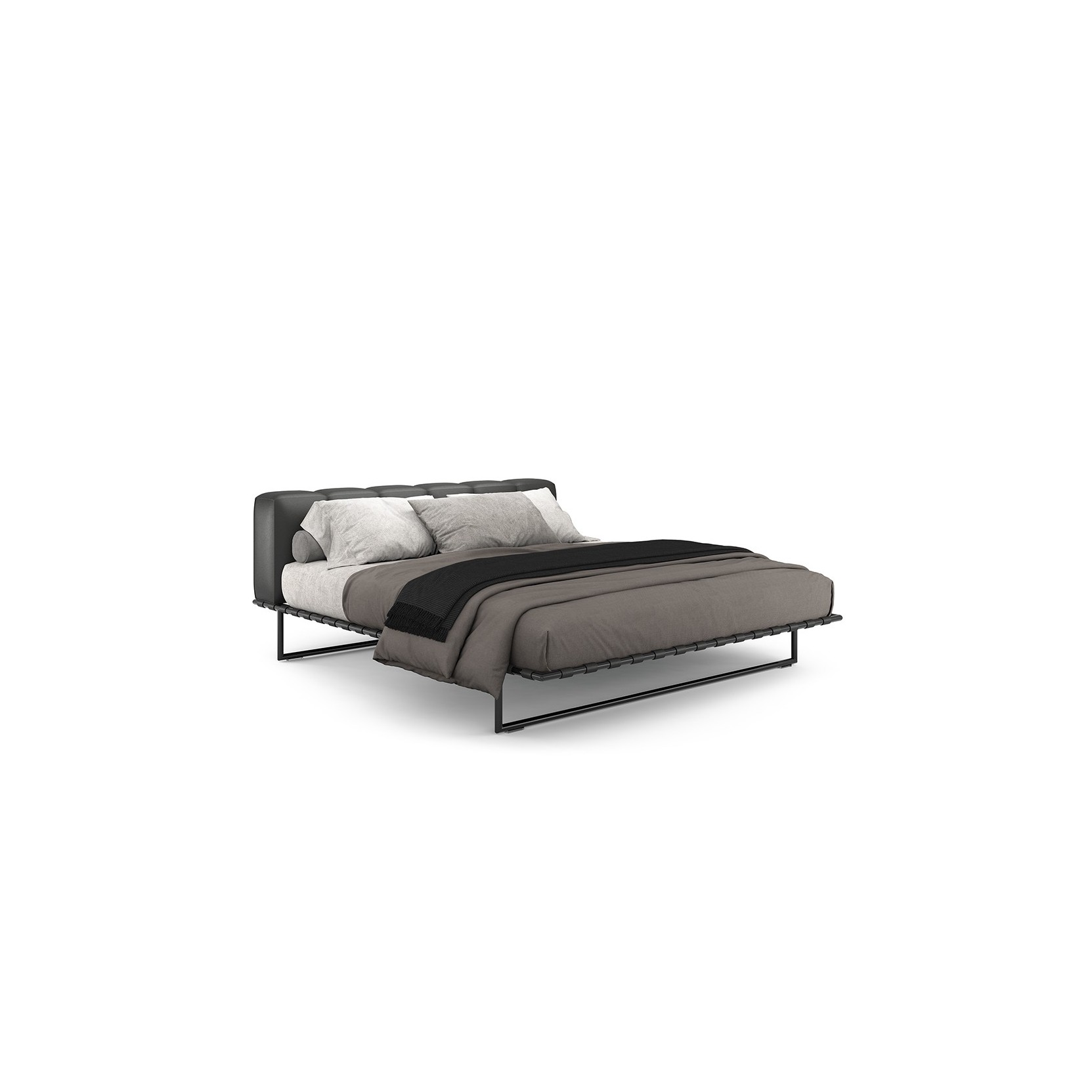 Kristall's construction blends innovation and craftsmanship through premium materials. The headboard, crafted from melamine-coated panels, features padding composed of resilient polyurethane foam layers with variable density (30-75 kg/m³, CFC-free) covered by polyester wadding and bonded plush for optimal comfort and durability. This element securely attaches to the tubular steel base, available in either polished chrome or epoxy powder-coated finish, with full RAL color customization options. The supporting structure elegantly conceals the mounting system for the solid wood slatted base, ensuring perfect breathability. The signature detail remains the arrangement of premium leather straps that envelop the metal frame in precise rhythm, creating a dynamic play of light and shadow through their modular pattern. The upholstery, offered in both technical fabrics and high-quality full-grain leather, features a non-removable application that enhances the design's clean lines.