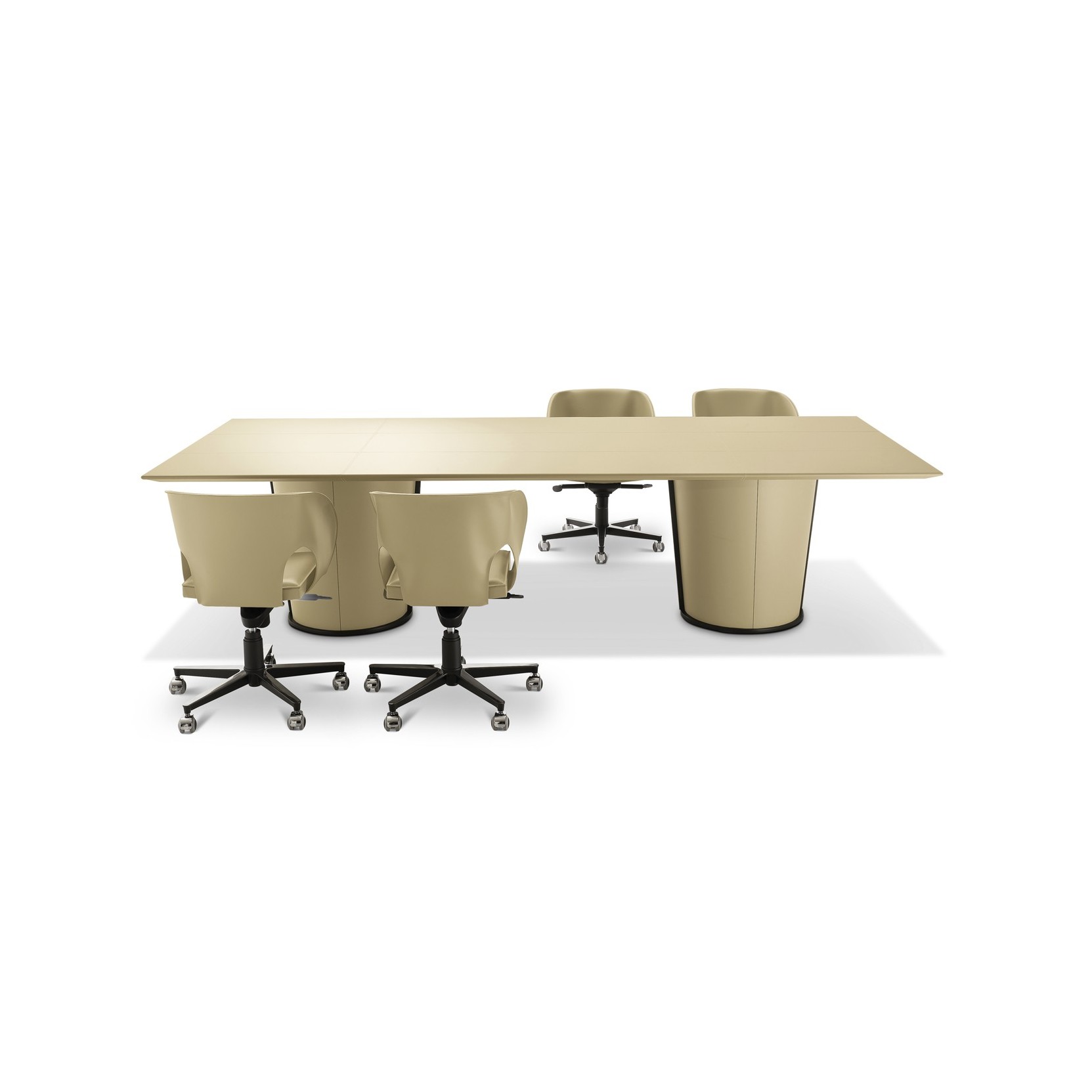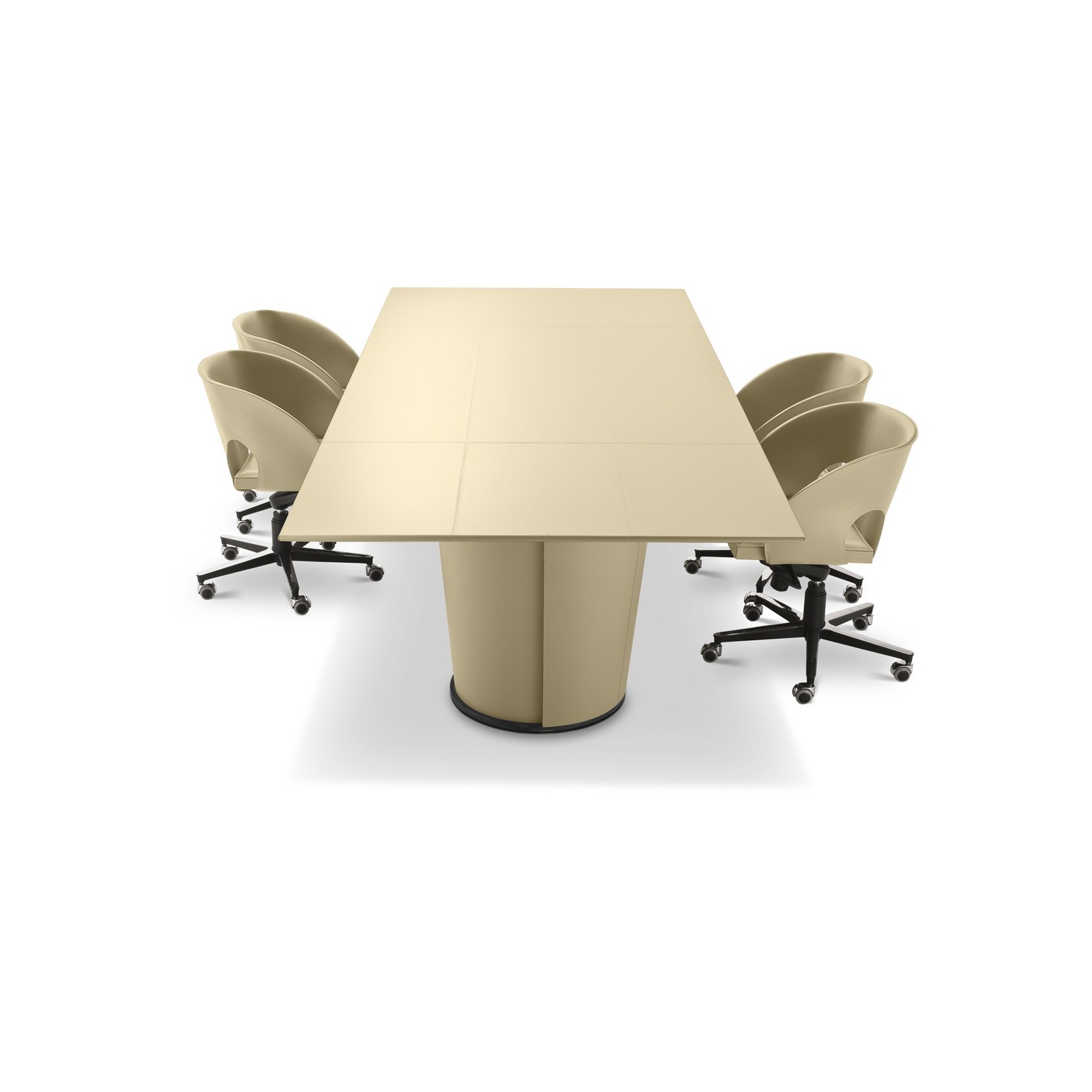 The table, available in round, square, or rectangular versions, features a prominent curved base covered in saddle leather, echoing the motif of sheets with curved edges. The tabletop is available in marble, wood, or leather, offering a combination of materials that enhances the refinement and modernity of the design.