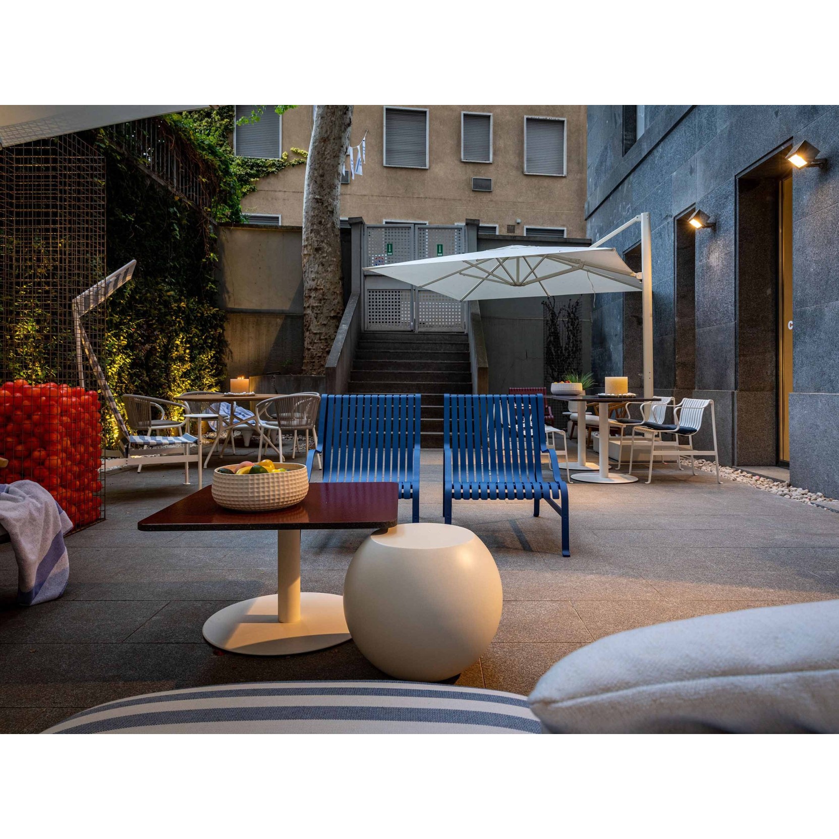 Bong Lido is a low spherical coffee table with a round top made of fiberglass and resin, available in a selection of colors. This elegant outdoor piece is designed for covered spaces such as verandas, balconies, and terraces.