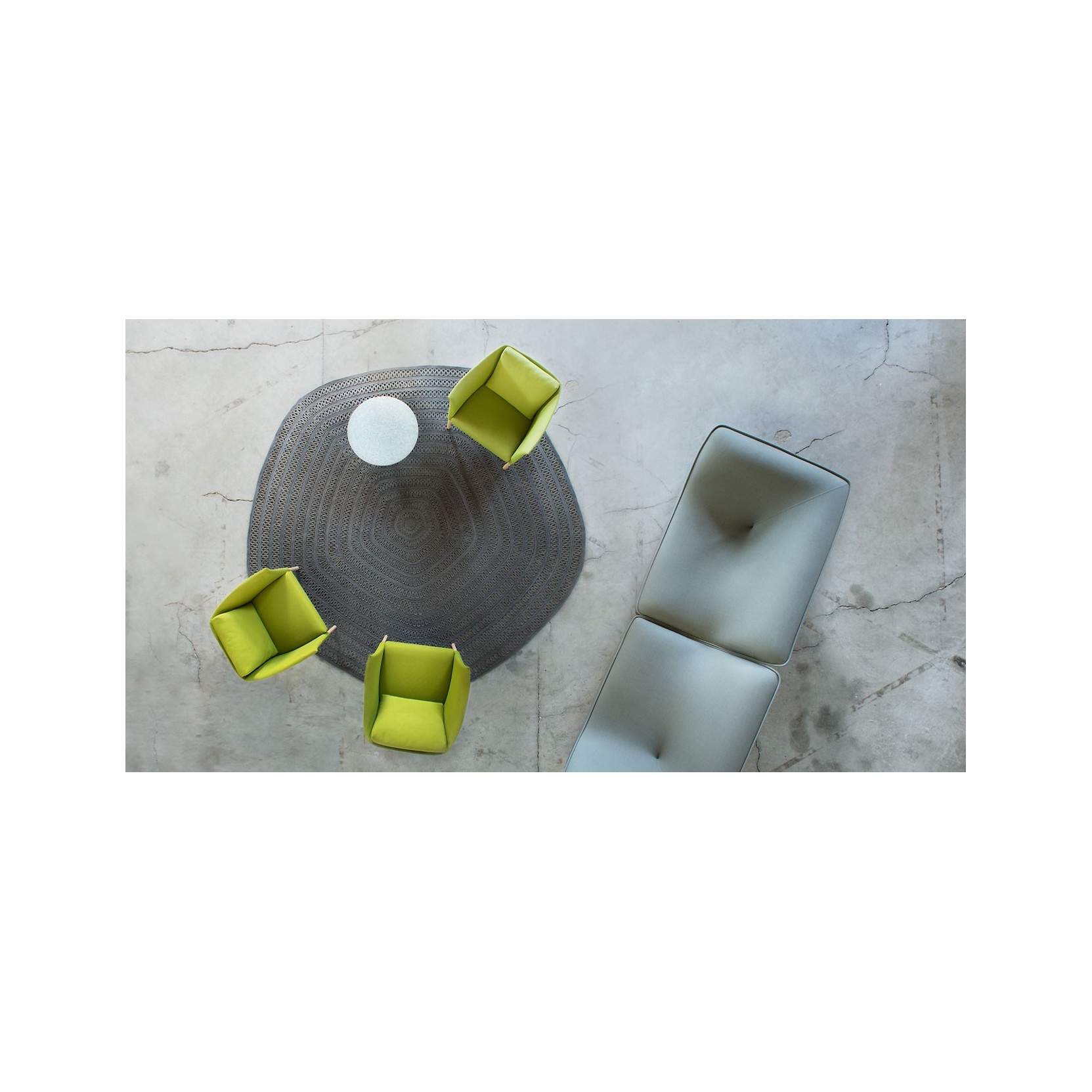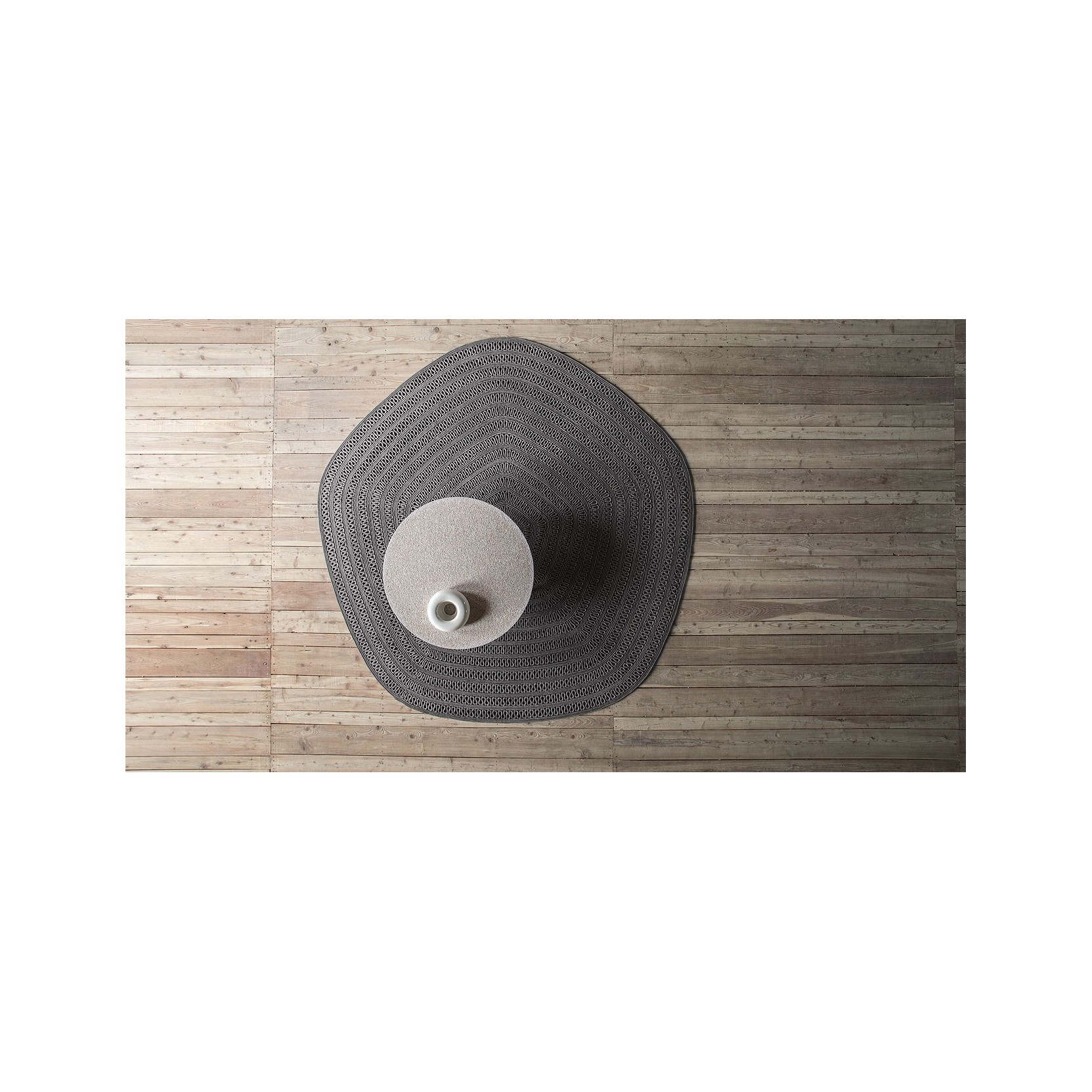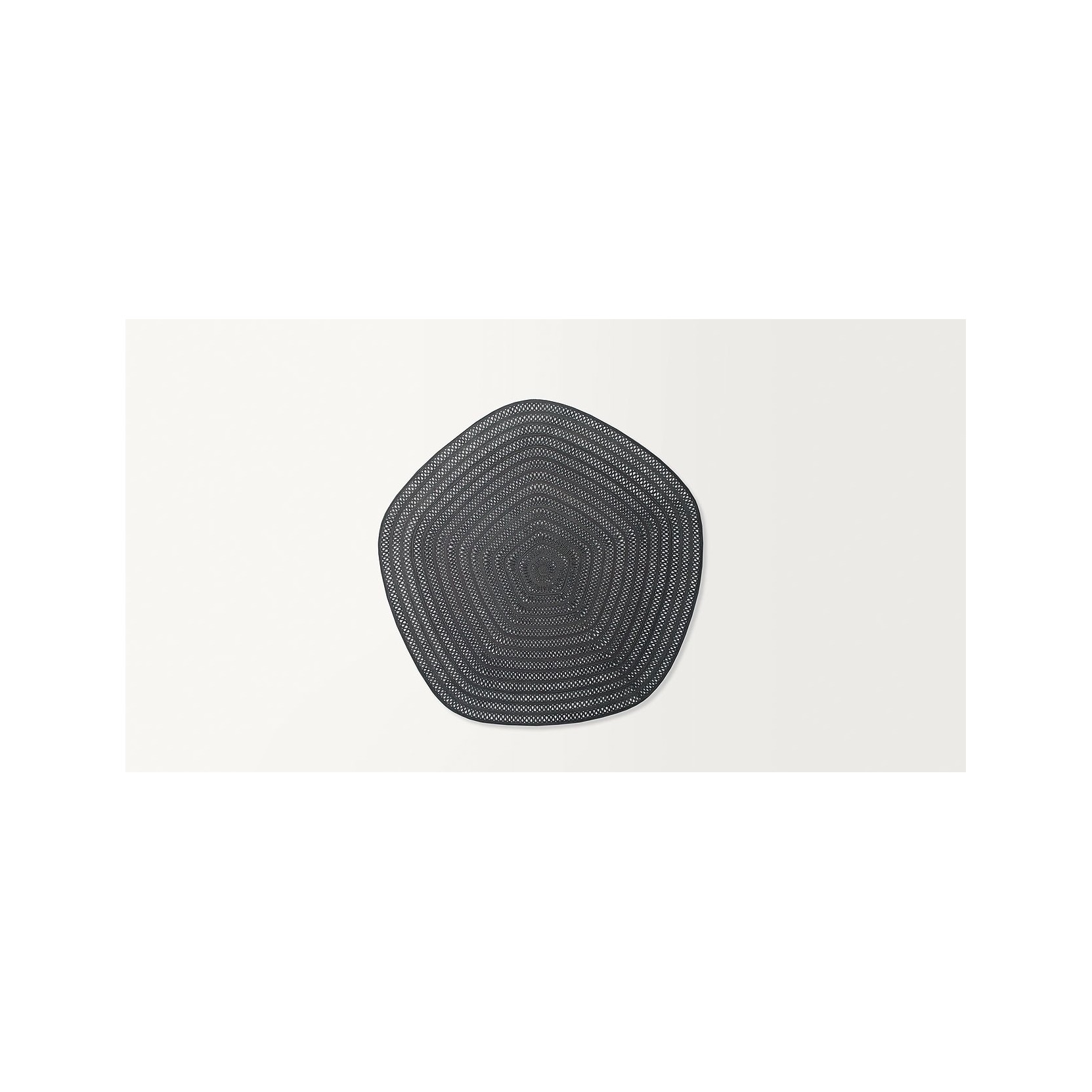 The open spaces between modules reveal glimpses of the floor beneath, creating a dynamic play of light and shadow. Shang comes in three versions: the first features a sequence of decorative round modules with a 70 cm diameter arranged in an alternating geometric pattern; the second and third are composed of a single decorative module, either round or pentagonal. Each version is available in one selected color. Due to the nature of the materials and craftsmanship, Shang is not recommended for high-traffic areas.
