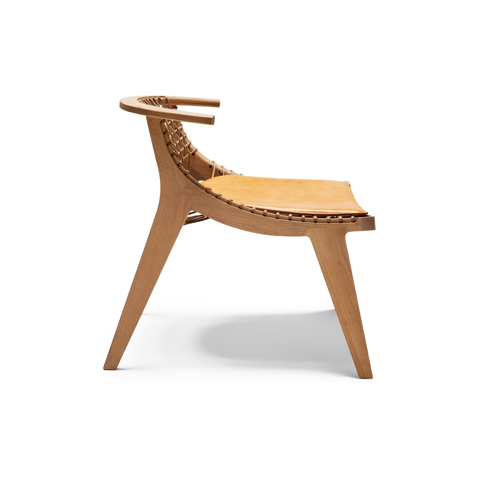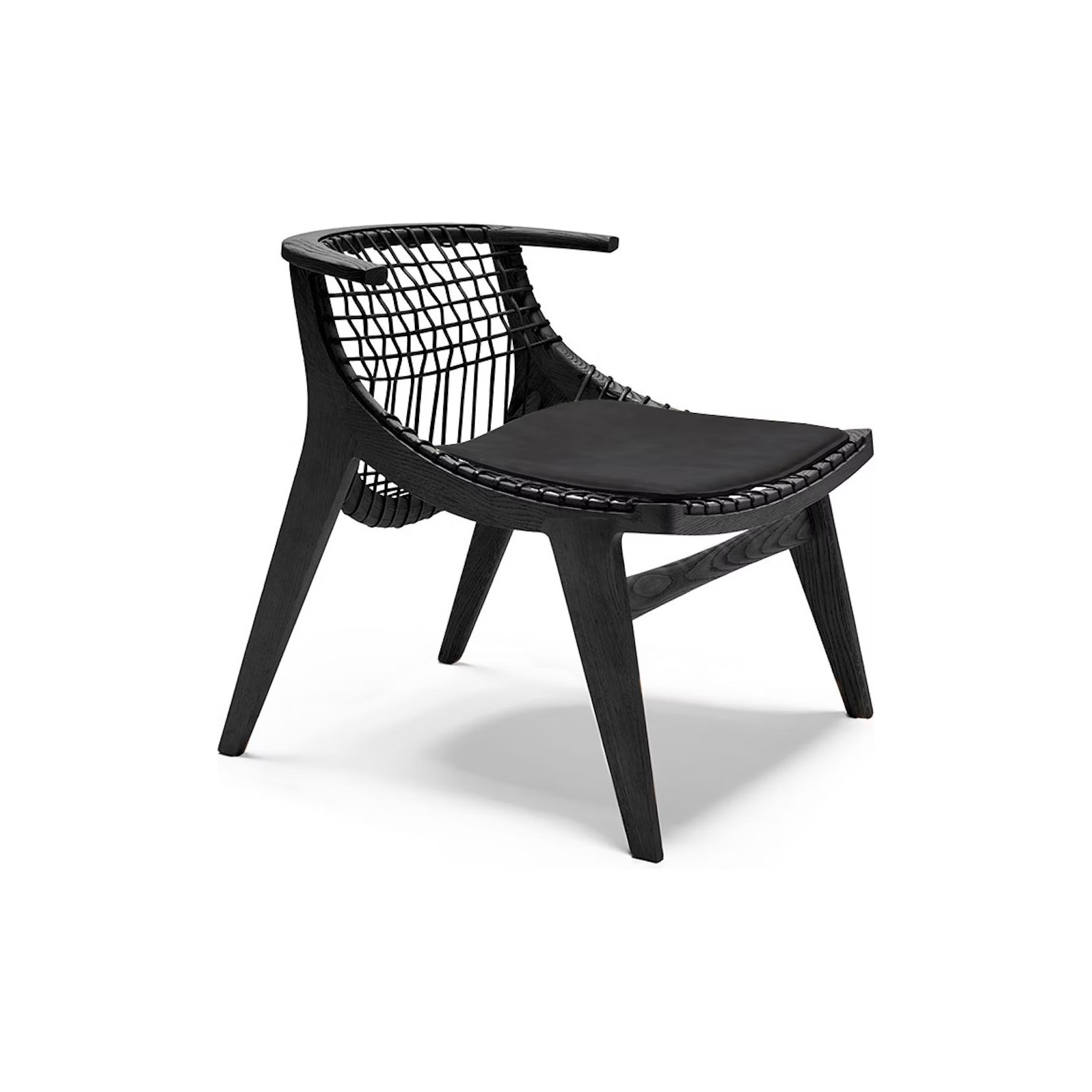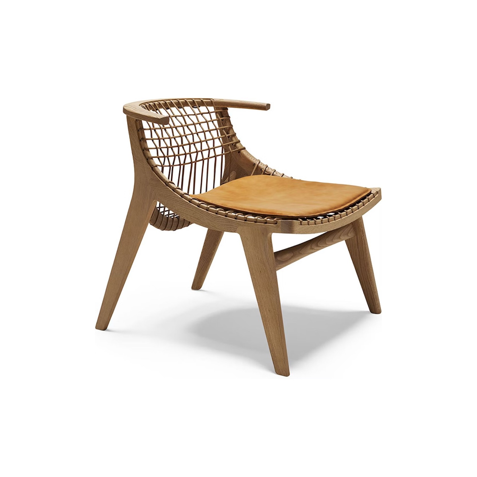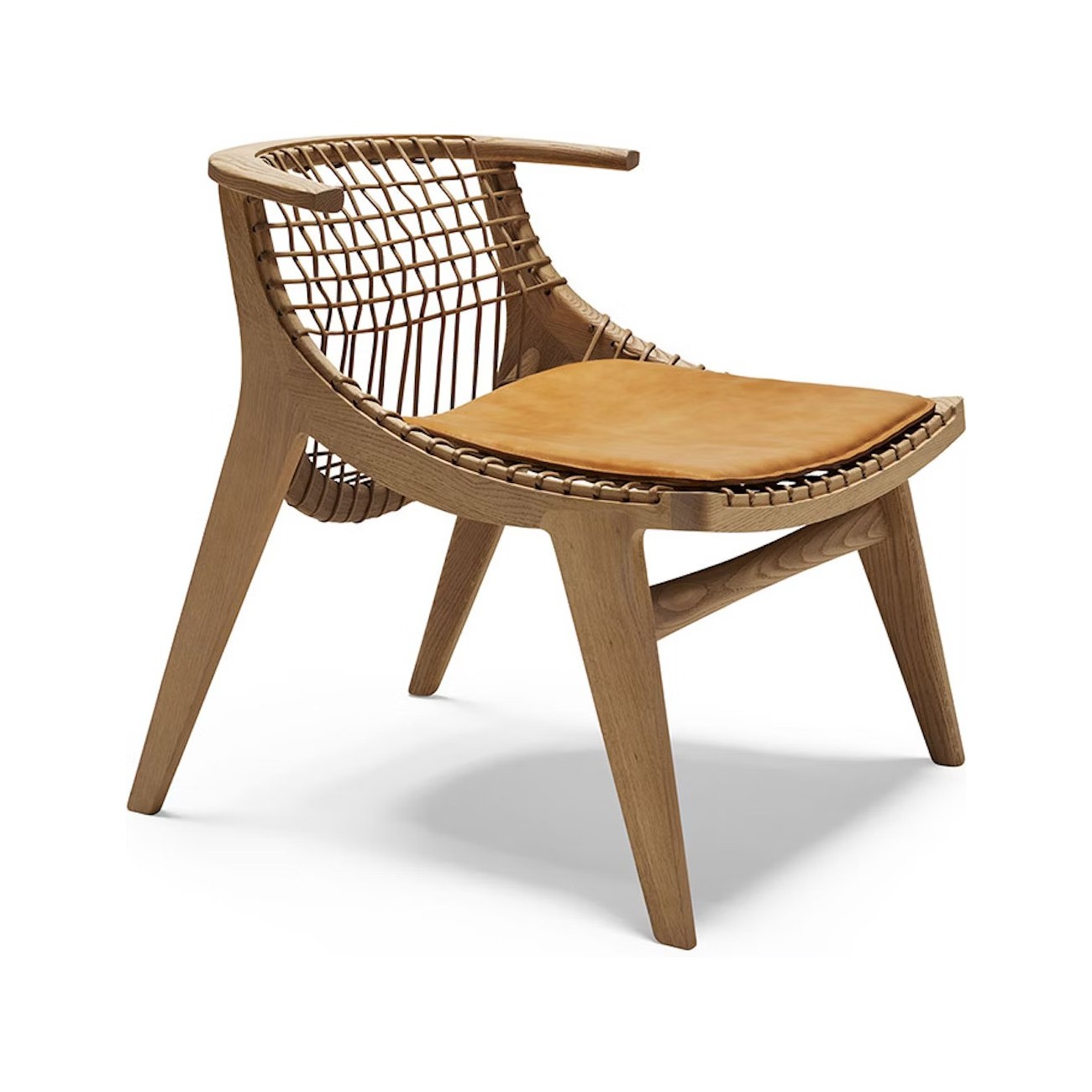 A curved wooden frame supports the distinctive woven cord, while a removable leather cushion enhances comfort and versatility. The result is a refined balance of artisanal tradition and modern simplicity.