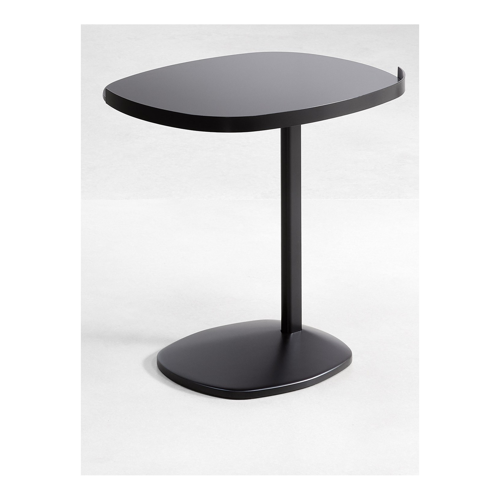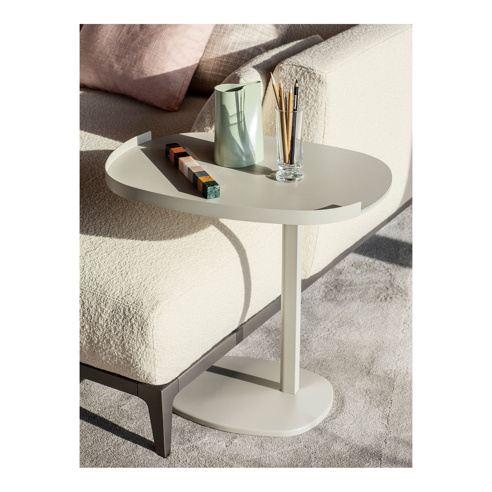 The Victoria side table, designed by Emanuela Garbin in 2021, is a lightweight and minimalist piece crafted from metal, available in anodic bronze, white, matte bronzed, black, and greige finishes.