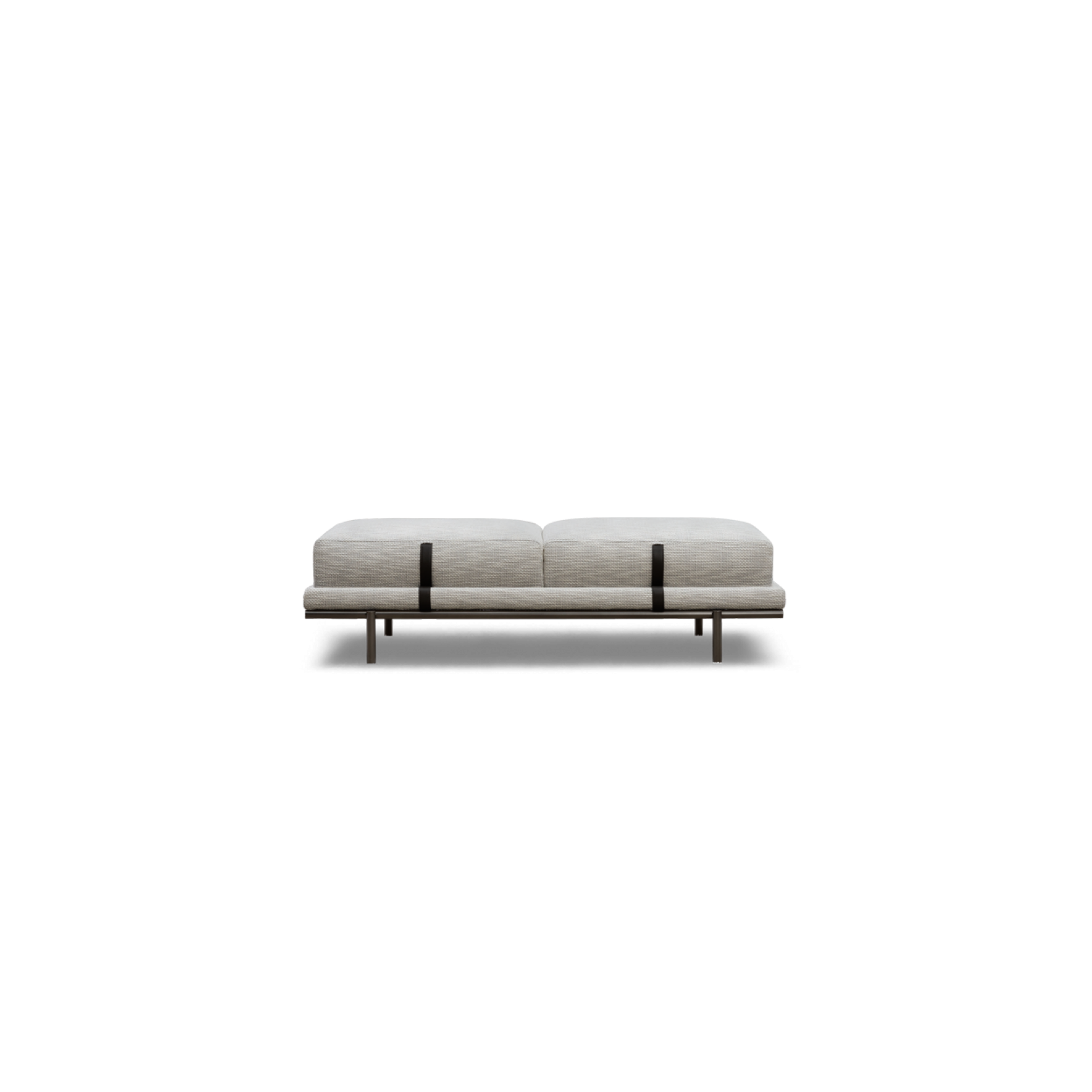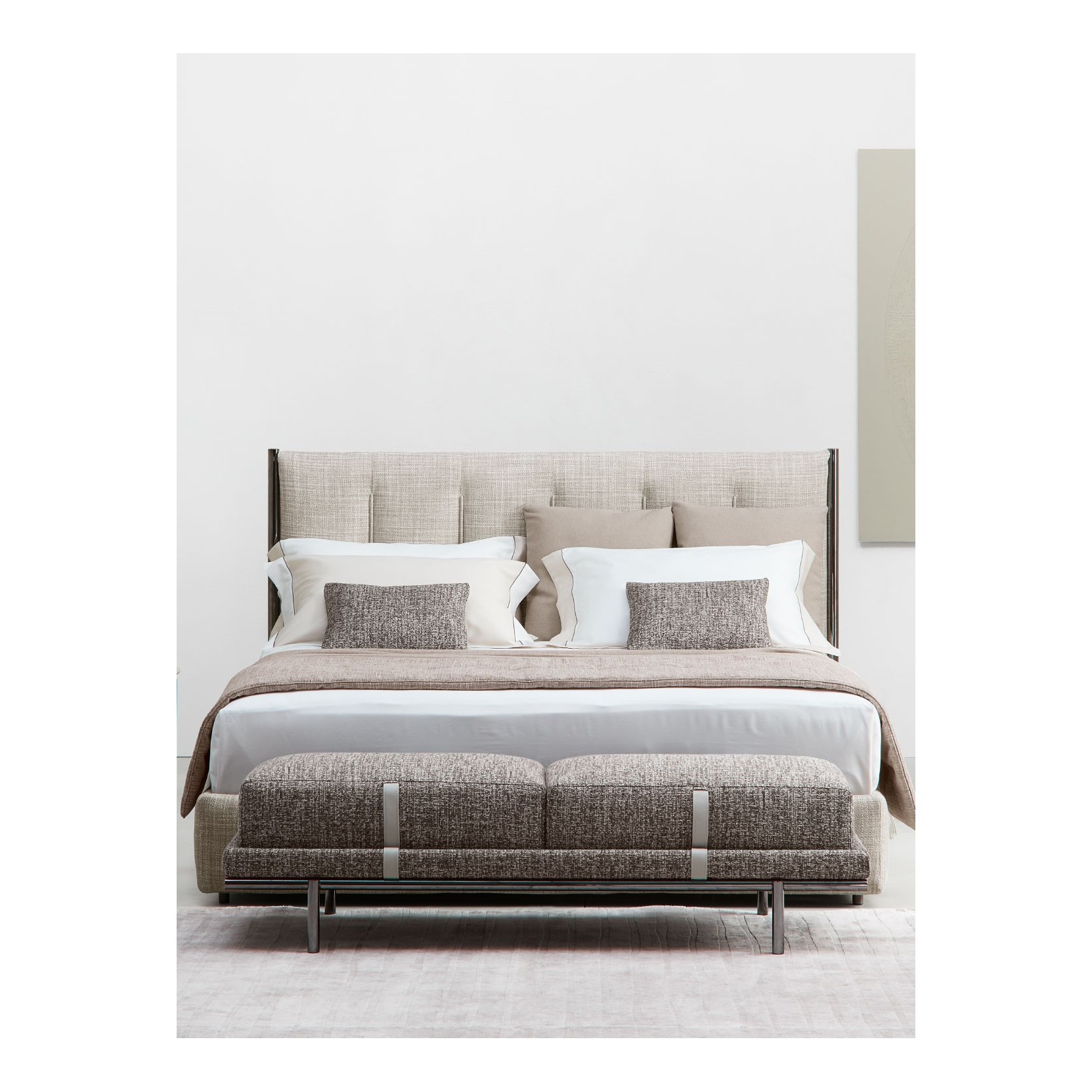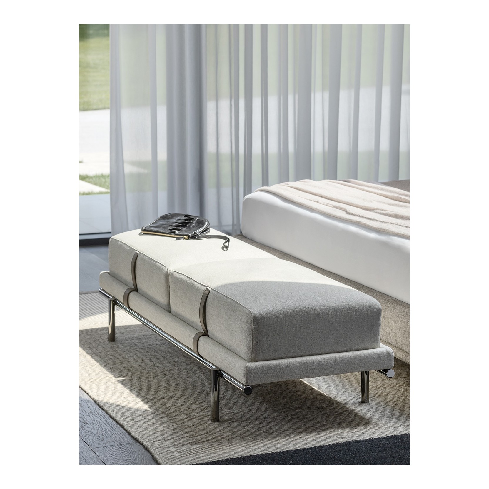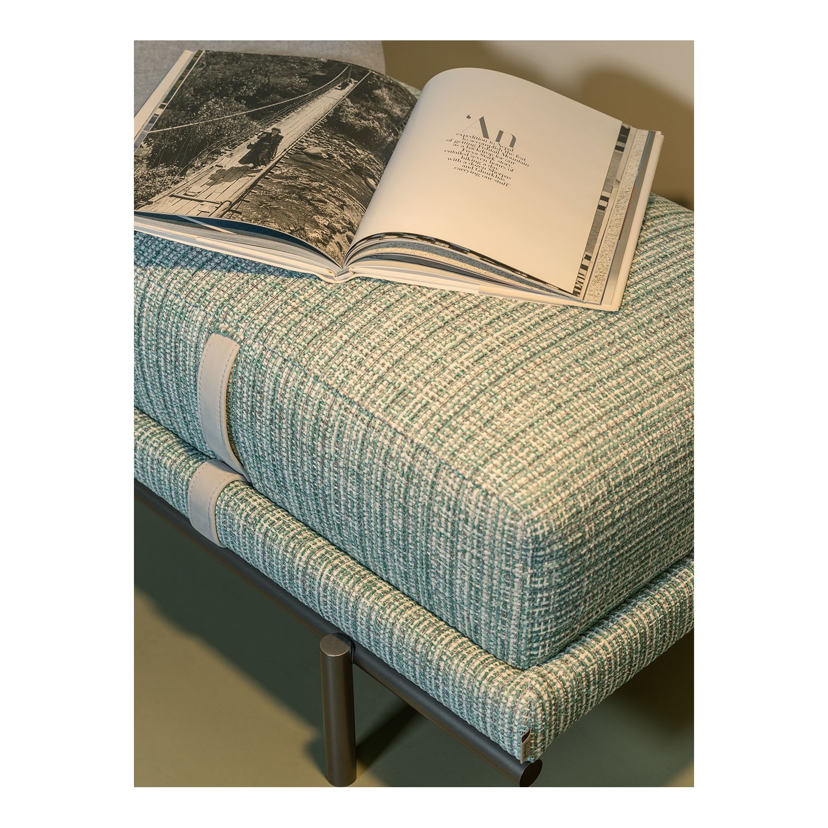 The New Bond bench, designed by Matteo Nunziati in 2019, showcases Flou’s sartorial excellence in the craftsmanship of fabrics and leathers, combining elegance with functionality.