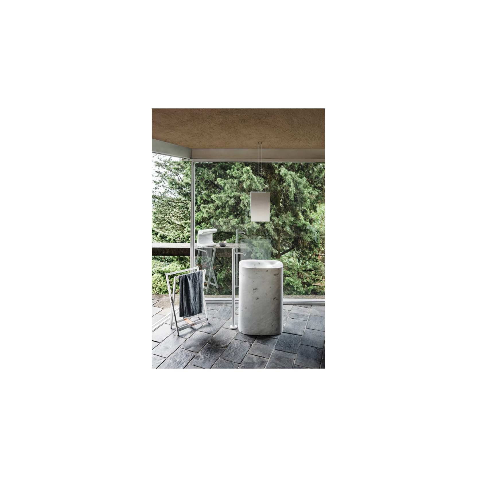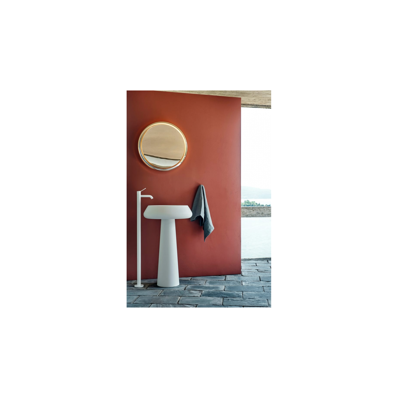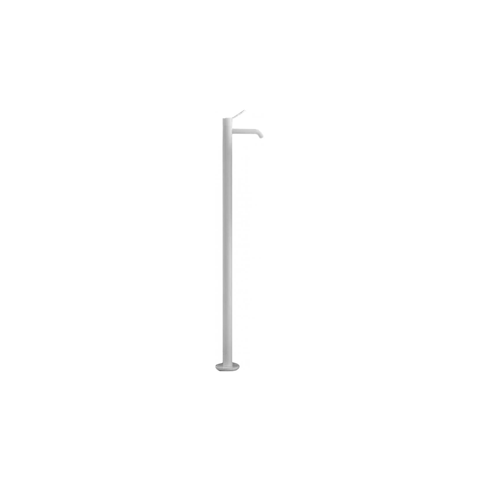 The Fez 2 floor‑mounted basin mixer is a single‑flow‑hole tap in brass, installed on a floor‑mount body that rises directly from the floor finish, typically about 118 cm high and 22 cm wide, designed for standard floor‑feed plumbing. It comes in finishes such as shiny chrome, matt white (RAL9003) and matt black (RAL9005), with customization options on request, featuring a single‑lever control without an overflow handle, regulating temperature and flow continuously. The tap uses a ceramic‑disc cartridge for precise, smooth adjustment and includes flexible supply hoses routed inside the floor body for a tidy, concealed setup. The Fez 2 family includes wall‑mounted basin, bidet, bathtub and shower units, so this floor‑mounted mixer can be matched with other Fez 2 taps to create a consistent, minimalist bathroom design with a clear, recognizable identity.