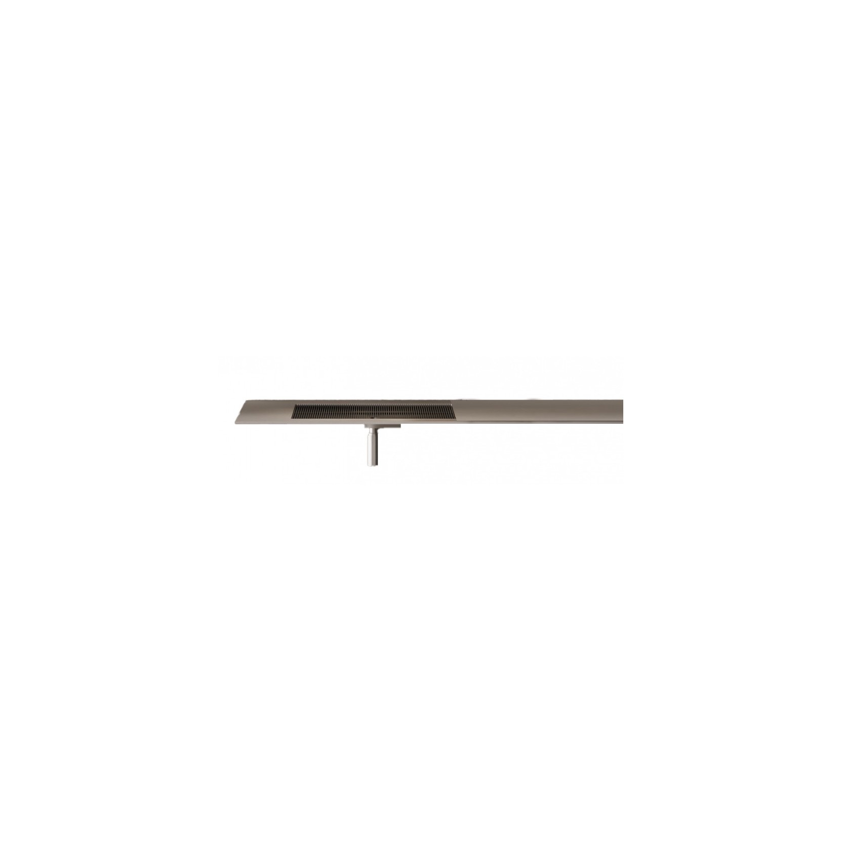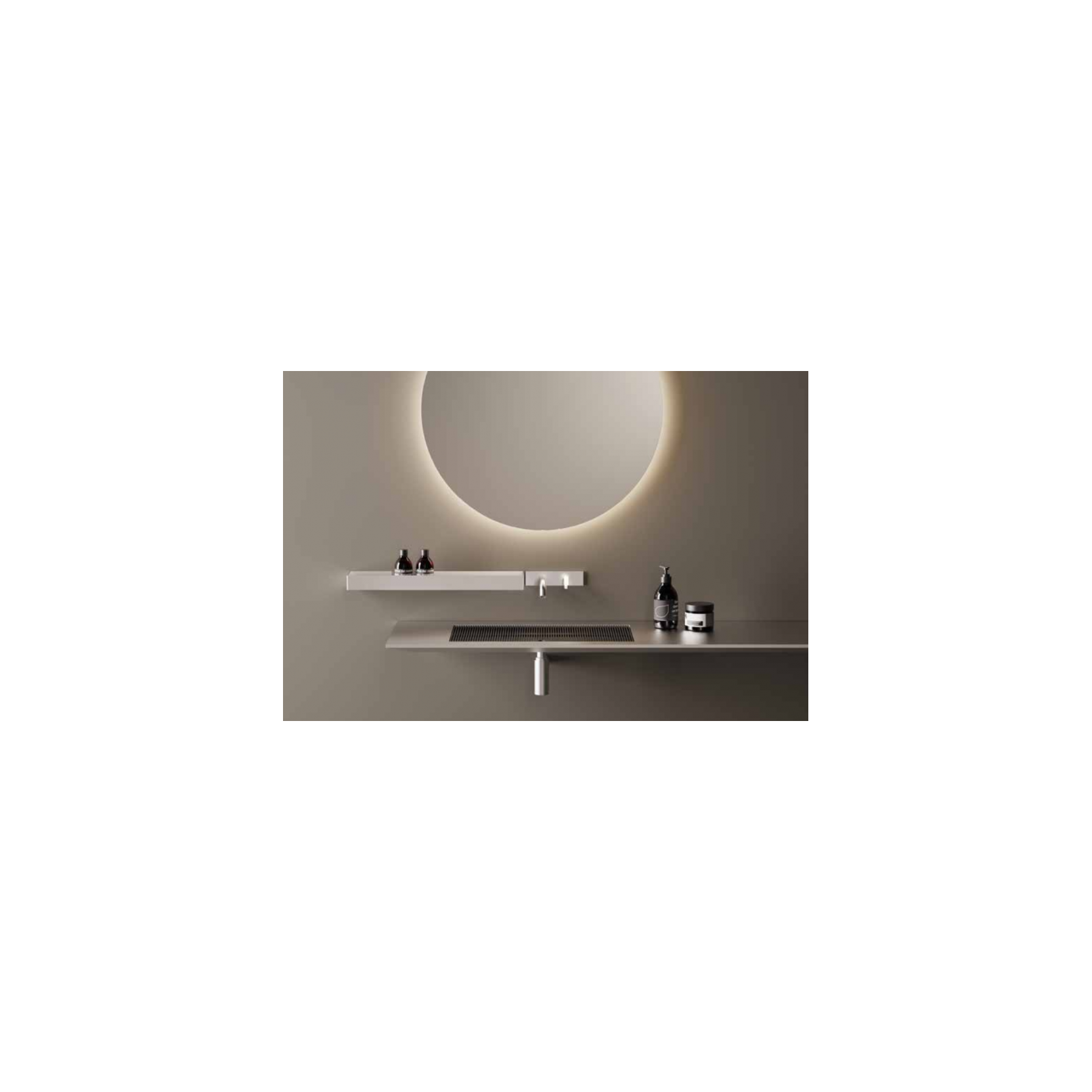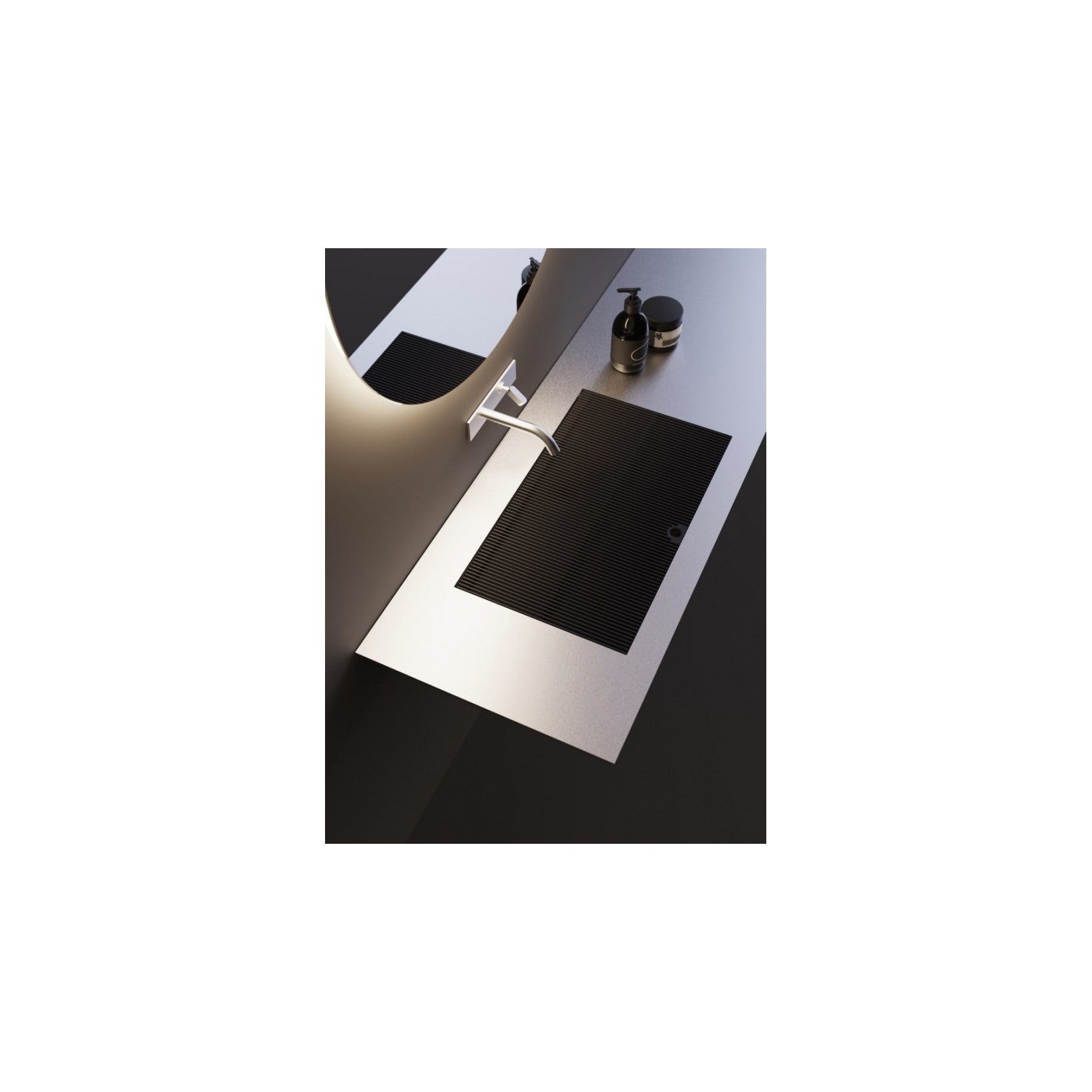 Ell Inox is a wall‑mounted counter‑basin by Benedini Associati, Andrés Jost and Diego Cisi for Agape, with a very thin stainless‑steel top and a single 60 cm basin embedded in it via a dark Corian® grid. The metal surface is brushed and floaty, the basin is shallow, and the unit is supported by brackets on the wall, so it reads like a light, luminous stripe along the bathroom wall.