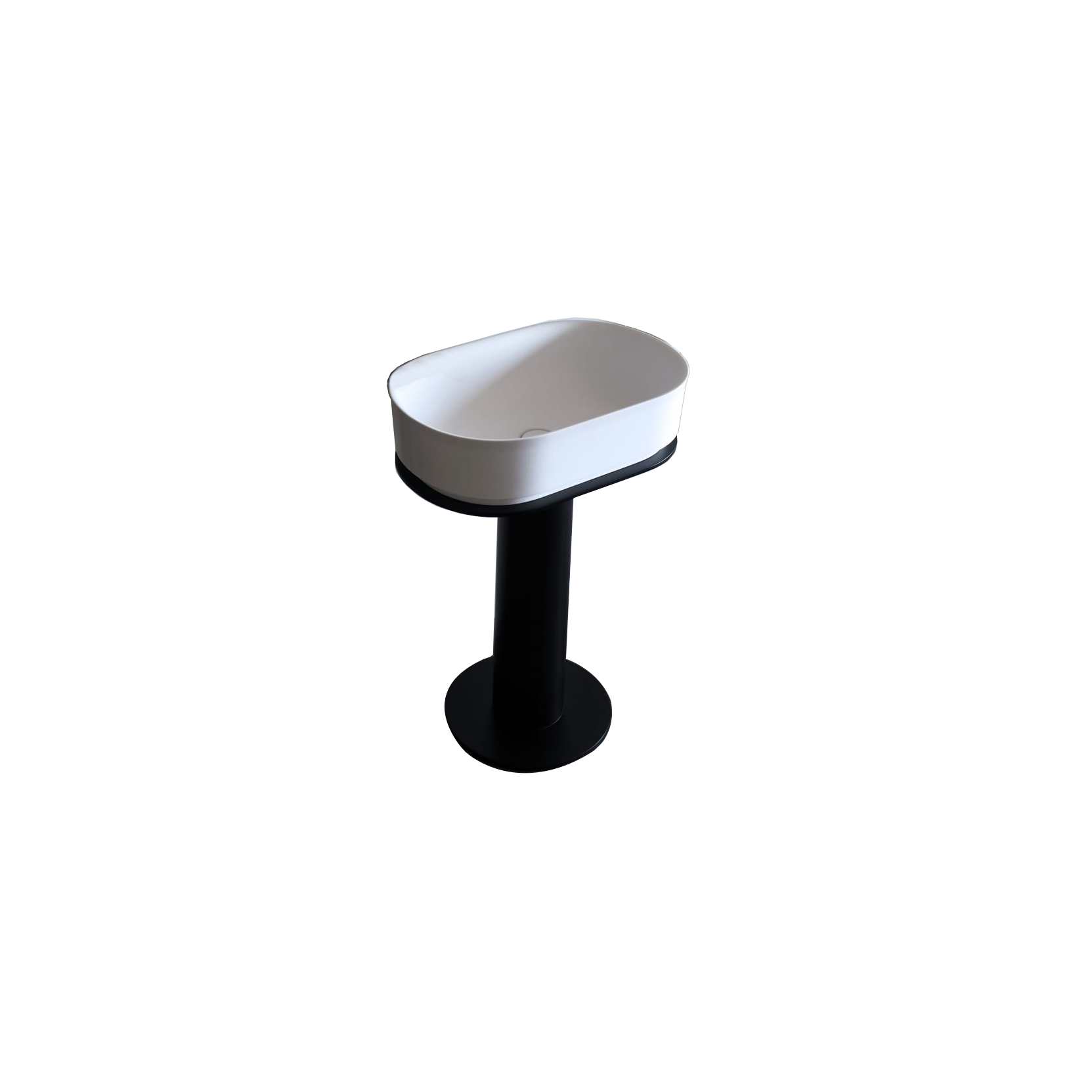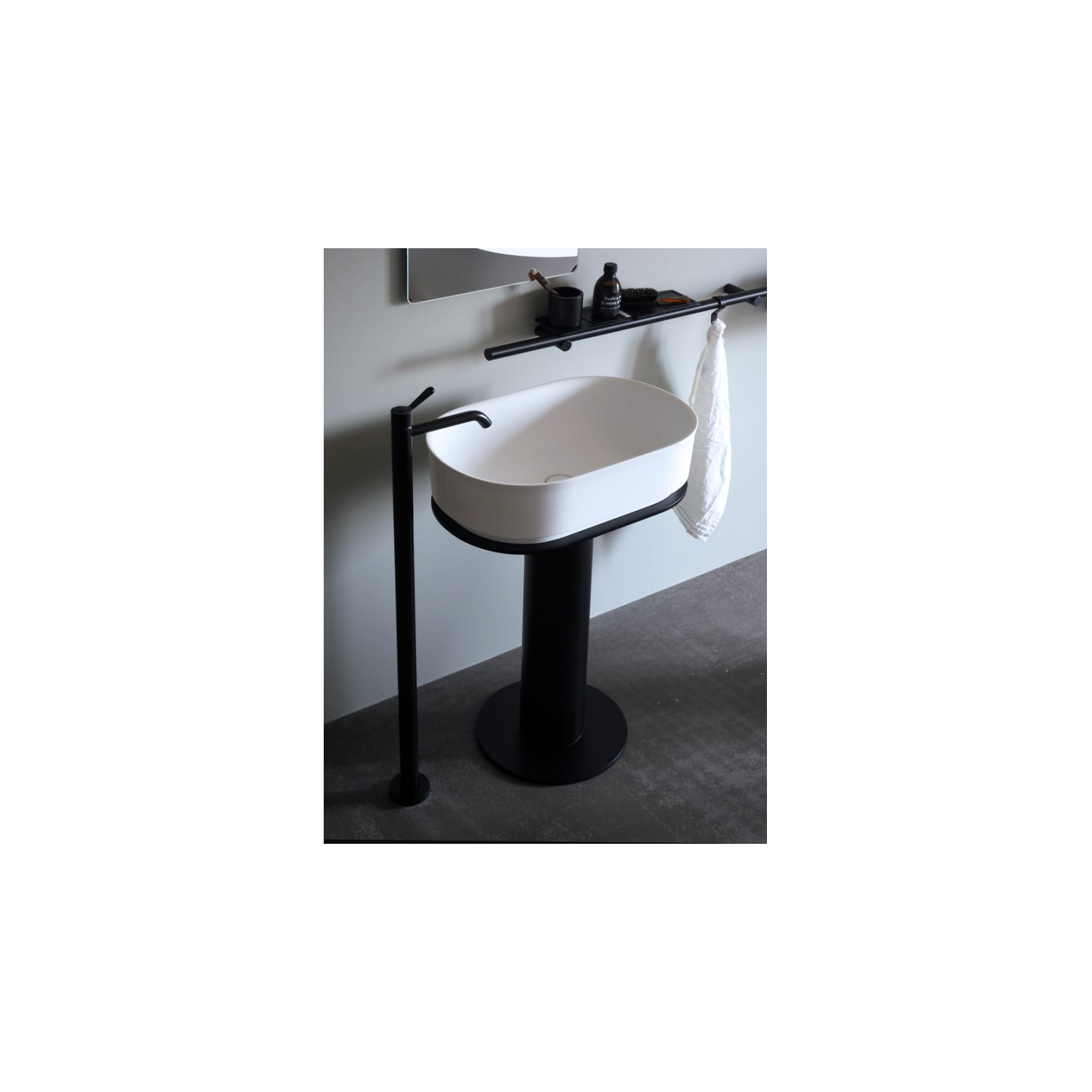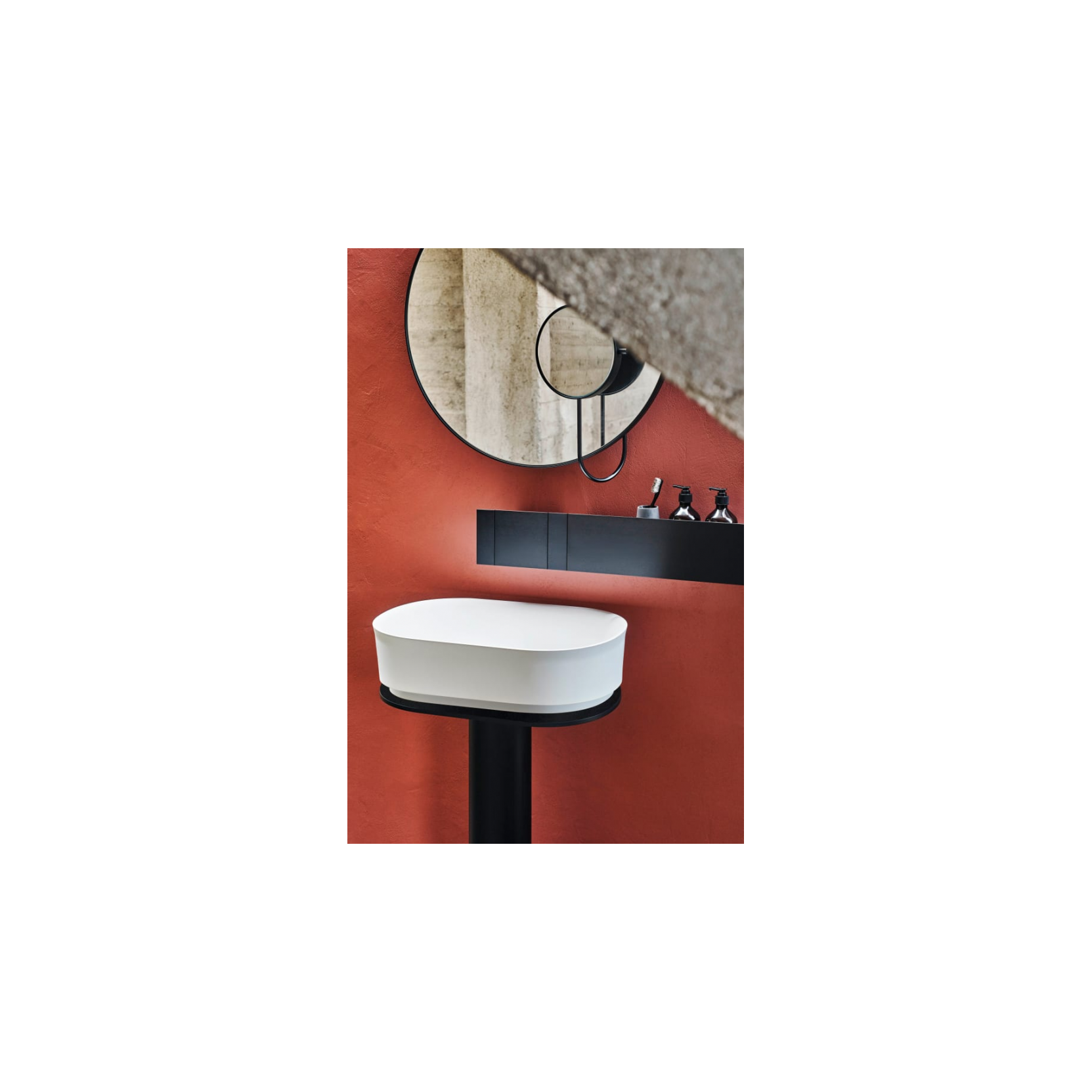 Immersion column is an oval basin by Neri&Hu for Agape, sitting on a slim black metal pedestal that recalls traditional Japanese and Chinese wooden tubs. It comes in Cristalplant® (white or white/grey) or marble, with no tap holes and a free drain, and fits well in small bathrooms and hotel interiors where space is tight but impact is high.