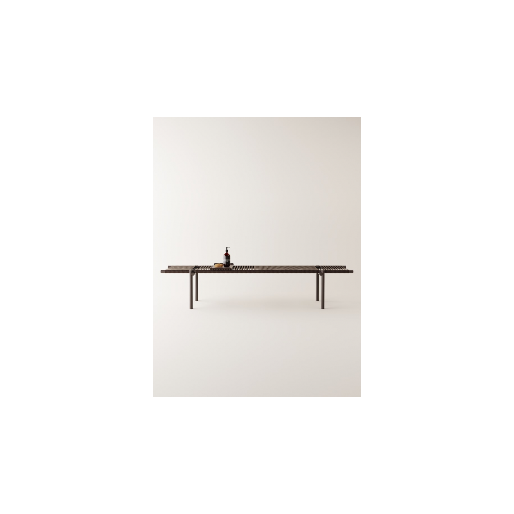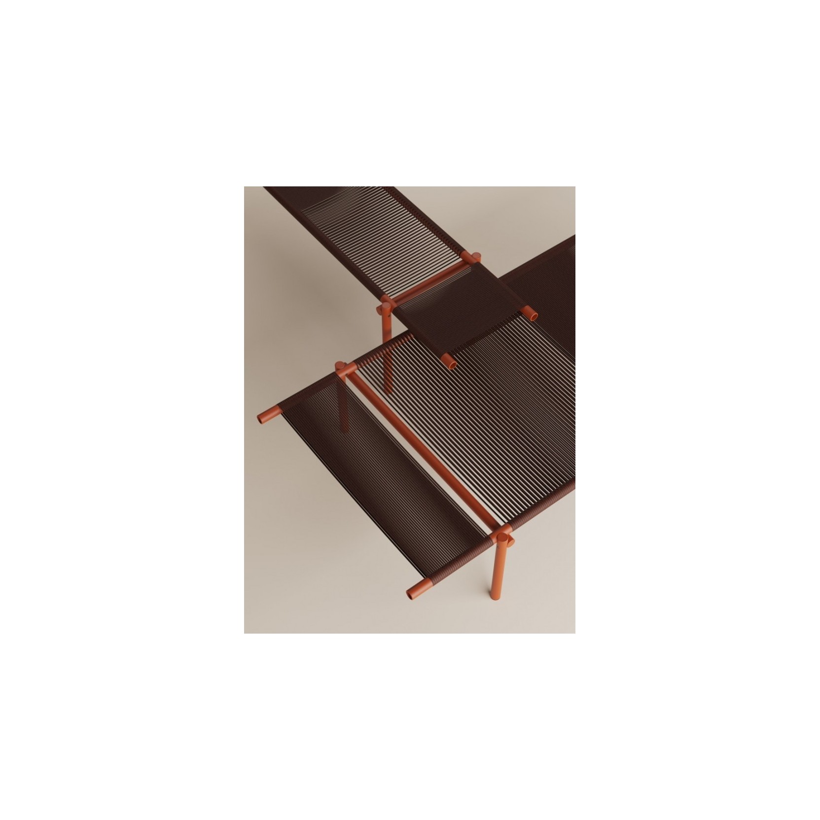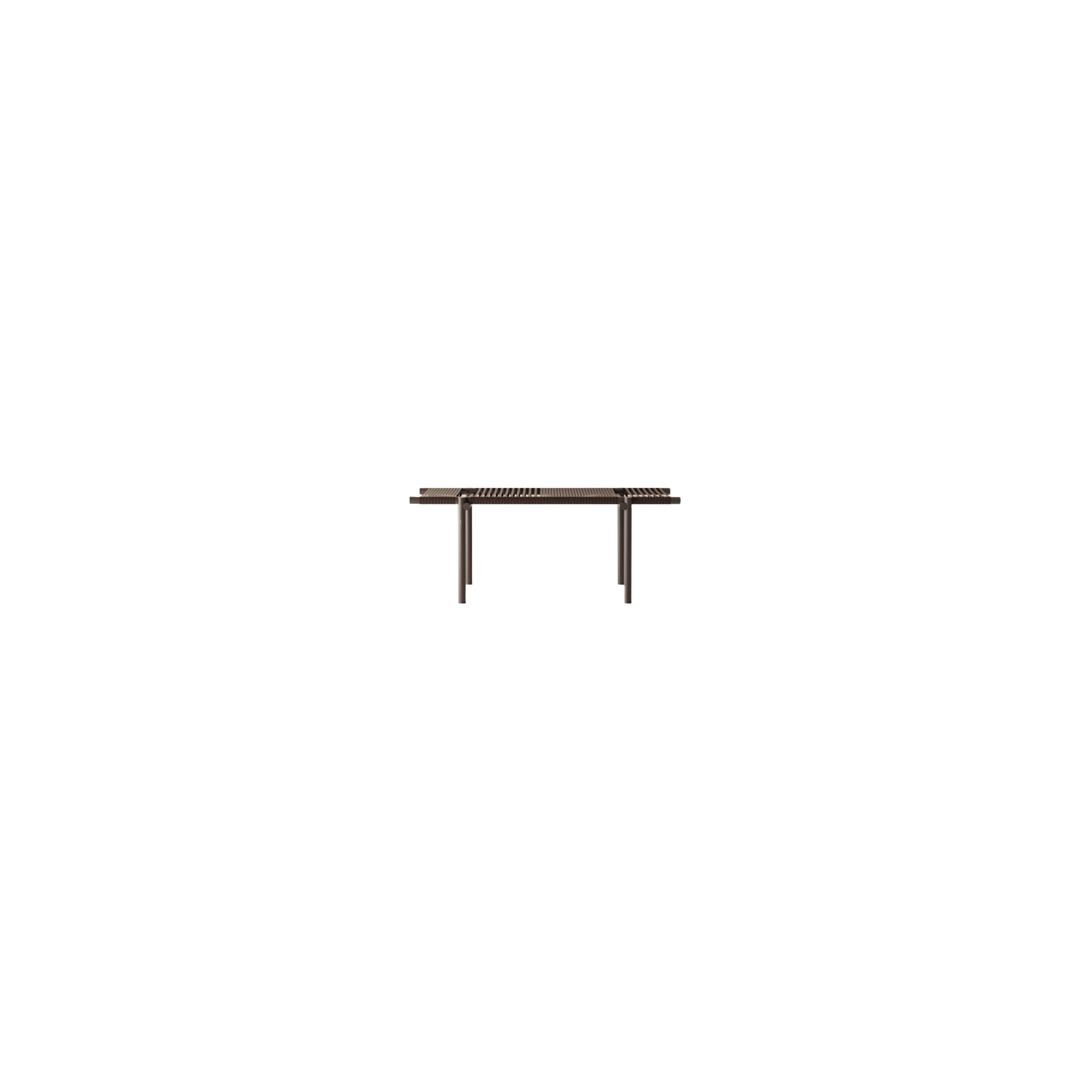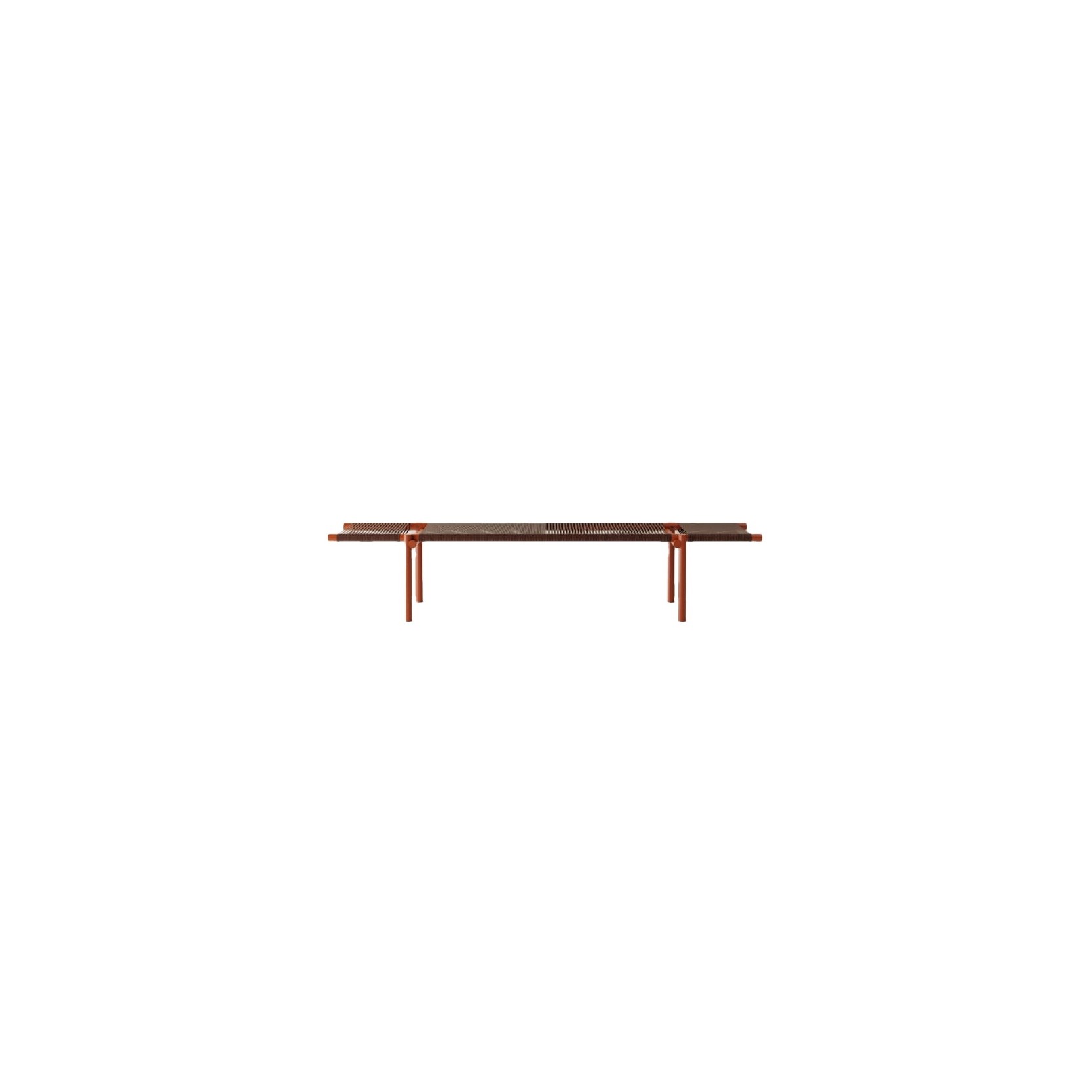 Rendez‑vous is a bench‑daybed by Marco Carini for Agape, with a frame in recycled aluminium coloured brick‑red or dark brown and a top made of hand‑woven cork strips that feel warm and soft. It comes in different heights and in a main size of 180×77×36 cm, designed to be used individually or layered for custom seating arrangements beside baths, showers or outdoor corners.