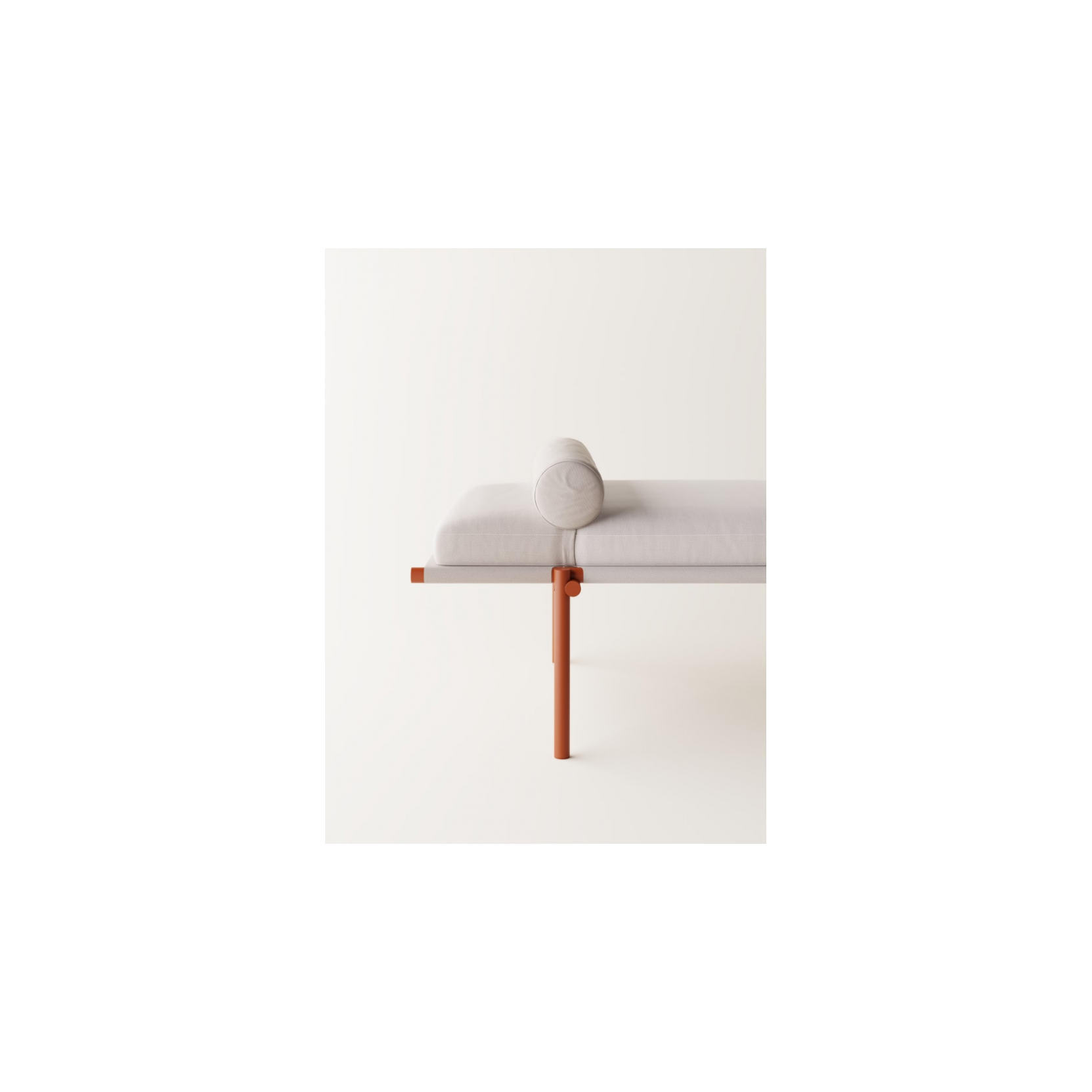 Rendez-vous is a project that explores the concept of modularity and rhythm through furnishing micro-architectures, introducing sustainable and circular materials like cork into the world of the bathroom. The aesthetic lightness and functional versatility define the system: the benches, made in three different heights, can be used individually as seating or surfaces, or stacked to create dynamic, three-dimensional compositions. The daybed enriches the collection by integrating a hemp fabric mattress and cushion, which enhance its appeal for relaxation. The choice of painted aluminum for the frame ensures durability and lightness, making Rendez-vous a piece of furniture suitable even for humid environments or outdoors, capable of transforming the bathroom into a true wellness space dedicated to self-care.