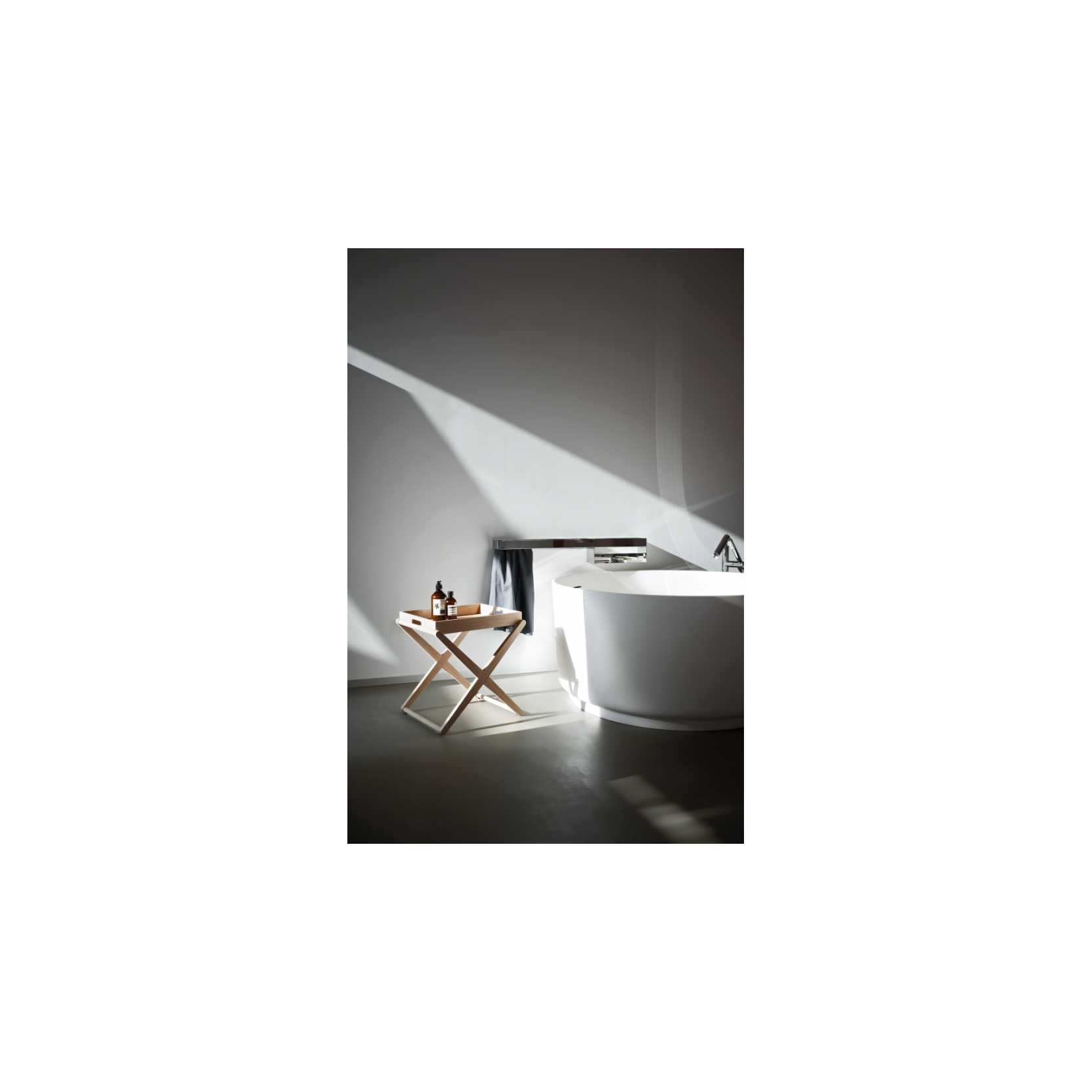 X, designed by Benedini Associati for Agape, is an extremely versatile piece of furniture that interprets the concept of a "valet stand" in a modern and functional way. It features a wooden structure available in two heights (low at 49.3 cm or high at 70 cm), completed by a removable tray that transforms the item into a practical side table or storage compartment. Without the tray, the high version can function as an elegant towel holder. It is made in various finishes: oak (natural, brown, dark), teak-stained, or lacquered in white or grey, adapting with style to different environments.