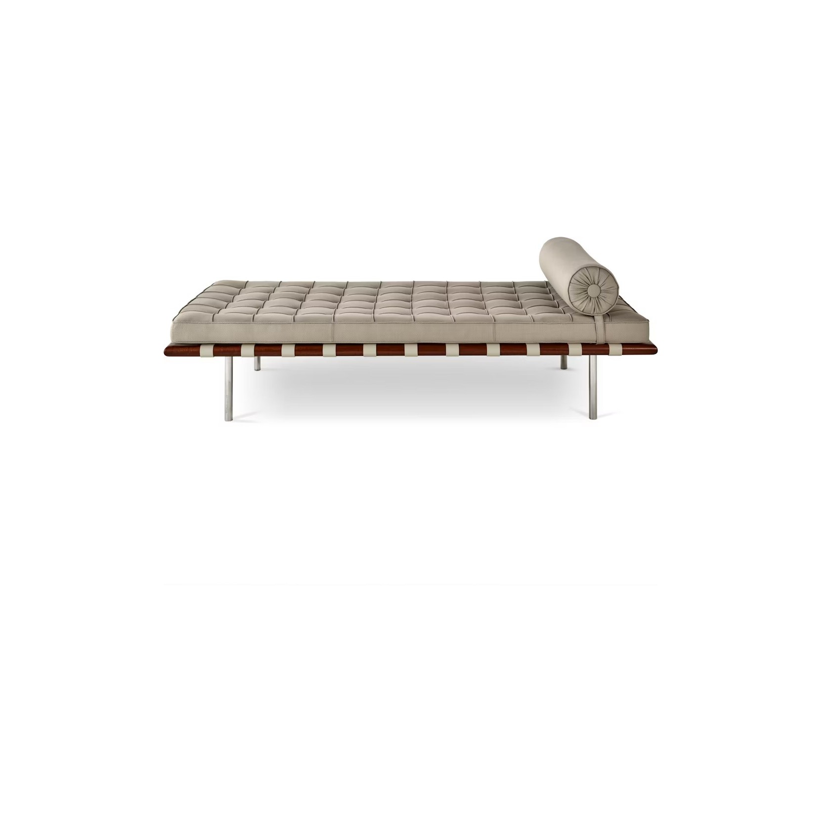 The individually welted and hand-tufted upholstery squares, together with the matching cylindrical bolster in leather or fabric, make each piece a celebration of the union between modern design, exceptional craftsmanship, and meticulous attention to detail. Available in leather, suede, or fabric, with polished or ultra-matte onyx legs, the sommier is made with 72 individually crafted squares, all cut from a single hide in the leather version. Belting leather straps, with edges dyed to match, are stretched over rubber webbing to support the cushion. Each Barcelona Sommier bears the Knoll logo and the designer’s signature stamped on the frame, ensuring authenticity and timeless value.