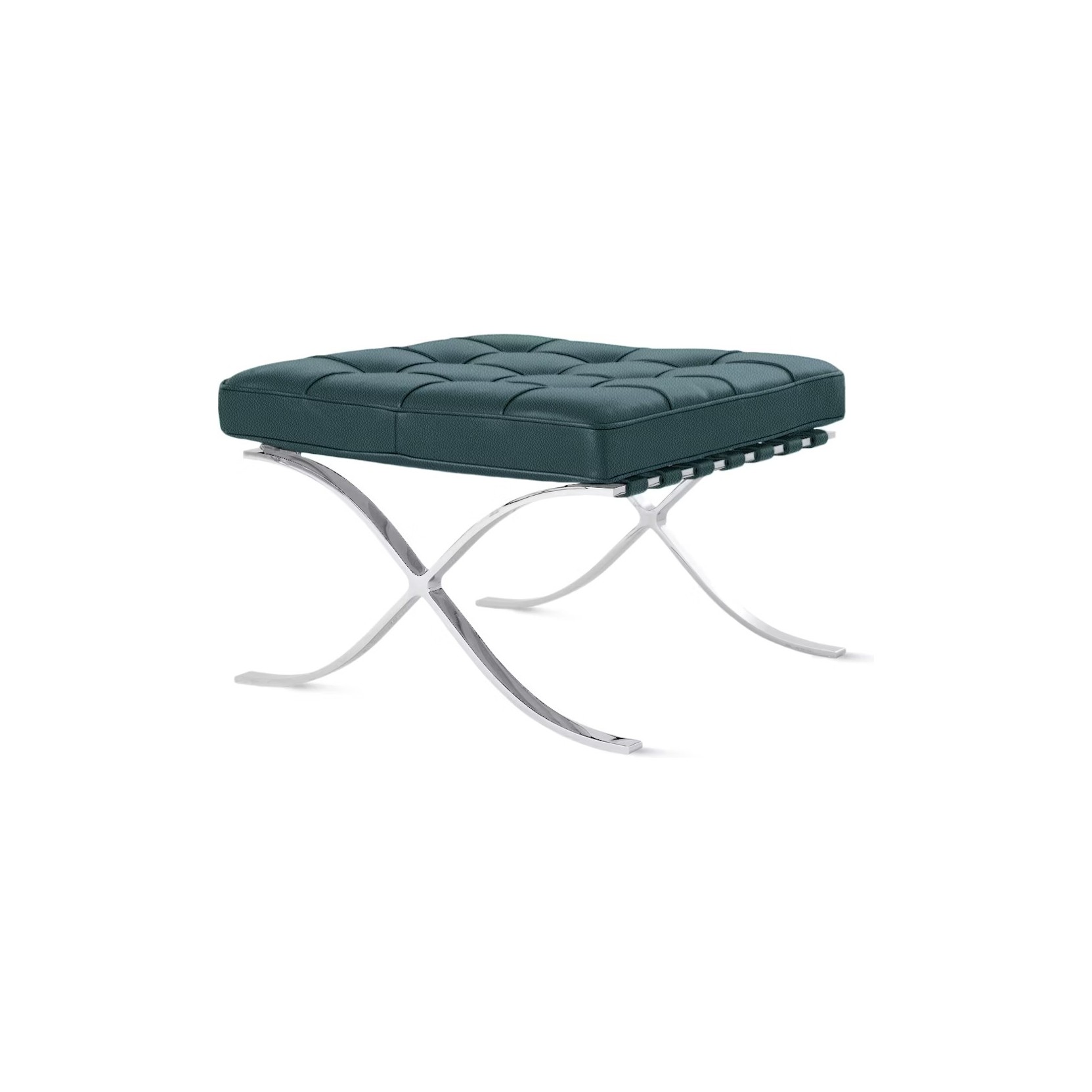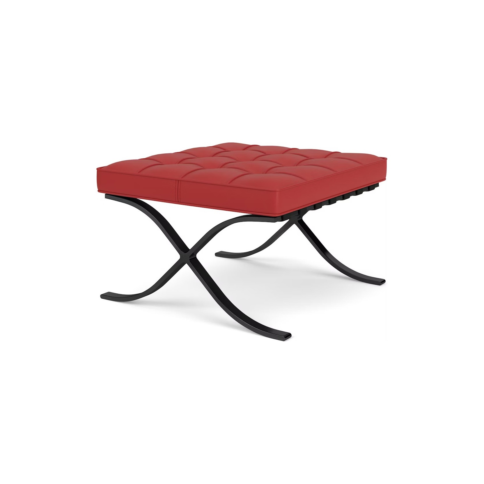 The pouf features a cross-shaped steel frame available in polished chrome or ultra-matte onyx, supporting a cushion meticulously handcrafted from sixteen individual squares of leather, suede, or fabric, each welted and tufted with buttons to highlight artisanal precision. In the leather version, all squares are cut from a single hide to ensure consistency of texture and tone. The cushion is secured to the frame with belting leather straps whose edges are hand-dyed to match, combining durability with aesthetic harmony. The frame bears the Knoll logo and the designer’s signature, serving as a seal of authenticity and a testament to the original vision of Mies van der Rohe.