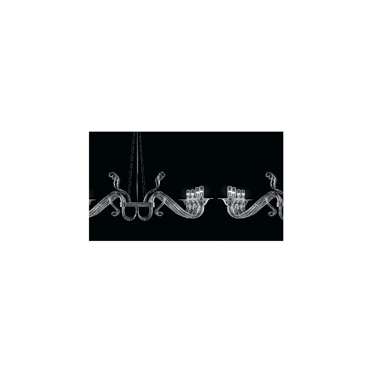 An unusual chandelier, where the arms are arranged horizontally and do not gravitate around a centre – as is usually the case. Three versions, different in number of lights, borrowing the arms from equally famous Barovier&Toso chandelier: Redon. Franco Raggi, designer of the Mood chandeliers, reinterprets some historical models from Barovier&Toso collections giving them a new shape and using modern chromed candle, tubular bulbs and electrical wires decorating the chromed fitting with a “U” shape.