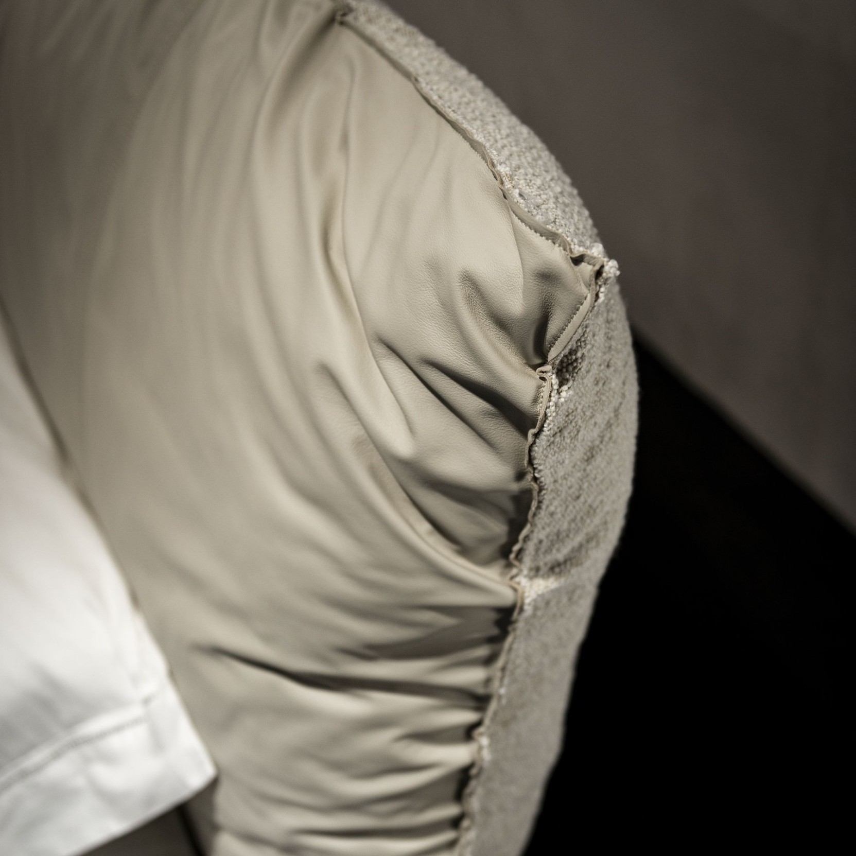 The upholstery can be uniform or, in the mix version, feature contrasting materials and colors on the front and back for a custom look. The upholstered bed frame, raised off the ground by solid ash wood feet in Canaletto walnut or burnt oak finish, echoes the headboard’s materials for a cohesive and elegant composition. A signature detail of this contemporary bed is the leather strap system that connects the headboard to the bed frame, gently shaping the fabric into soft pleats and enhancing the bed’s sense of comfort and refinement. Slatted bed base included.