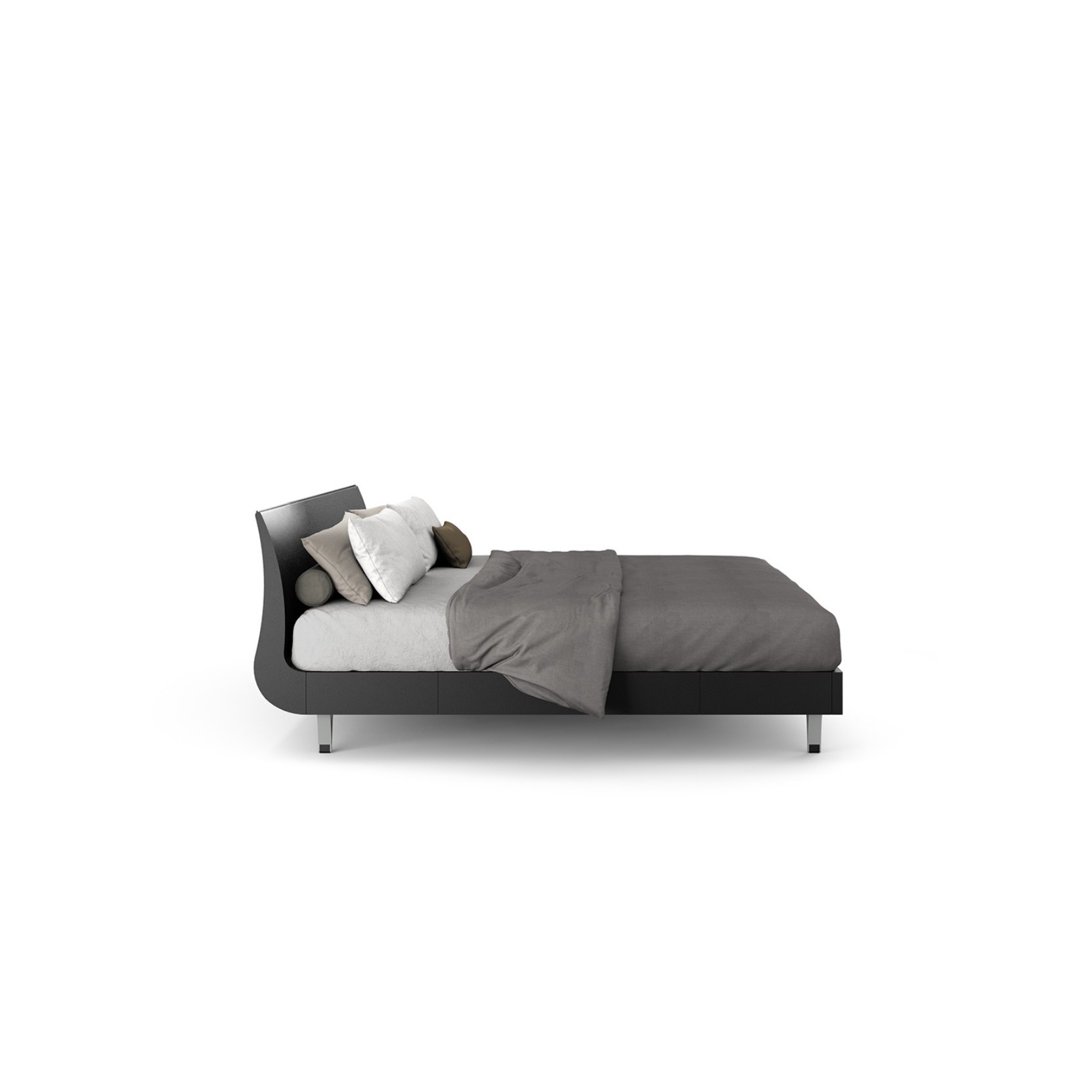 This bed takes shape as a vessel, an expanded shell, an open and hollow form, entirely clad in fine saddle leather. Like an inverted saddle, it rests on slender matt light grey epoxy-coated steel supports, evoking pure and absolute neoclassical silhouettes. Its lyre-shaped design offers a sober yet distinguished elegance, enriched by refined saddle stitching details. The headboard and side bands are crafted from a combination of solid poplar heartwood, plywood, and melamine-coated panels, joined with cylindrical dowels and traditional woodworking techniques. The padding is made of resilient, CFC-free polyurethane foam with a high density of 70 kg/m³. The leather upholstery is non-removable, highlighting the exceptional craftsmanship and meticulous attention to detail.