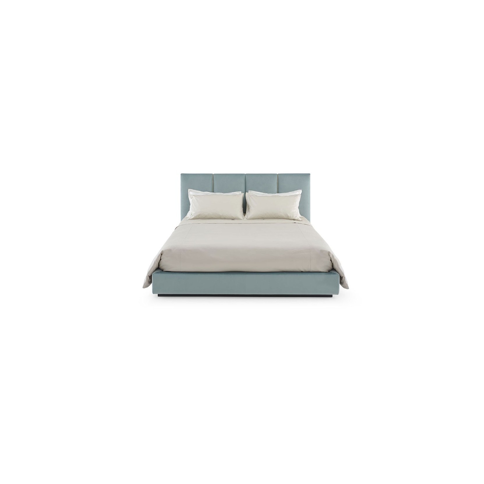 Delano is a bed where volumes, decorative identity and refined elegance blend in harmony. A solution that enhances any bedroom thanks to the large headboard with vertical quilted pattern and the steel profiles with polished brass finish. Available with matching upholstery in lake blue velvet, the bed frame is supported by a base in wenge-stained wood. The Volturno night table in lacquered wood with steel details complete the project.